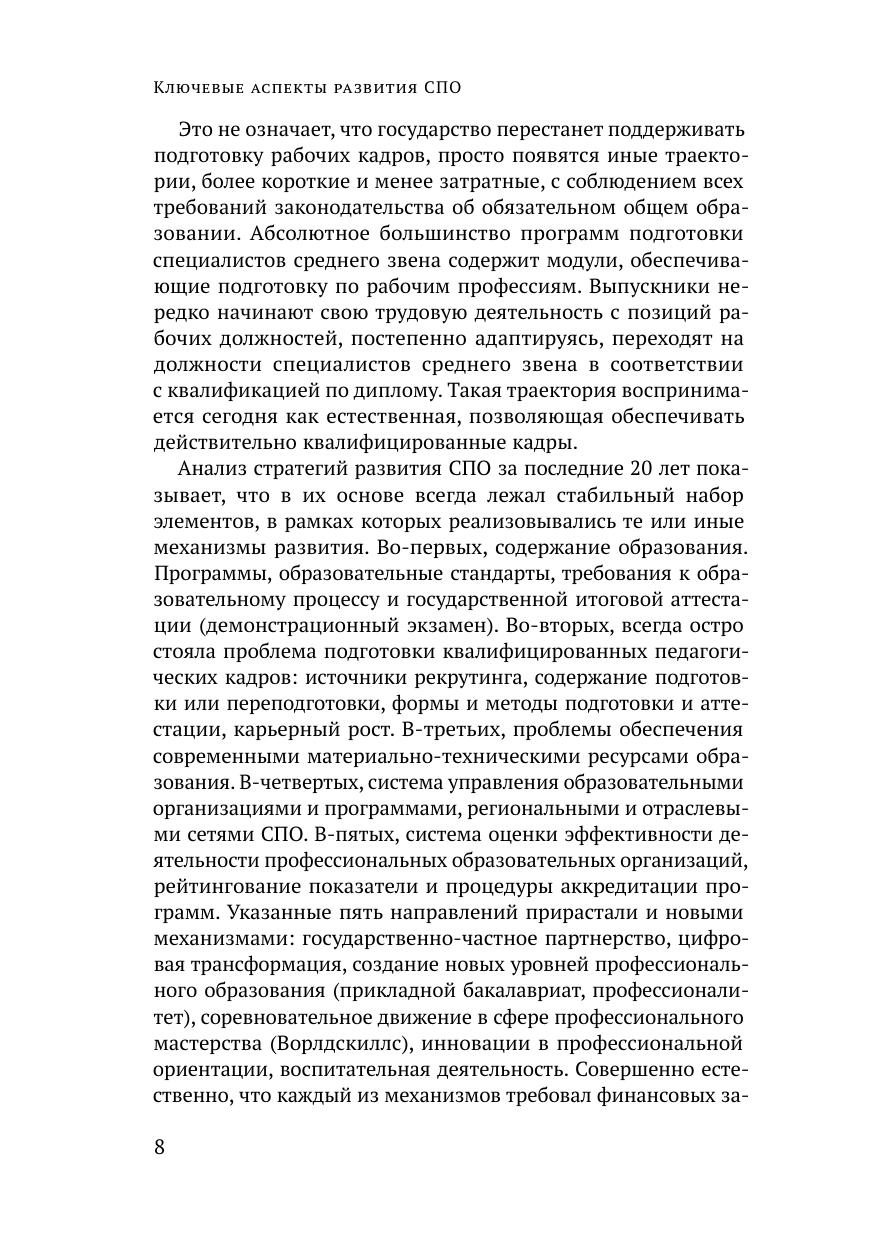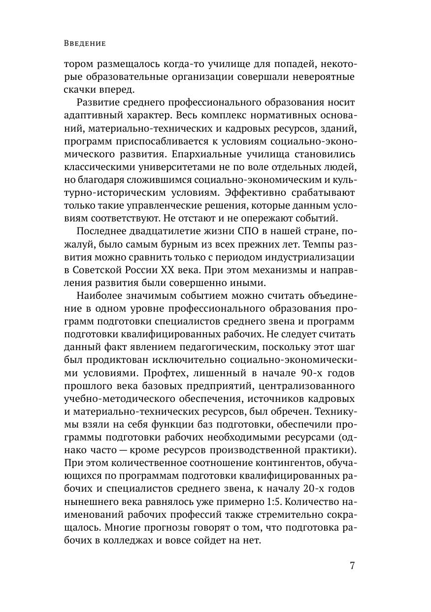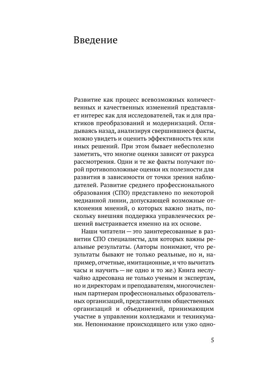 Монография обобщает и систематизирует результаты исследований коллектива Научно-исследовательского центра профессионального образования и систем квалификаций ФИРО РАНХиГС за последние пять лет (2018–2022). Авторы проследили ход изменений в нормативном правовом поле среднего профессионального образования на протяжении последних тридцати лет; представили анализ основных тенденций и направлений развития СПО, включая вопросы цифровой трансформации, профориентации и педагогического сопровождения профессионального самоопределения, воспитательной деятельности и общеобразовательной подготовки в СПО, кадрового обеспечения системы СПО и управления региональными системами профессионального образования и обучения. Издание преследует цель проблематизации ключевых тем и направлений развития современной системы СПО и адресована прежде всего научной аудитории – ученым, аспирантам и экспертам в сфере среднего профессионального образования и национальной системы квалификаций, но также может быть полезна командам управленцев профессиональных образовательных организаций и представителям органов исполнительной власти в сфере образования всех уровней. Материалы отдельных глав могут заинтересовать преподавателей и мастеров производственного обучения, работодателей и партнеров колледжей и техникумов.