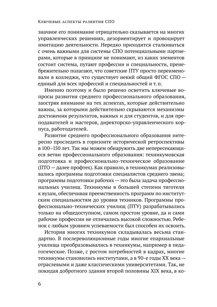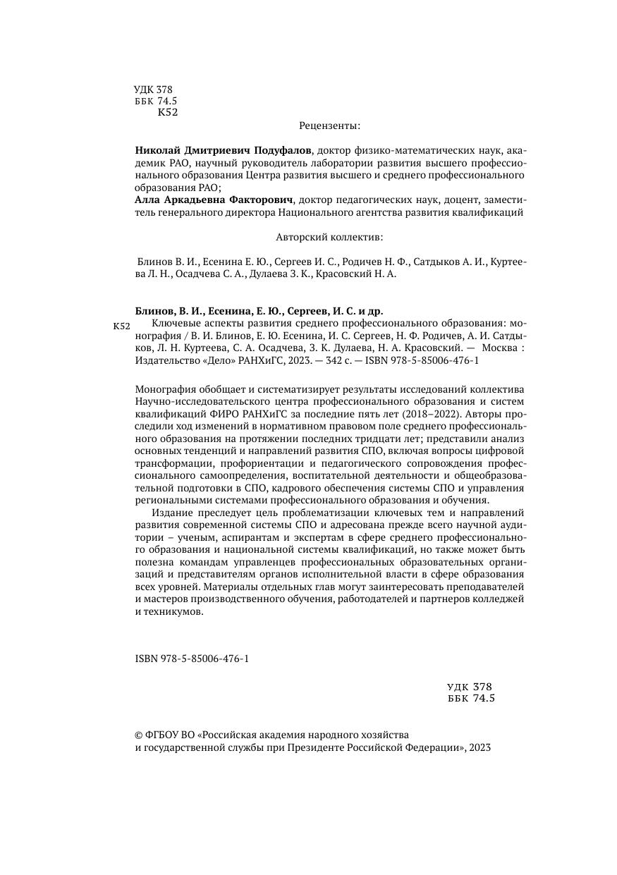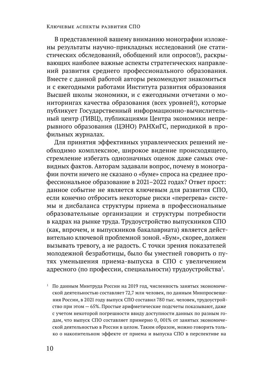Монография обобщает и систематизирует результаты исследований коллектива Научно-исследовательского центра профессионального образования и систем квалификаций ФИРО РАНХиГС за последние пять лет (2018–2022). Авторы проследили ход изменений в нормативном правовом поле среднего профессионального образования на протяжении последних тридцати лет; представили анализ основных тенденций и направлений развития СПО, включая вопросы цифровой трансформации, профориентации и педагогического сопровождения профессионального самоопределения, воспитательной деятельности и общеобразовательной подготовки в СПО, кадрового обеспечения системы СПО и управления региональными системами профессионального образования и обучения. Издание преследует цель проблематизации ключевых тем и направлений развития современной системы СПО и адресована прежде всего научной аудитории – ученым, аспирантам и экспертам в сфере среднего профессионального образования и национальной системы квалификаций, но также может быть полезна командам управленцев профессиональных образовательных организаций и представителям органов исполнительной власти в сфере образования всех уровней. Материалы отдельных глав могут заинтересовать преподавателей и мастеров производственного обучения, работодателей и партнеров колледжей и техникумов.