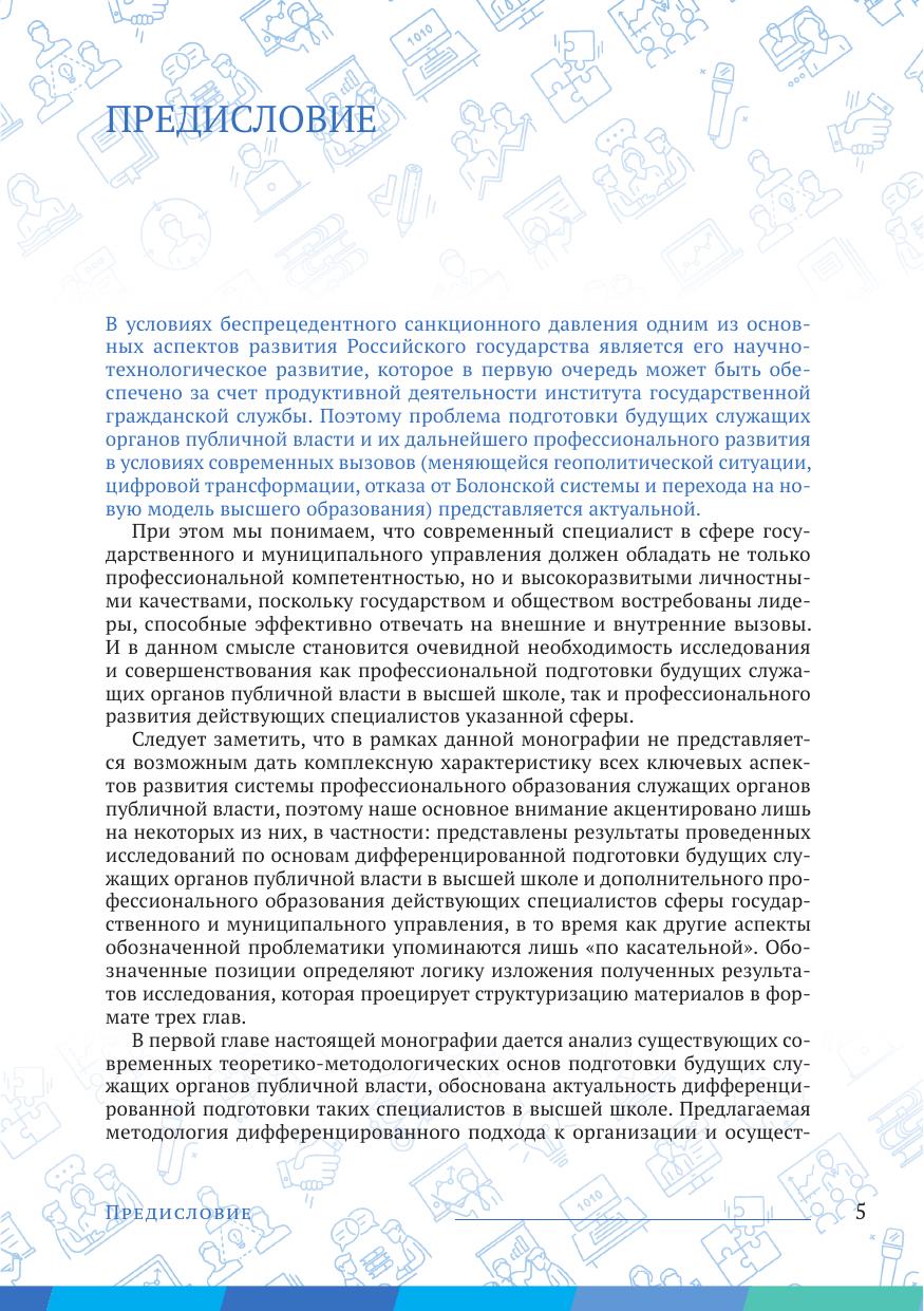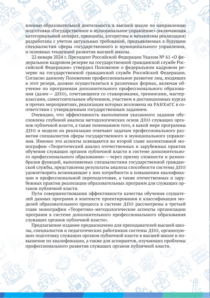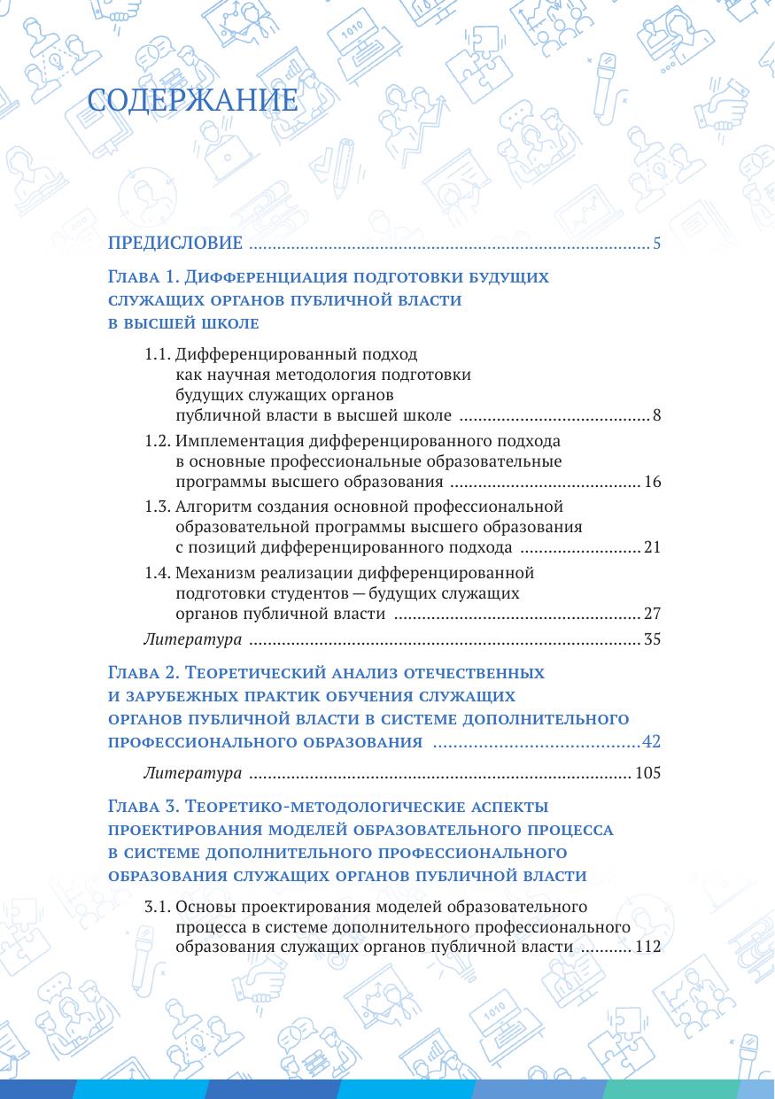 В коллективной монографии представлены результаты исследования актуальных проблем и ключевых аспектов развития системы профессионального образования служащих органов публичной власти. Первая глава посвящена исследованию современных теоретико-методологических основ дифференцированной подготовки будущих специалистов в сфере государственного управления. Актуальность изучения подходов и реализации принципов дифференциации в образовательном процессе высшей школы по направлению подготовки «Государственное и муниципальное управление», разработка и обоснование дифференцированного подхода как научной методологии подготовки будущих служащих органов публичной власти обусловлены не только требованиями времени, но и парадигмальным сдвигом в системе высшего образования к студентоцентрированному обучению. В главах 2 и 3 рассматривается система дополнительного профессионального образования (ДПО) как