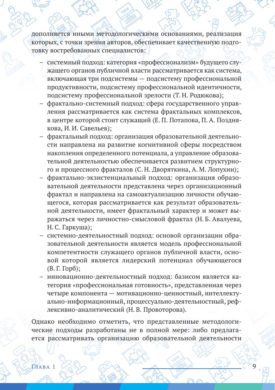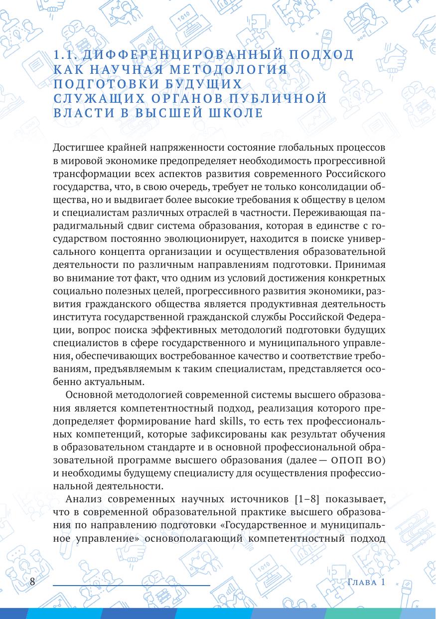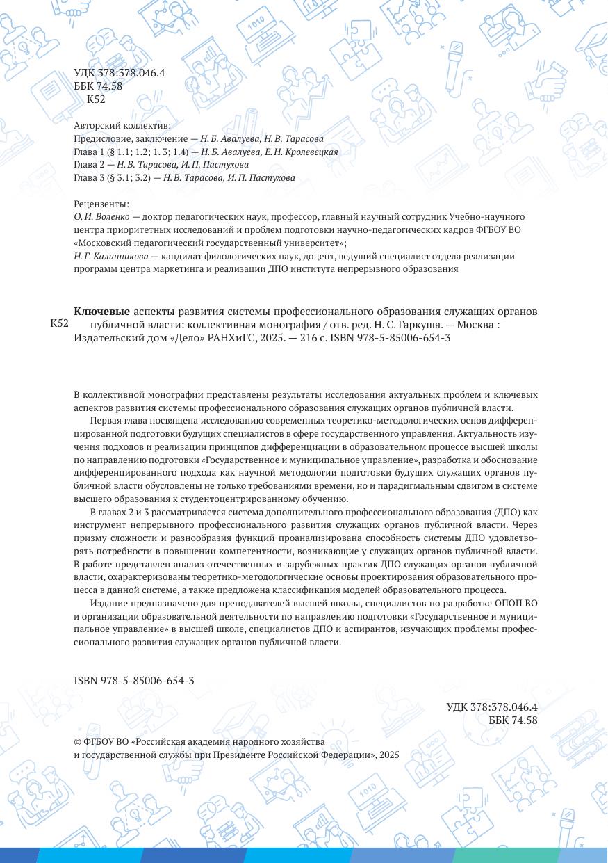 В коллективной монографии представлены результаты исследования актуальных проблем и ключевых аспектов развития системы профессионального образования служащих органов публичной власти. Первая глава посвящена исследованию современных теоретико-методологических основ дифференцированной подготовки будущих специалистов в сфере государственного управления. Актуальность изучения подходов и реализации принципов дифференциации в образовательном процессе высшей школы по направлению подготовки «Государственное и муниципальное управление», разработка и обоснование дифференцированного подхода как научной методологии подготовки будущих служащих органов публичной власти обусловлены не только требованиями времени, но и парадигмальным сдвигом в системе высшего образования к студентоцентрированному обучению. В главах 2 и 3 рассматривается система дополнительного профессионального образования (ДПО) как