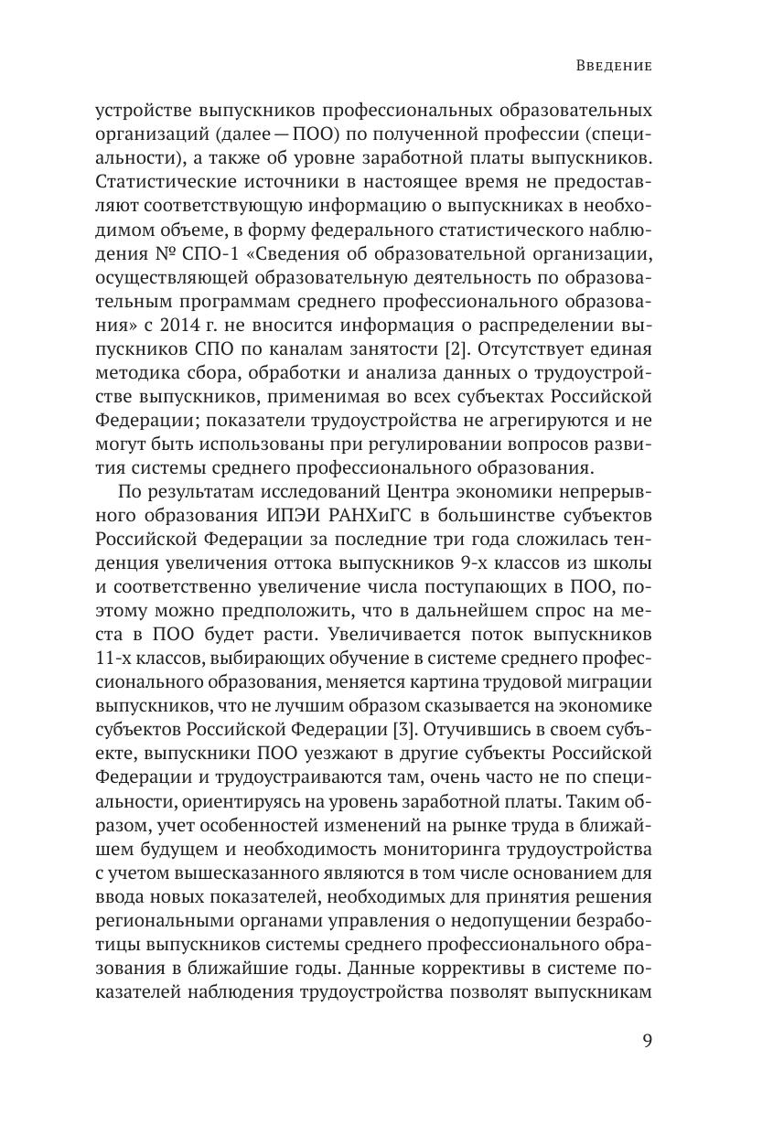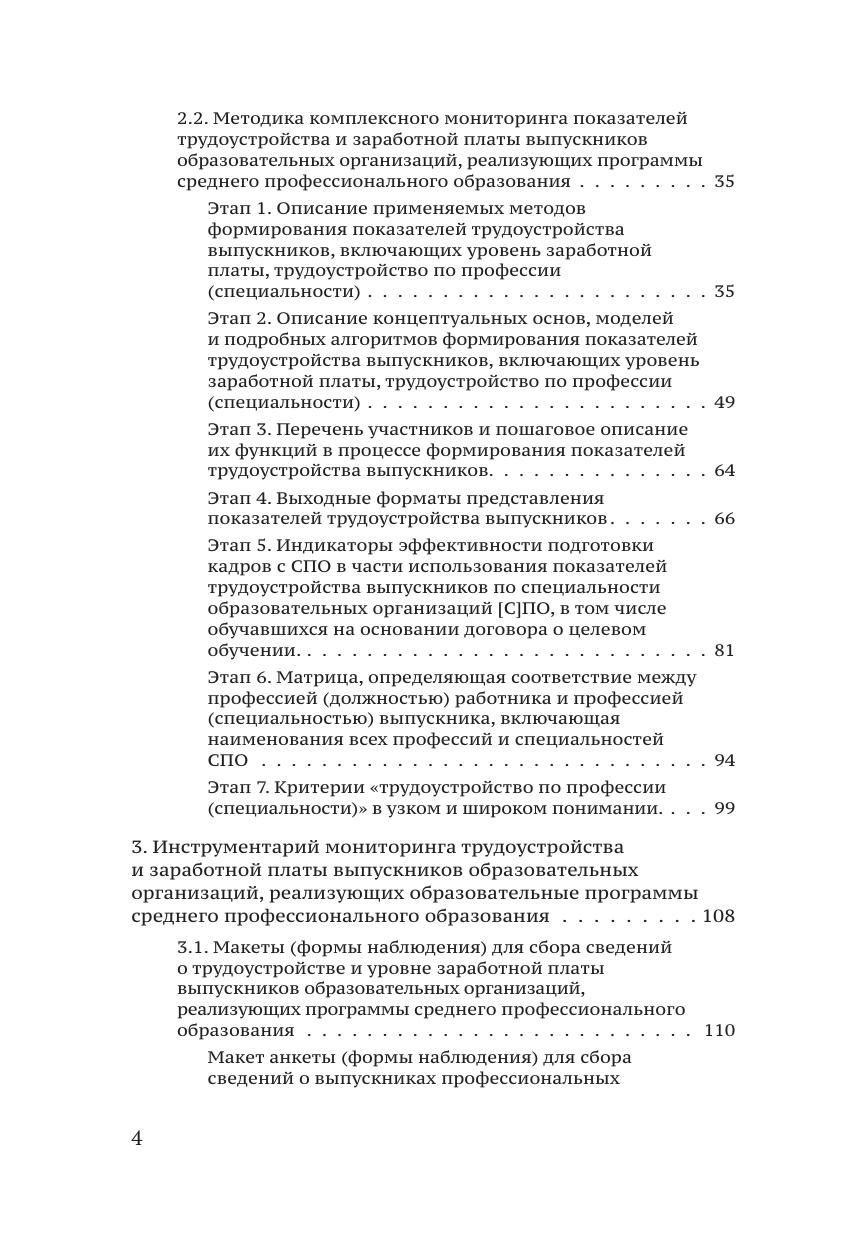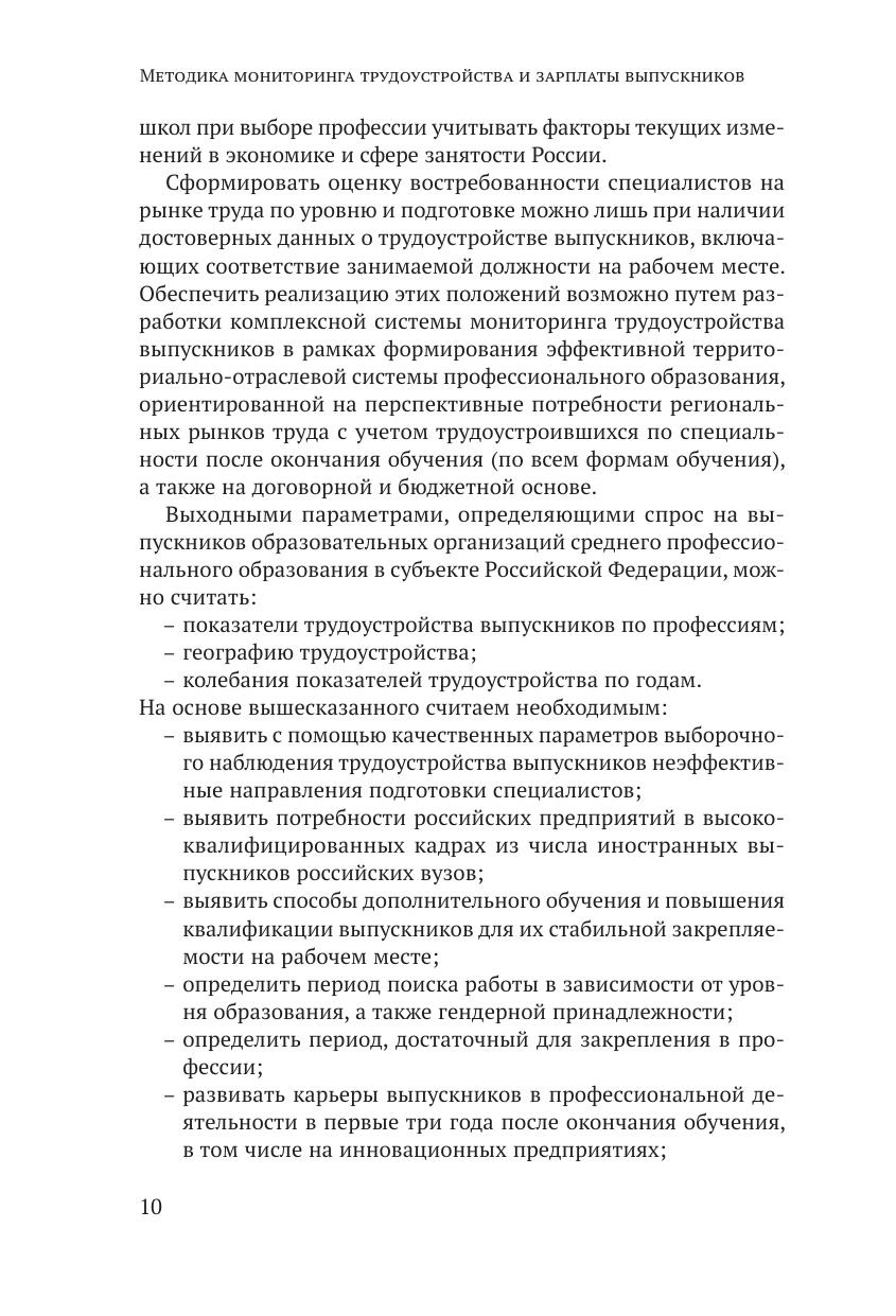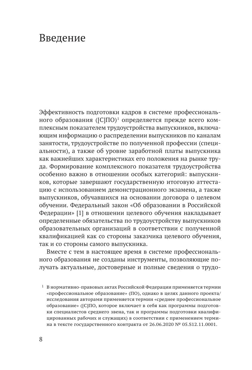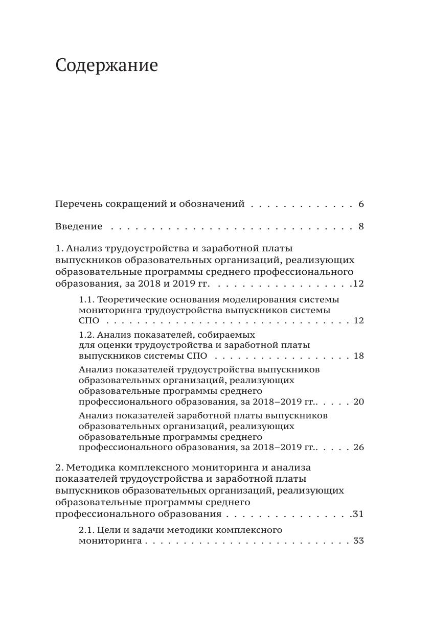 В книге дан анализ трудоустройства выпускников системы СПО за 2018 и 2019 гг., определены недостатки существующего на сегодняшний момент мониторинга трудоустройства и заработной платы выпускников системы СПО, а также представлена новая методика комплексного мониторинга трудоустройства и заработной платы выпускников образовательных организаций, реализующих программы среднего профессионального образования, позволяющая проводить более качественный анализ трудоустройства, который, в свою очередь, очень важен для разработки рекомендаций с целью дальнейшего регулирования вопросов развития системы среднего профессионального образования.