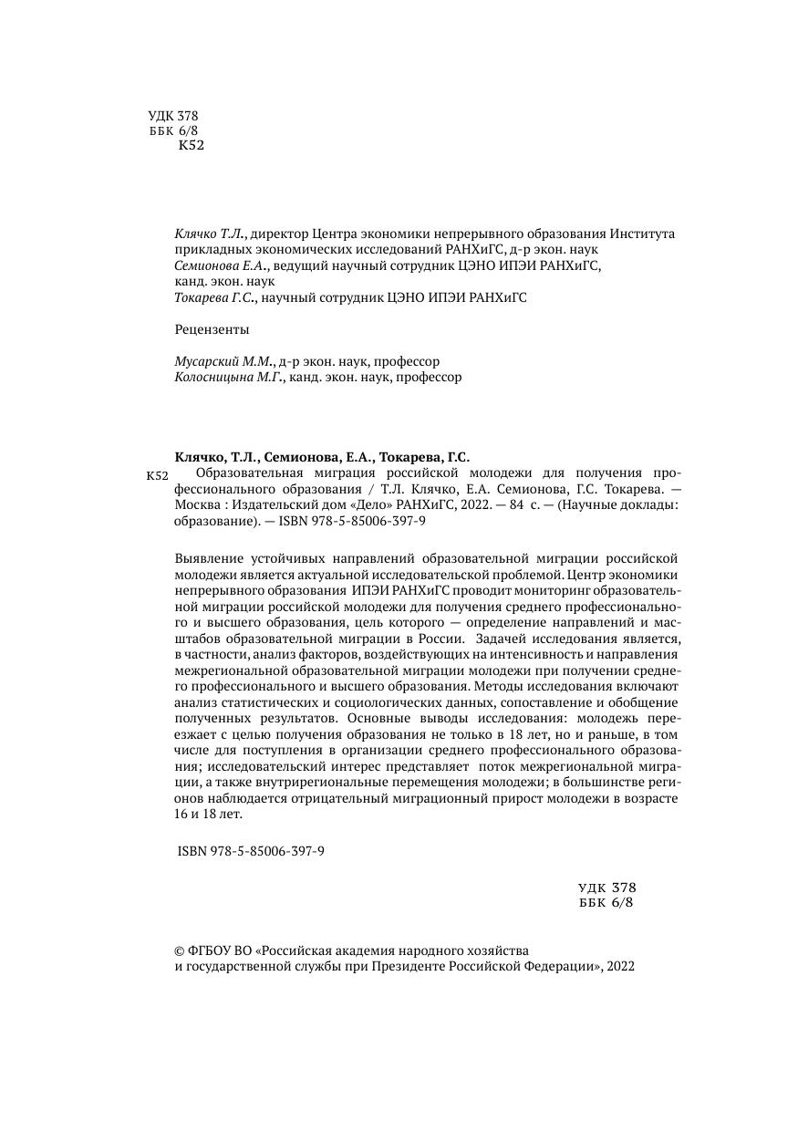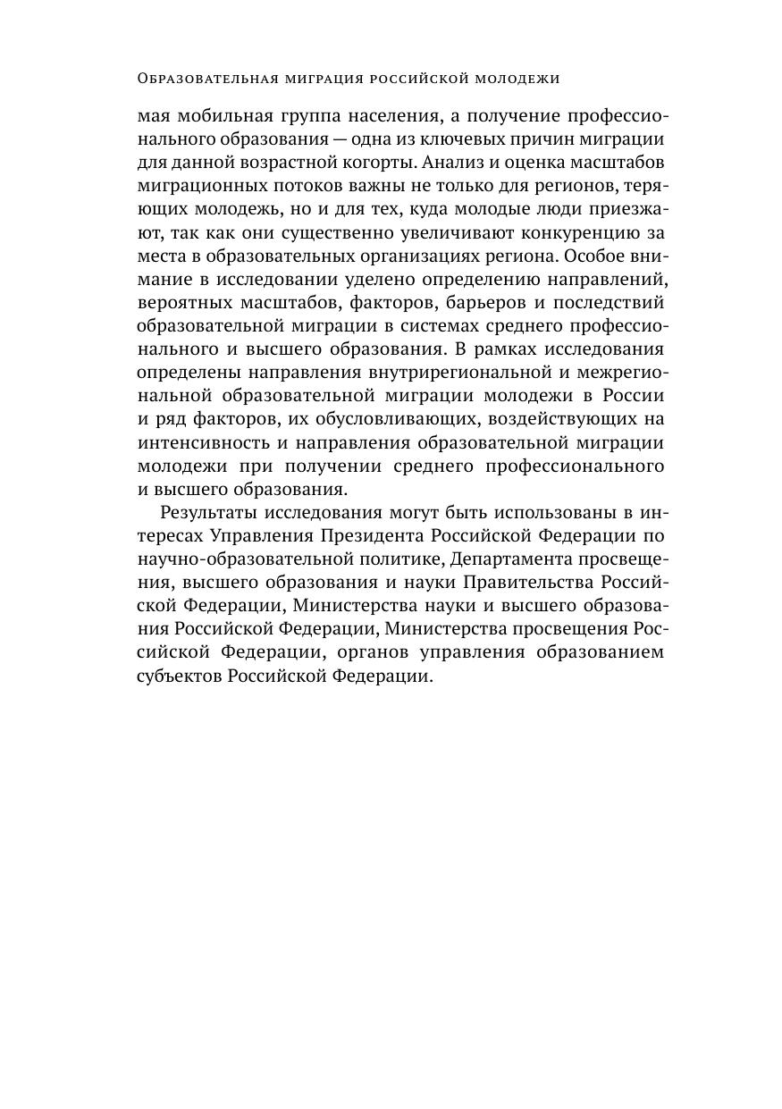 Выявление устойчивых направлений образовательной миграции российской молодежи является актуальной исследовательской проблемой. Центр экономики непрерывного образования ИПЭИ РАНХиГС проводит мониторинг образовательной миграции российской молодежи для получения среднего профессионального и высшего образования, цель которого — определение направлений и масштабов образовательной миграции в России. Задачей исследования является, в частности, анализ факторов, воздействующих на интенсивность и направления межрегиональной образовательной миграции молодежи при получении среднего профессионального и высшего образования. Методы исследования включают анализ статистических и социологических данных, сопоставление и обобщение полученных результатов. Основные выводы исследования: молодежь переезжает с целью получения образования не только в 18 лет, но и раньше, в том числе для поступления в организации среднего профессионального образования; исследовательский интерес представляет поток межрегиональной миграции, а также внутрирегиональные перемещения молодежи; в большинстве регионов наблюдается отрицательный миграционный прирост молодежи в возрасте 16 и 18 лет.