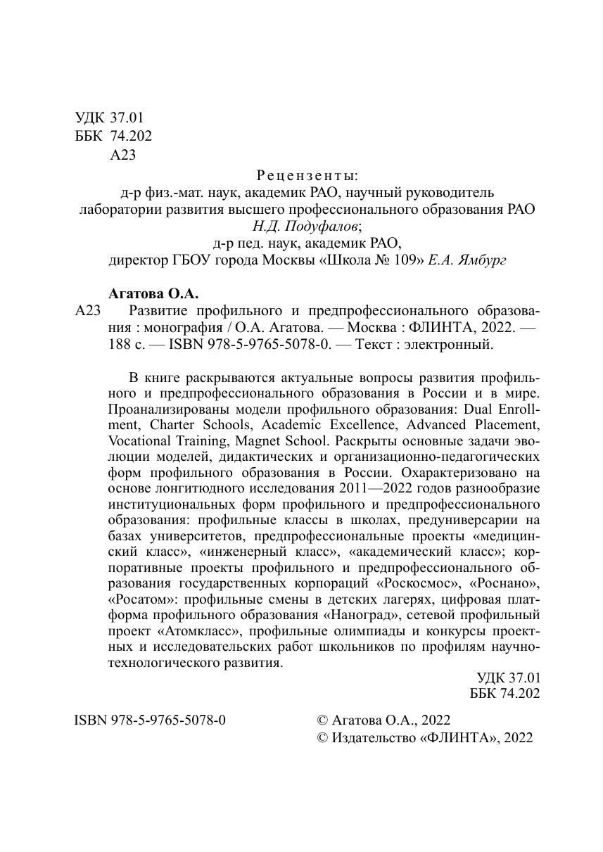 В книге раскрываются актуальные вопросы развития профильного и предпрофессионального образования в России и в мире. Проанализированы модели профильного образования: Dual Enrollment, Charter Schools, Academic Excellence, Advanced Placement, Vocational Training, Magnet School. Раскрыты основные задачи эволюции моделей, дидактических и организационно-педагогических форм профильного образования в России. Охарактеризовано на основе лонгитюдного исследования 2011—2022 годов разнообразие институциональных форм профильного и предпрофессионального образования: профильные классы в школах, предуниверсарии на базах университетов, предпрофессиональные проекты «медицинский класс», «инженерный класс», «академический класс»; корпоративные проекты профильного и предпрофессионального образования государственных корпораций «Роскосмос», «Роснано», «Росатом»: профильные смены в детских лагерях, цифровая платформа профильного образования «Наноград», сетевой профильный проект «Атомкласс», профильные олимпиады и конкурсы проектных и исследовательских работ школьников по профилям научно-технологического развития.