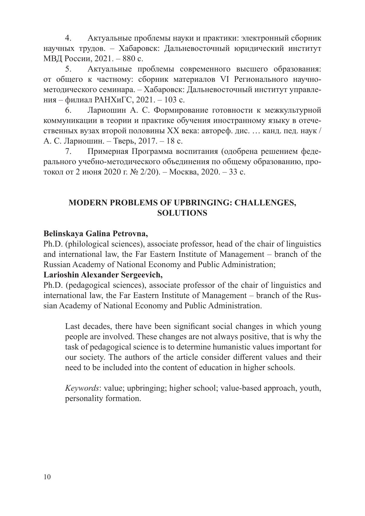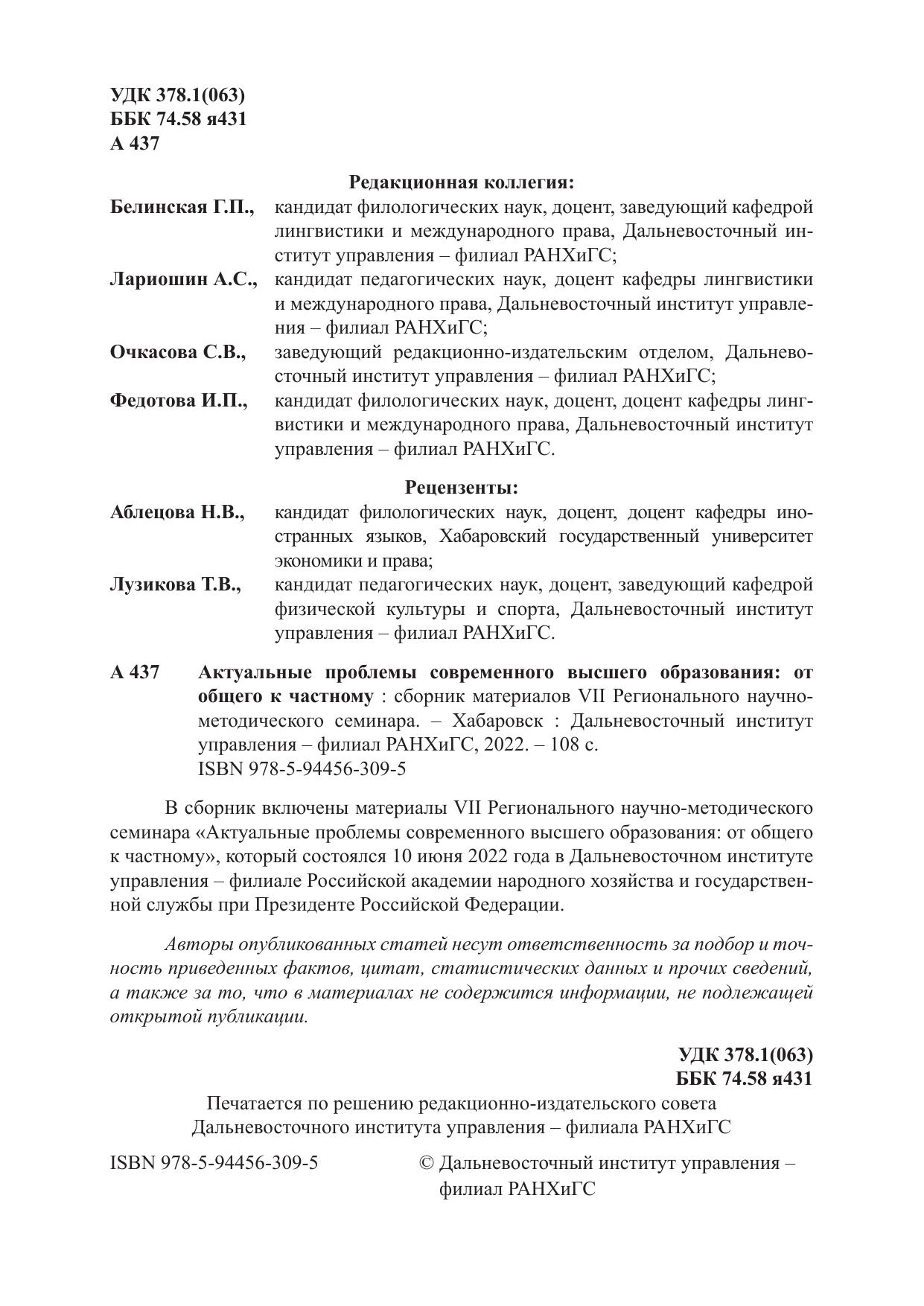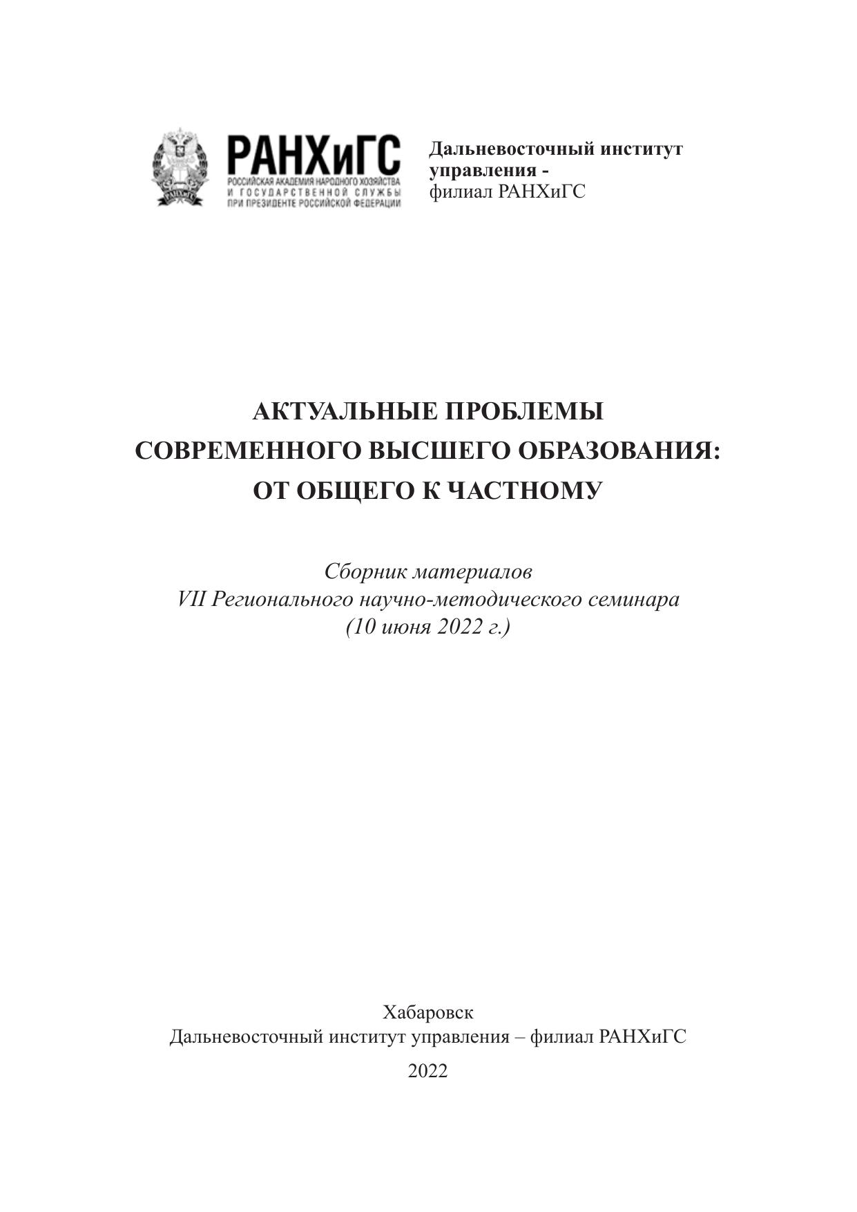 В сборник включены материалы VII Регионального научно-методического семинара «Актуальные проблемы современного высшего образования: от общего к частному», который состоялся 10 июня 2022 года в Дальневосточном институте управления – филиале Российской академии народного хозяйства и государственной службы при Президенте Российской Федерации.