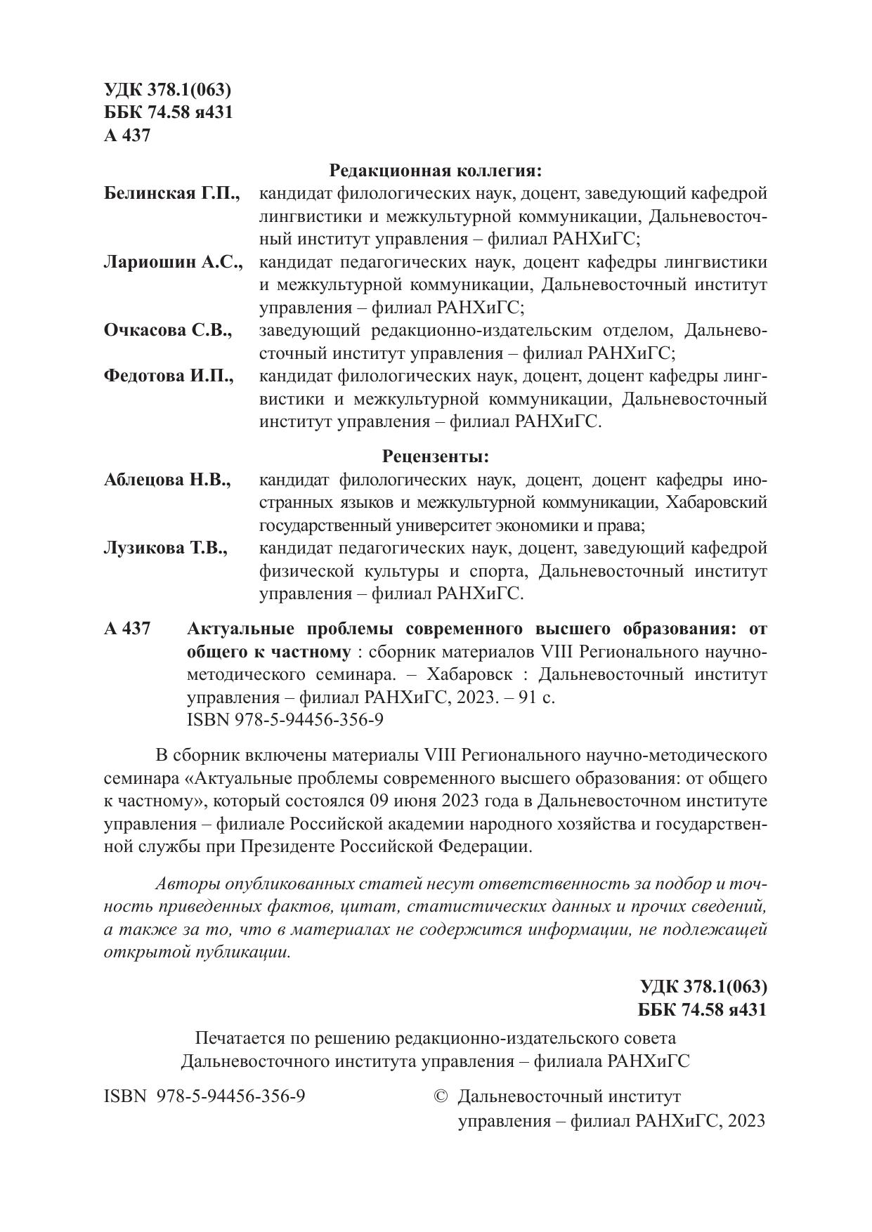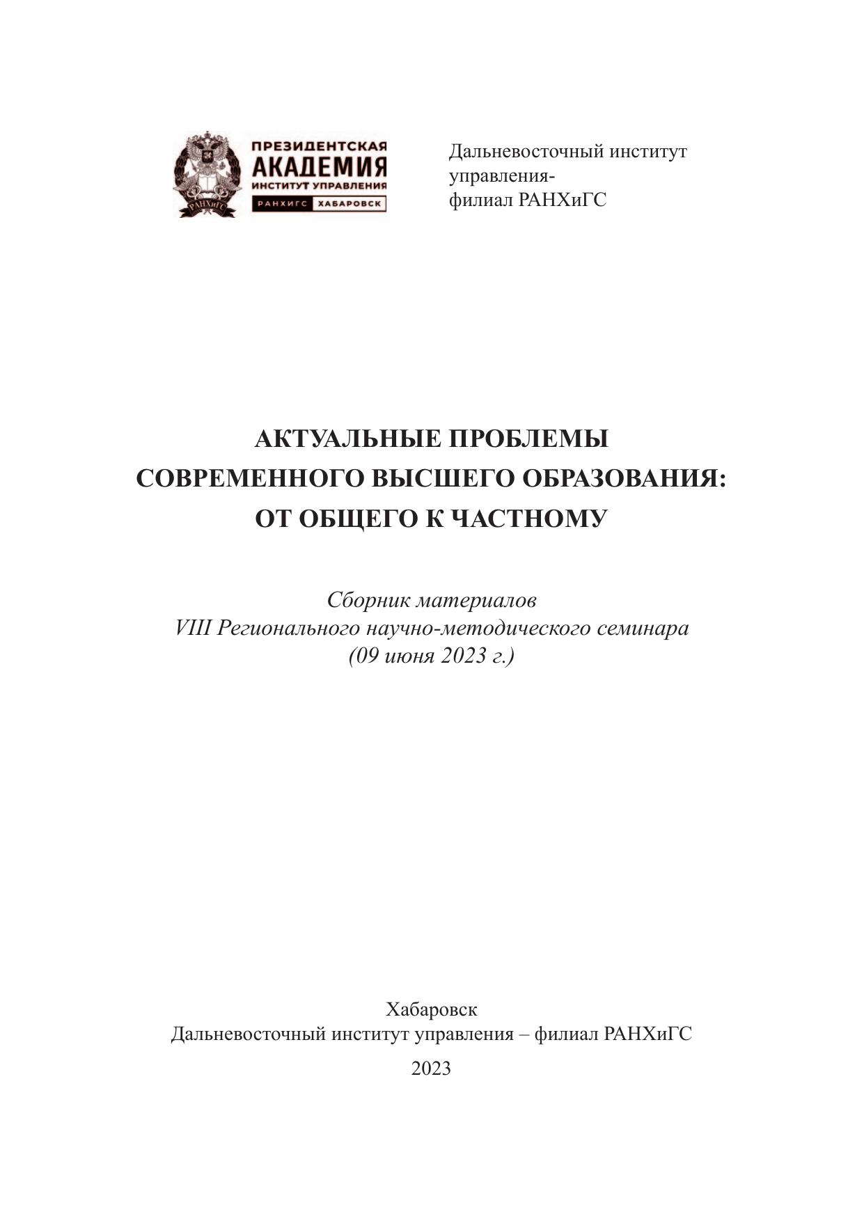 В сборник включены материалы VIII Регионального научно-методического семинара «Актуальные проблемы современного высшего образования: от общего к частному», который состоялся 09 июня 2023 года в Дальневосточном институте управления – филиале Российской академии народного хозяйства и государственной службы при Президенте Российской Федерации.