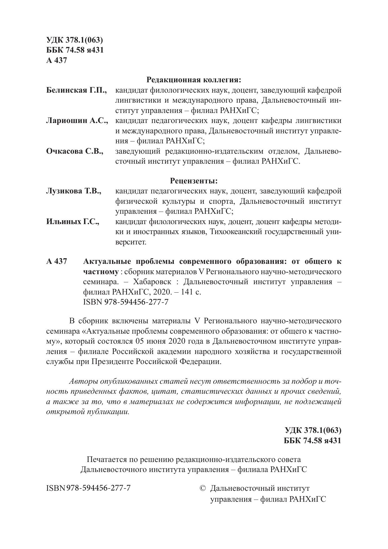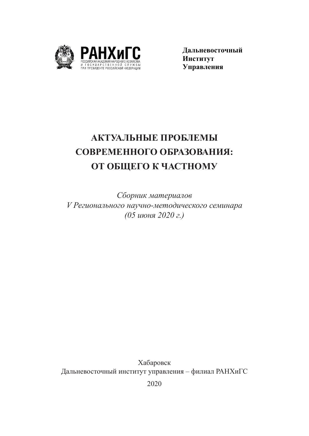 В сборник включены материалы V Регионального научно-методического семинара «Актуальные проблемы современного образования: от общего к частному», который состоялся 05 июня 2020 года в Дальневосточном институте управления – филиале Российской академии народного хозяйства и государственной службы при Президенте Российской Федерации.