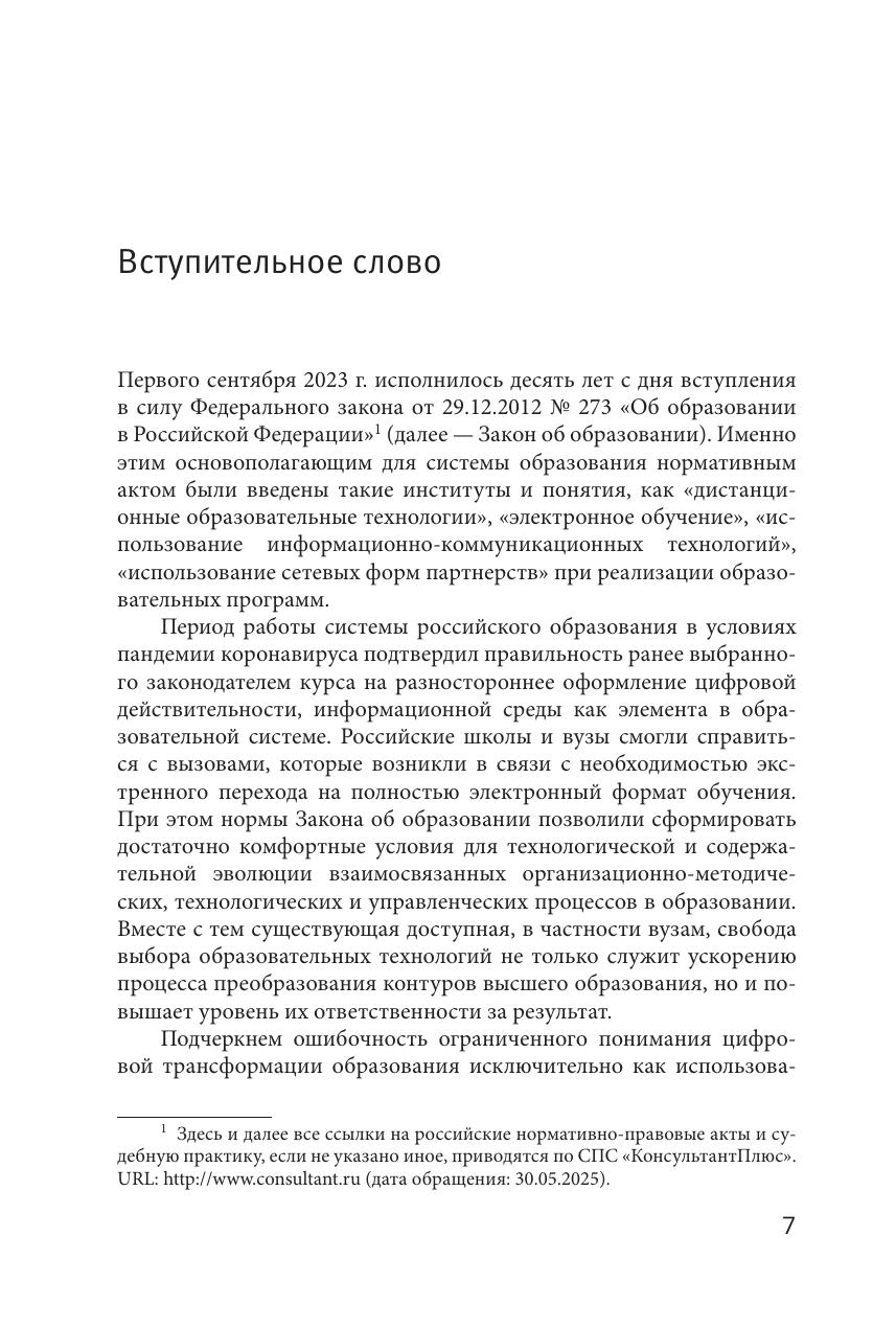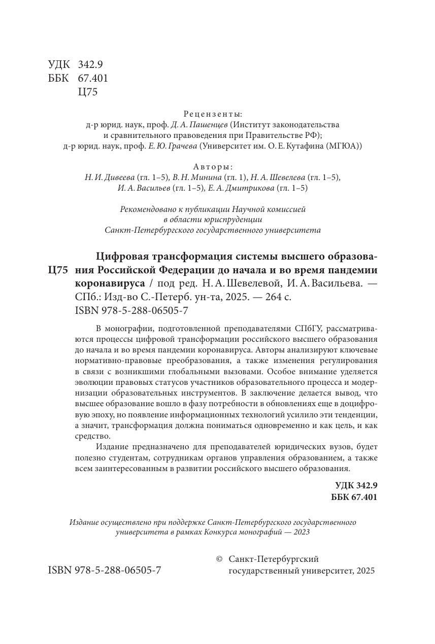 В монографии, подготовленной преподавателями СПбГУ, рассматриваются процессы цифровой трансформации российского высшего образования до начала и во время пандемии коронавируса. Авторы анализируют ключевые нормативно-правовые преобразования, а также изменения регулирования в связи с возникшими глобальными вызовами. Особое внимание уделяется эволюции правовых статусов участников образовательного процесса и модернизации образовательных инструментов. В заключение делается вывод, что высшее образование вошло в фазу потребности в обновлениях еще в доцифровую эпоху, но появление информационных технологий усилило эти тенденции, а значит, трансформация должна пониматься одновременно и как цель, и как средство. Издание предназначено для преподавателей юридических вузов, будет полезно студентам, сотрудникам органов управления образованием, а также всем заинтересованным в развитии российского высшего образования.