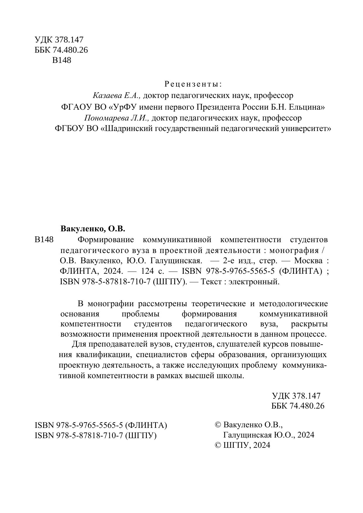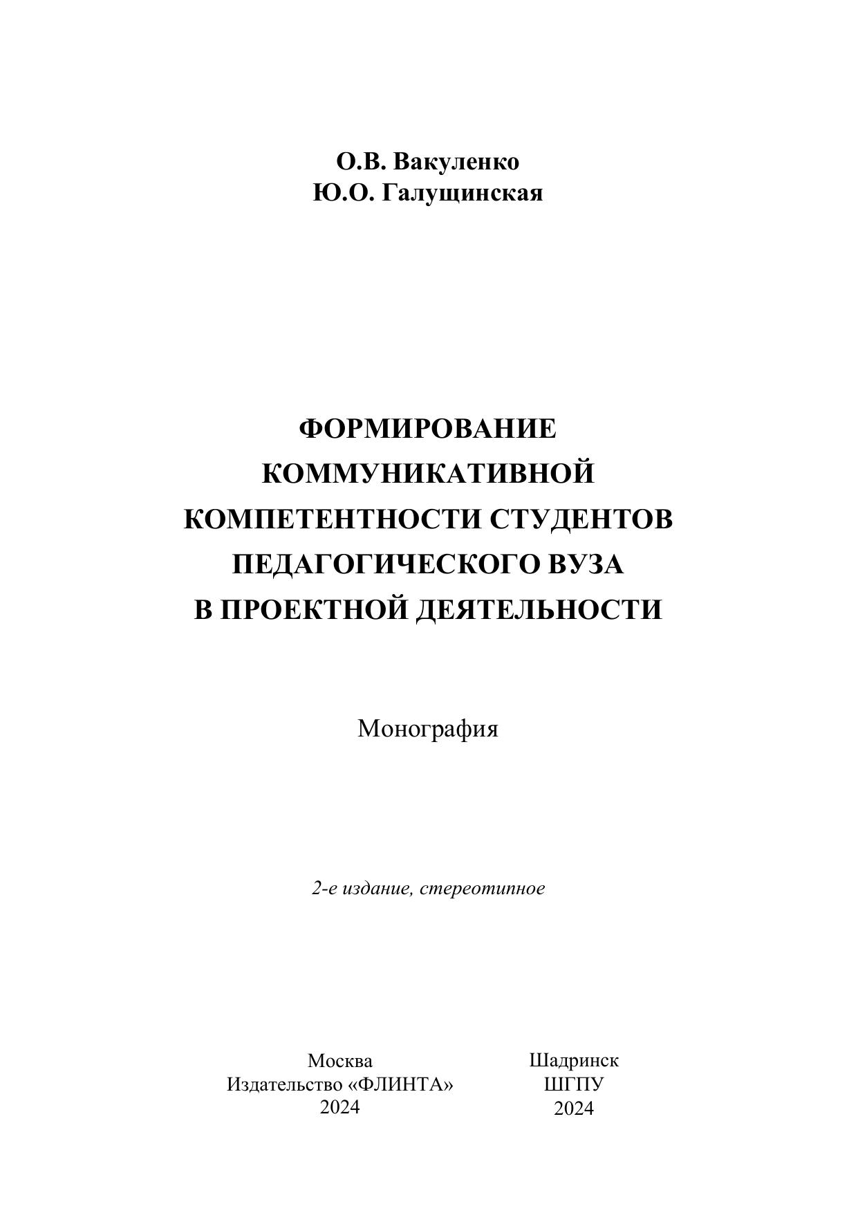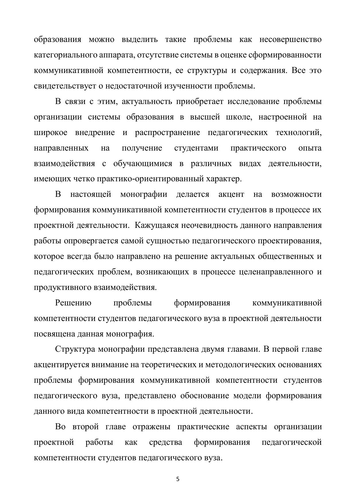 В монографии рассмотрены теоретические и методологические основания проблемы формирования коммуникативной компетентности студентов педагогического вуза, раскрыты возможности применения проектной деятельности в данном процессе. Для преподавателей вузов, студентов, слушателей курсов повышения квалификации, специалистов сферы образования, организующих проектную деятельность, а также исследующих проблему коммуникативной компетентности в рамках высшей школы.