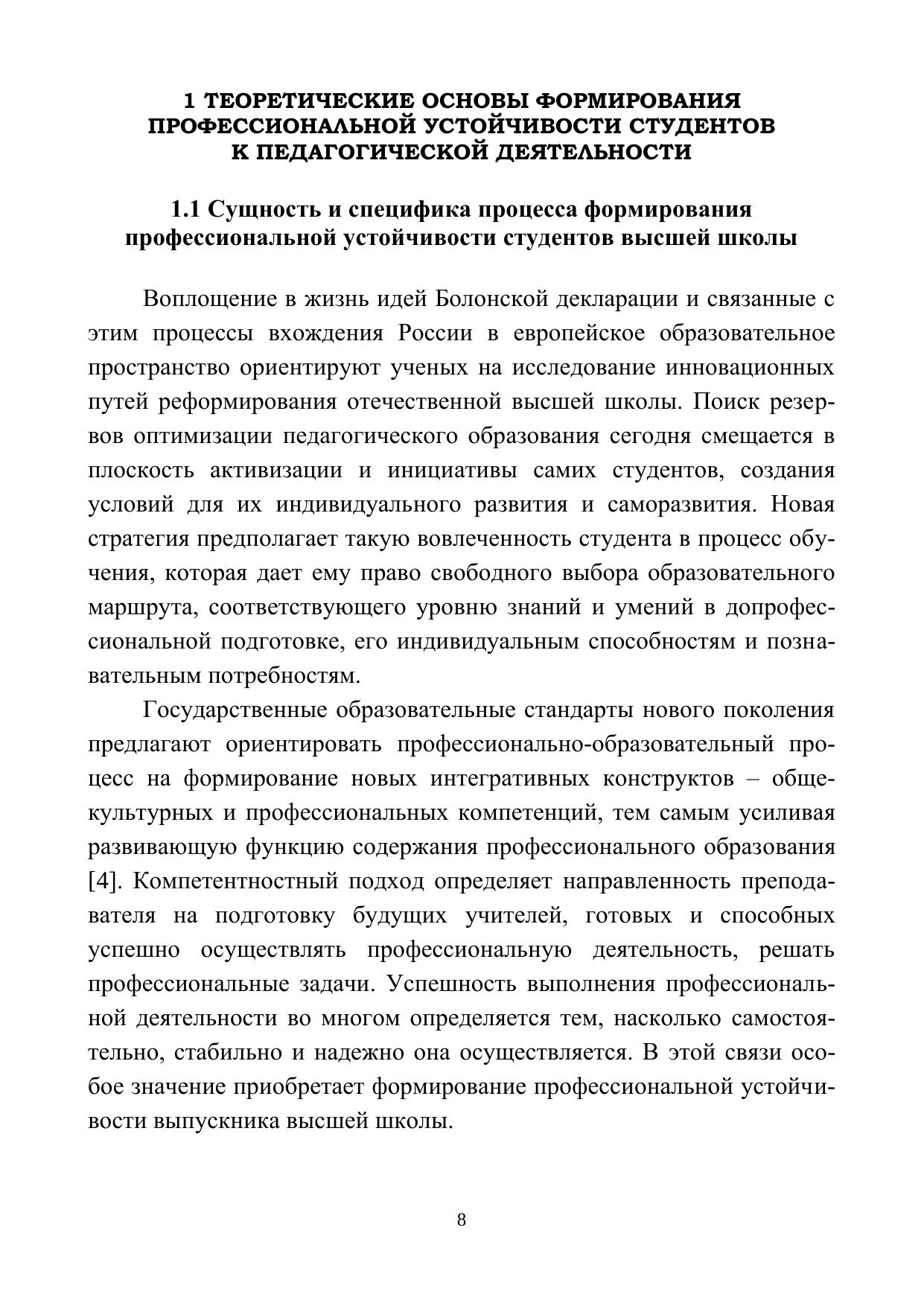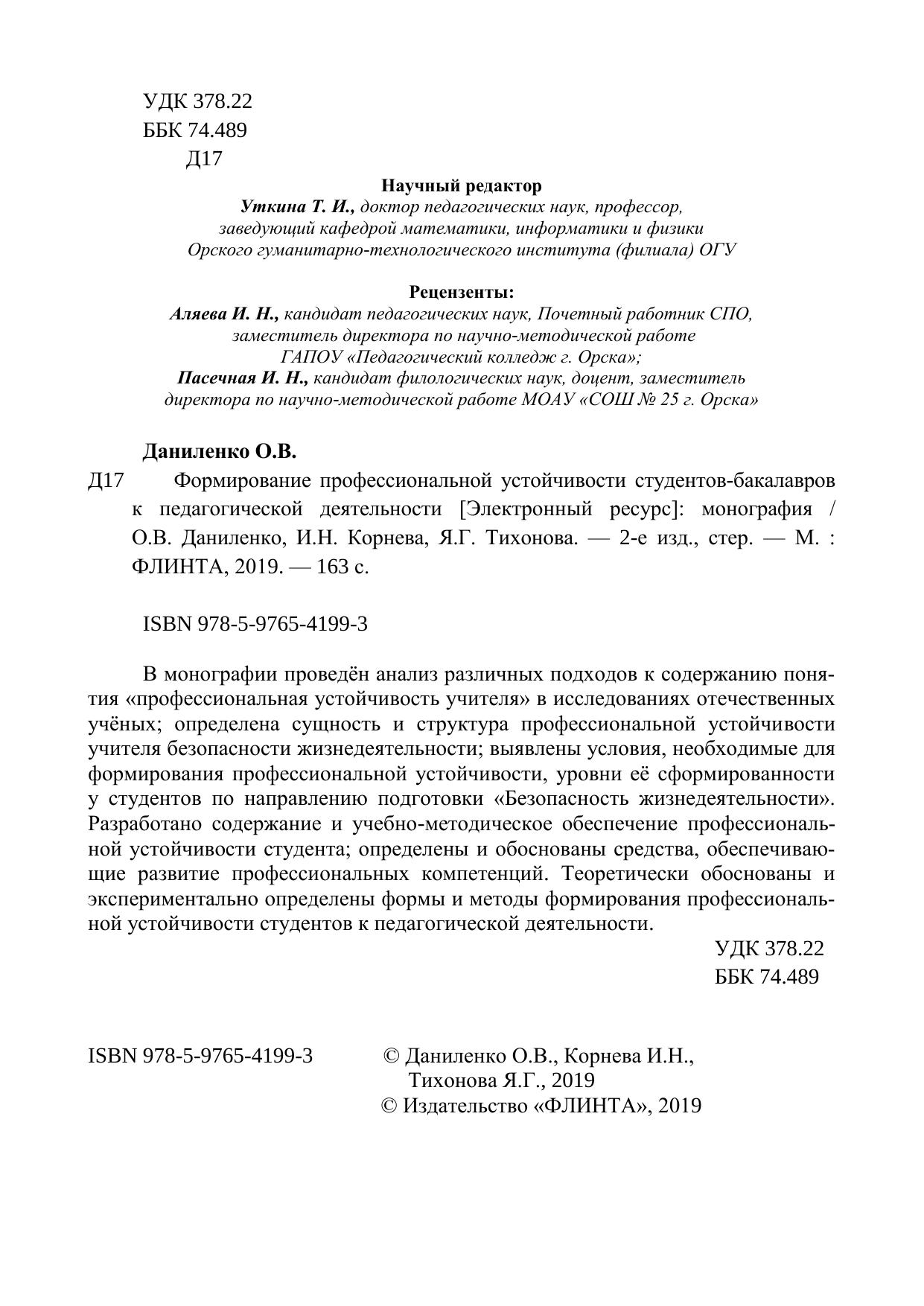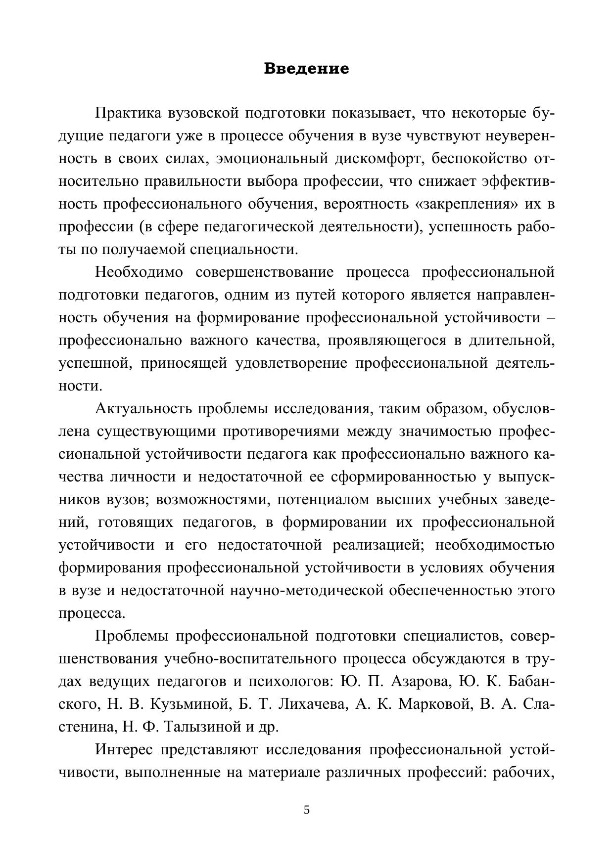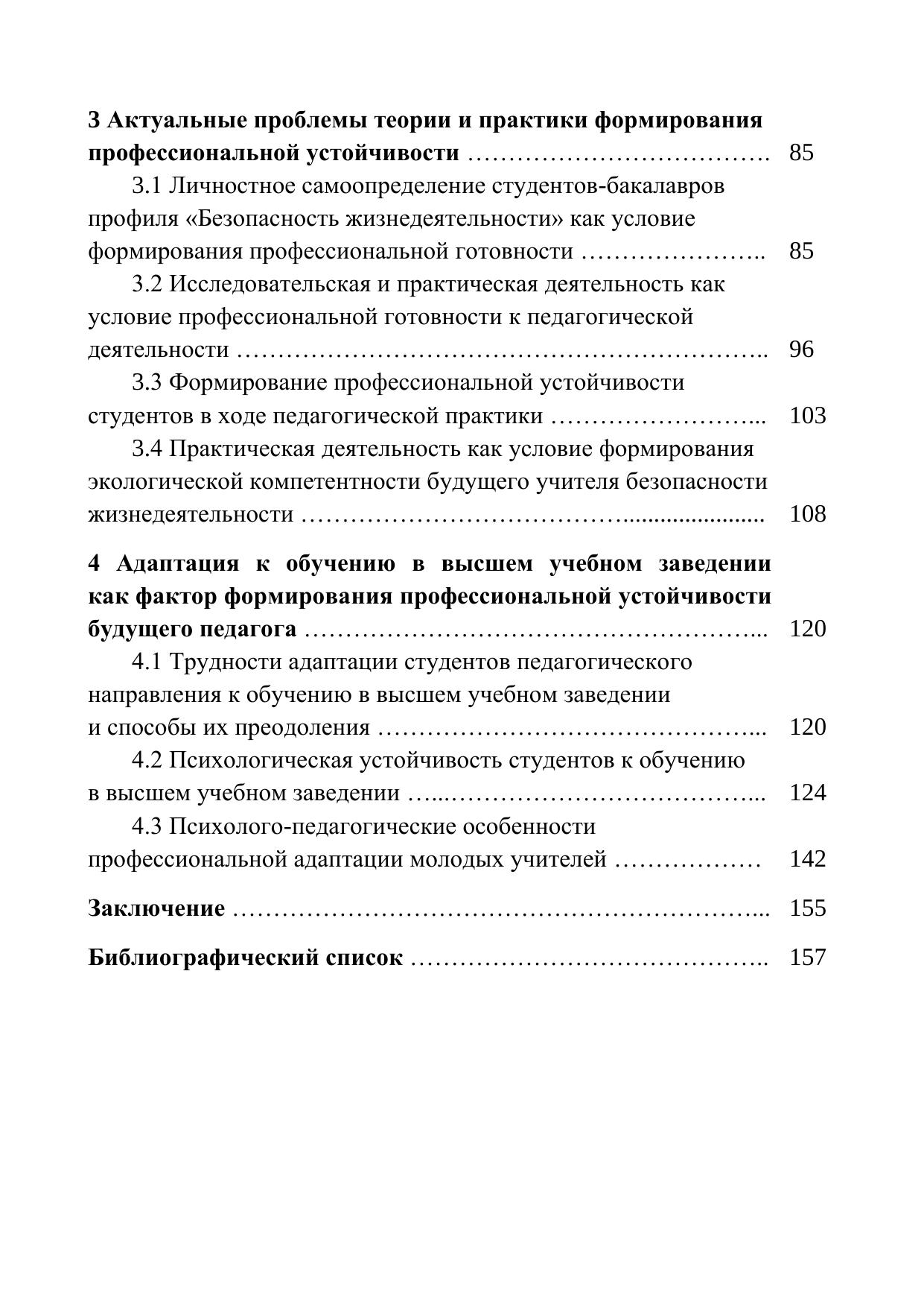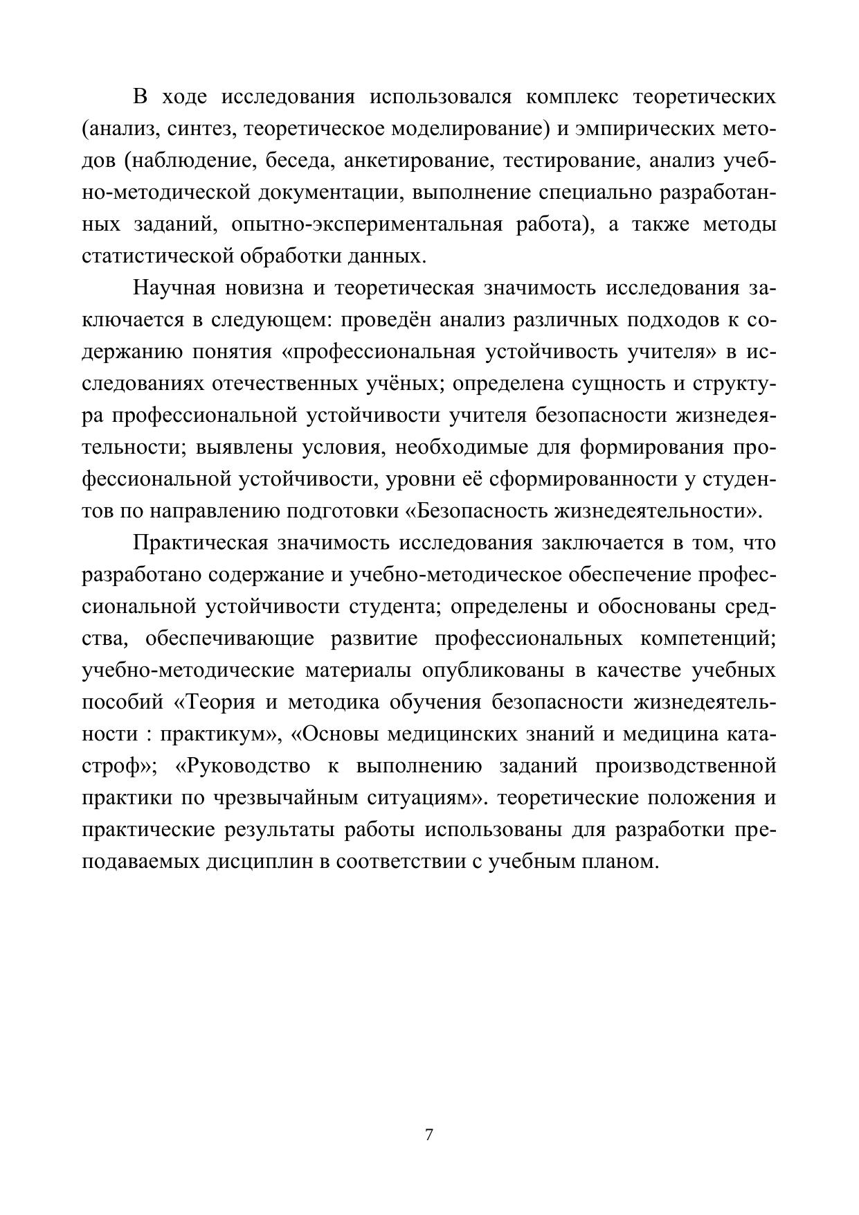 В монографии проведён анализ различных подходов к содержанию понятия «профессиональная устойчивость учителя» в исследованиях отечественных учёных; определена сущность и структура профессиональной устойчивости учителя безопасности жизнедеятельности; выявлены условия, необходимые для формирования профессиональной устойчивости, уровни её сформированности у студентов по направлению подготовки «Безопасность жизнедеятельности». Разработано содержание и учебно-методическое обеспечение профессиональной устойчивости студента; определены и обоснованы средства, обеспечивающие развитие профессиональных компетенций. Теоретически обоснованы и экспериментально определены формы и методы формирования профессиональной устойчивости студентов к педагогической деятельности.