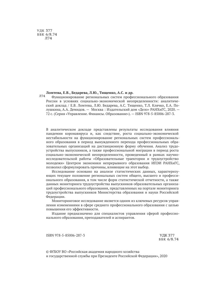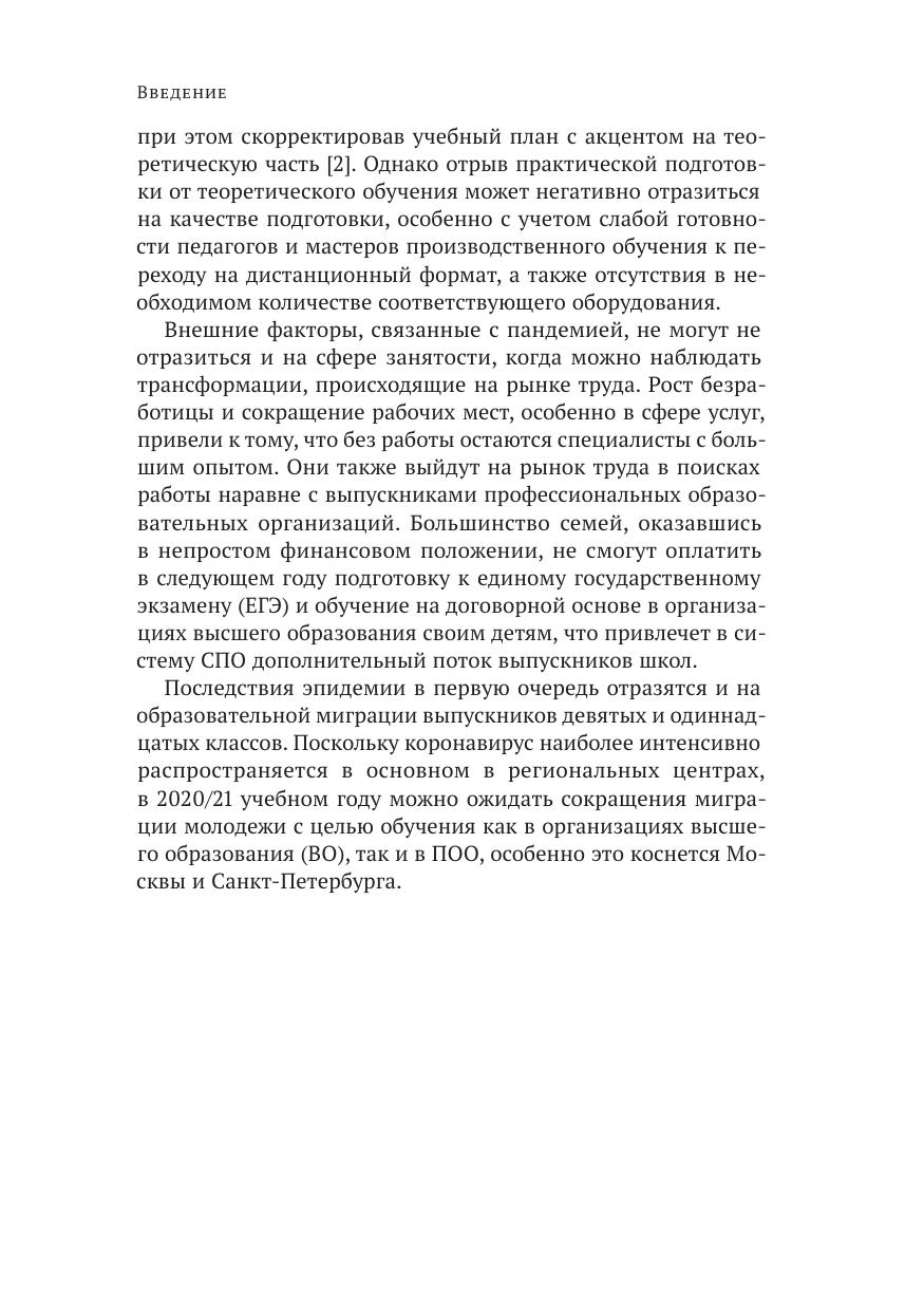 В аналитическом докладе представлены результаты исследования влияния пандемии коронавируса и, как следствие, роста социально-экономической нестабильности на функционирование региональных систем профессионального образования в период вынужденного перехода профессиональных образовательных организаций на дистанционную форму обучения. Анализ трудоустройства выпускников, а также профессиональной миграции в период роста социально-экономической неопределенности, проведенный в рамках научно-исследовательской работы «Образовательные траектории и трудоустройство молодежи» Центром экономики непрерывного образования ИПЭИ РАНХиГС, позволил сформулировать причины, влияющие на этот выбор.