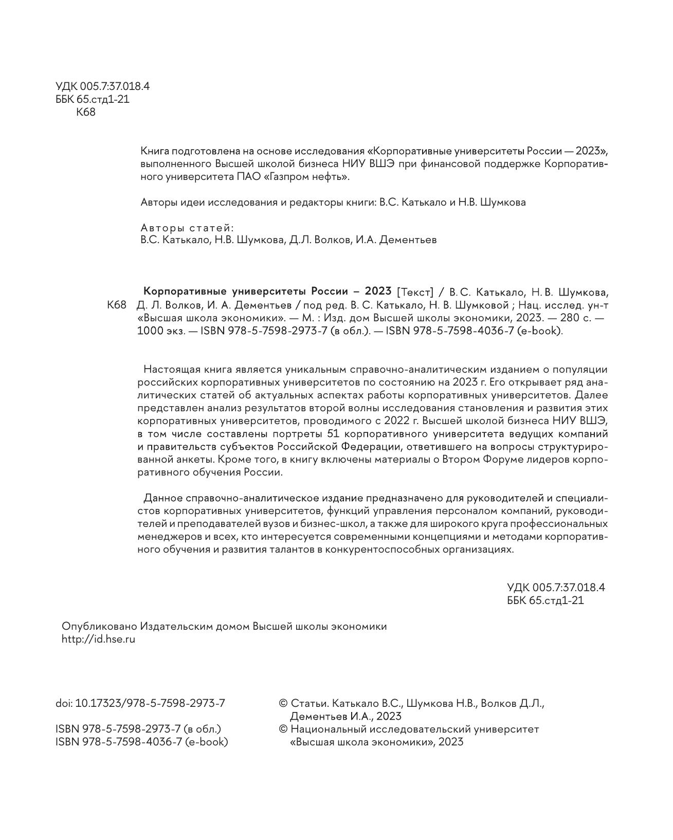 Настоящая книга является уникальным справочно-аналитическим изданием о популяции российских корпоративных университетов по состоянию на 2023 г. Его открывает ряд аналитических статей об актуальных аспектах работы корпоративных университетов. Далее представлен анализ результатов второй волны исследования становления и развития этих корпоративных университетов, проводимого с 2022 г. Высшей школой бизнеса НИУ ВШЭ, в том числе составлены портреты 51 корпоративного университета ведущих компаний и правительств субъектов Российской Федерации, ответившего на вопросы структурированной анкеты. Кроме того, в книгу включены материалы о Втором Форуме лидеров корпоративного обучения России. Данное справочно-аналитическое издание предназначено для руководителей и специалистов корпоративных университетов, функций управления персоналом компаний, руководителей и преподавателей вузов и бизнес-школ, а также для широкого круга профессиональных менеджеров и всех, кто интересуется современными концепциями и методами корпоративного обучения и развития талантов в конкурентоспособных организациях.