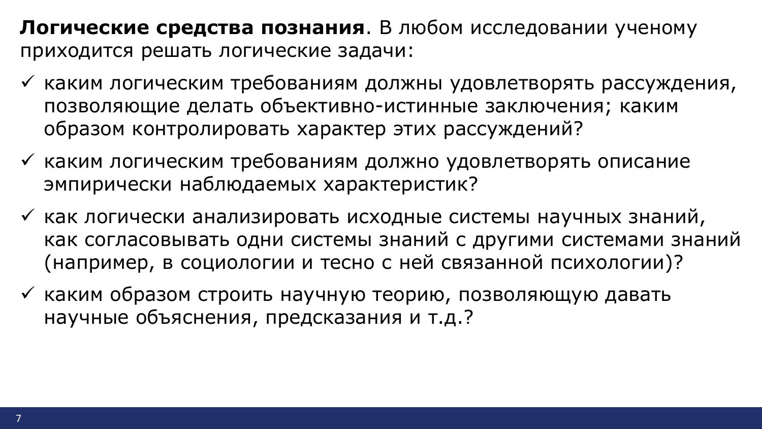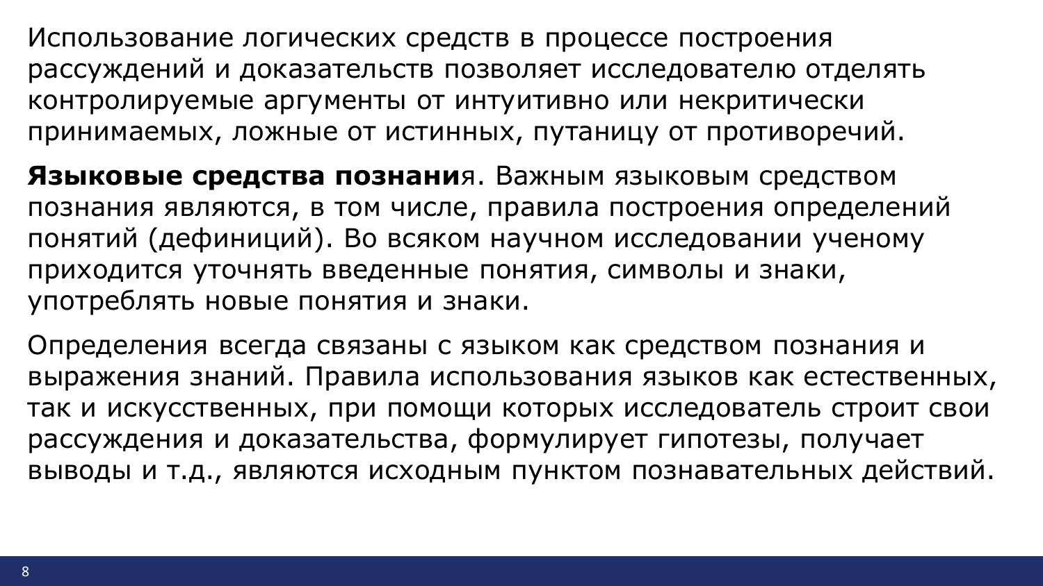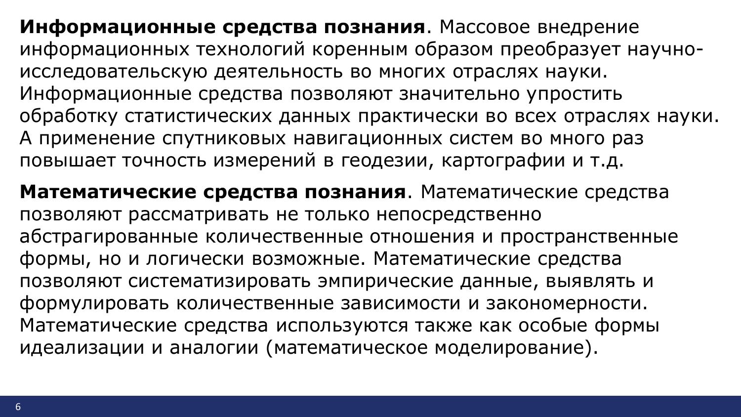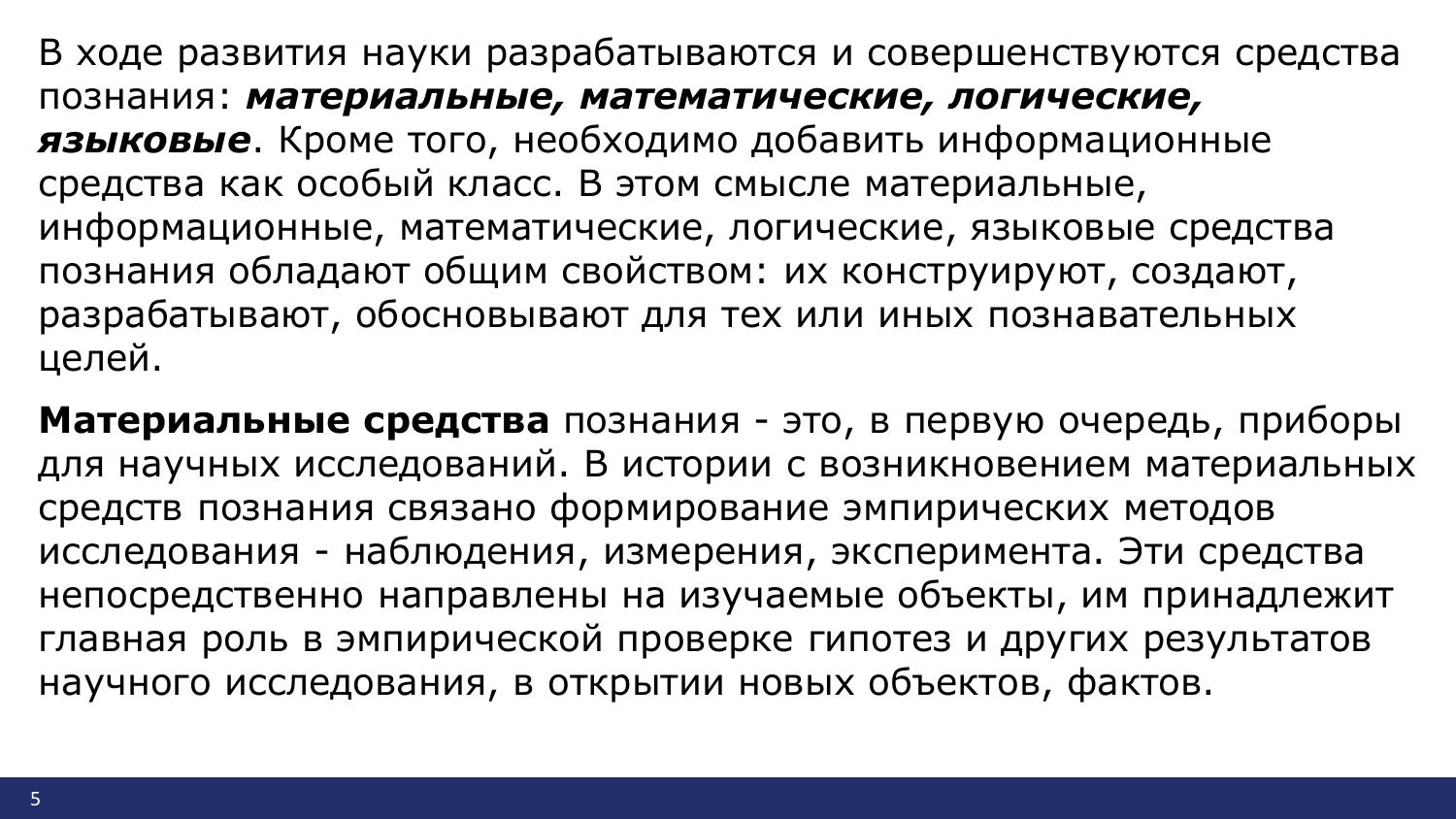 В ходе развития науки разрабатываются и совершенствуются средства познания: материальные, математические, логические, языковые. Кроме того, необходимо добавить информационные средства как особый класс. В этом смысле материальные, информационные, математические, логические, языковые средства познания обладают общим свойством: их конструируют, создают, разрабатывают, обосновывают для тех или иных познавательных целей.
