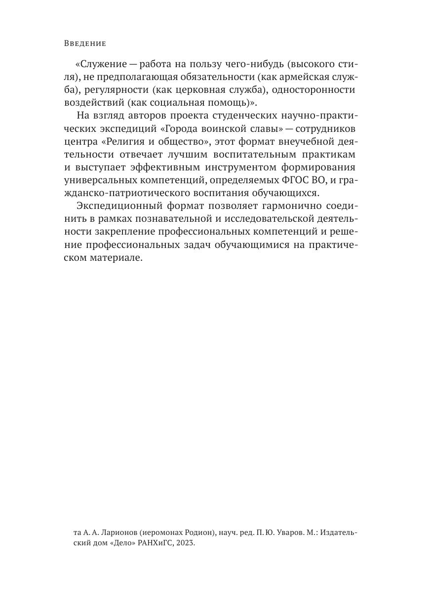 Методическое пособие разработано в связи с необходимостью систематизации опыта проведения научных экспедиций «Города воинской славы» межвузовским учебно-научным центром «Религия и общество» ИГСУ РАНХиГС. Пособие подготовлено на основе обобщения опыта проведенных экспедиций. При разработке были учтены разъяснения по вопросам действующего порядка проведения экспедиций, а также типичные ошибки, выявленные при их проведении.