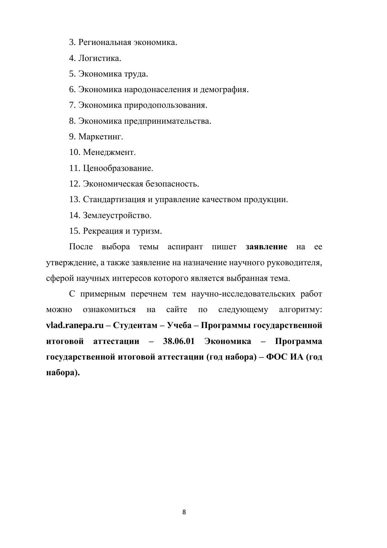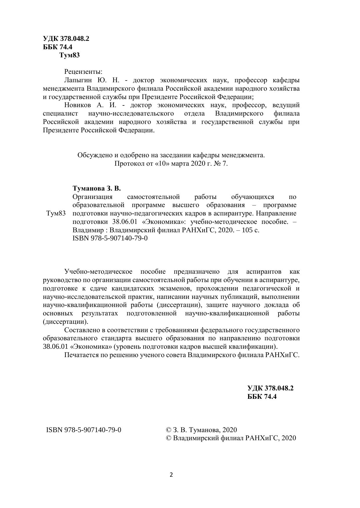 Учебно-методическое пособие предназначено для аспирантов как руководство по организации самостоятельной работы при обучении в аспирантуре, подготовке к сдаче кандидатских экзаменов, прохождении педагогической и научно-исследовательской практик, написании научных публикаций, выполнении научно-квалификационной работы (диссертации), защите научного доклада об основных результатах подготовленной научно-квалификационной работы (диссертации). Составлено в соответствии с требованиями федерального государственного образовательного стандарта высшего образования по направлению подготовки 38.06.01 «Экономика» (уровень подготовки кадров высшей квалификации). Печатается по решению ученого совета Владимирского филиала РАНХиГС.