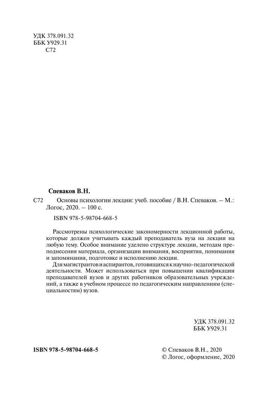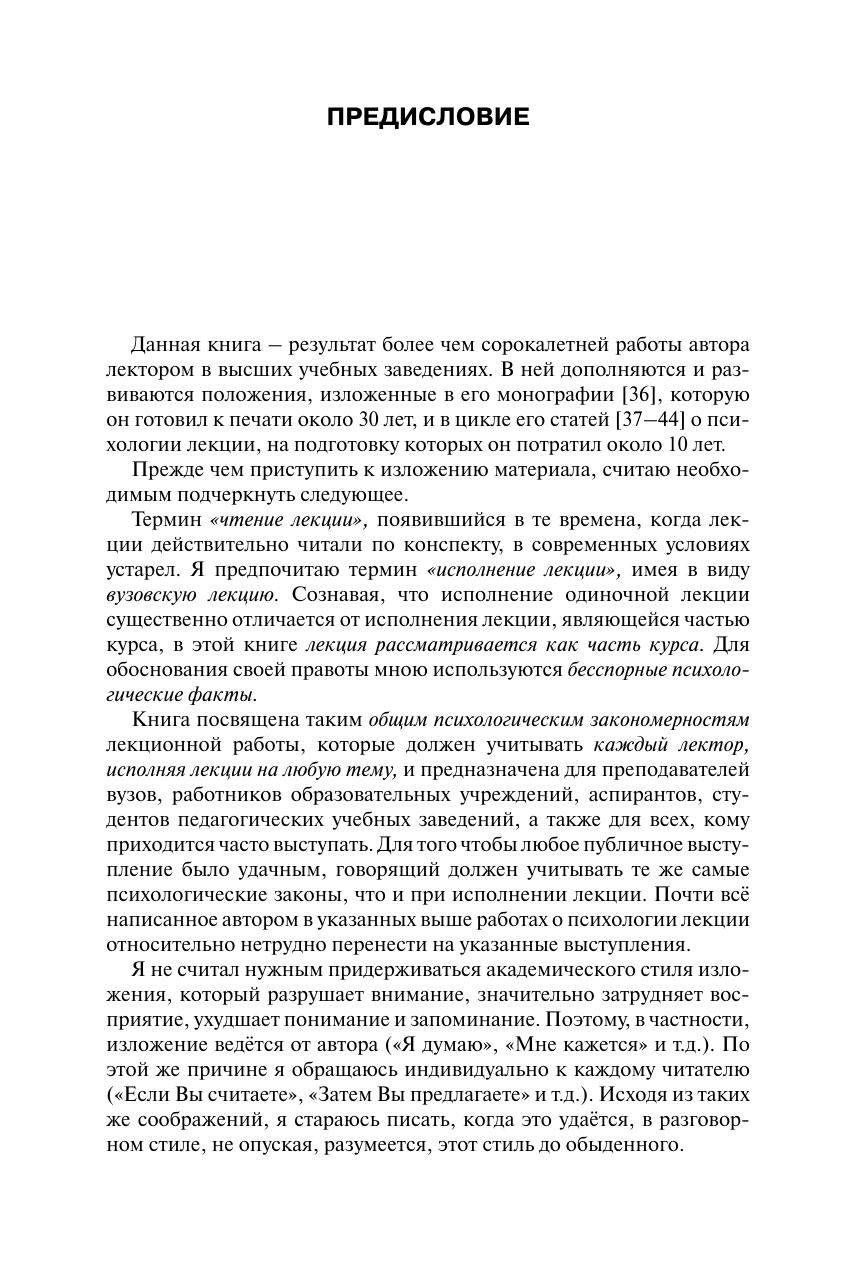 Рассмотрены психологические закономерности лекционной работы, которые должен учитывать каждый преподаватель вуза на лекции на любую тему. Особое внимание уделено структуре лекции, методам преподнесения материала, организации внимания, восприятия, понимания и запоминания, подготовке и исполнению лекции. Для магистрантов и аспирантов, готовящихся к научно-педагогической деятельности. Может использоваться при повышении квалификации преподавателей вузов и других работников образовательных учреждений, а также в учебном процессе по педагогическим направлениям (специальностям) вузов.