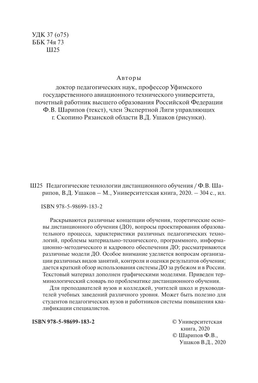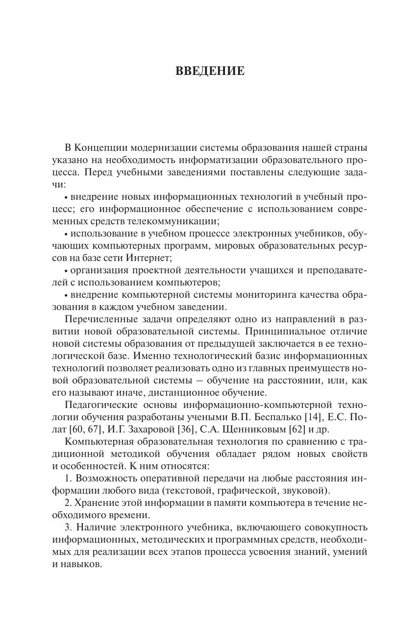 Раскрываются различные концепции обучения, теоретические основы дистанционного обучения (ДО), вопросы проектирования образовательного процесса, характеристики различных педагогических технологий, проблемы материально-технического, программного, информационно-методического и кадрового обеспечения ДО, рассматриваются различные модели ДО. Особое внимание уделяется вопросам организации различных видов занятий, контроля и оценки результатов обучения, дается краткий обзор использования системы ДО за рубежом и в России. Текстовый материал дополнен графическими моделями. Приведен терминологический словарь по проблематике дистанционного обучения. Для преподавателей вузов и колледжей, учителей школ и руководителей учебных заведений различного уровня. Может быть полезно для студентов педагогических вузов и работников системы повышения квалификации специалистов.