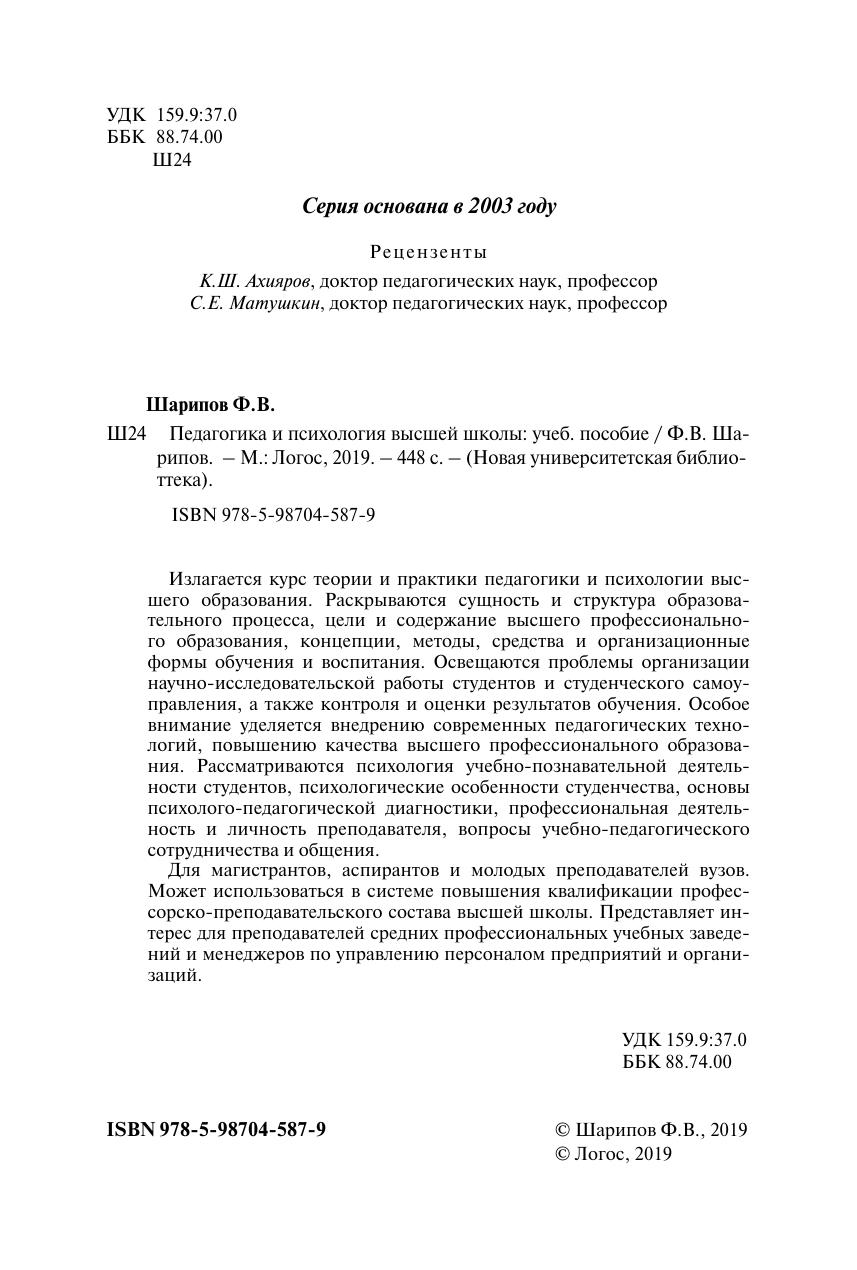 Излагается курс теории и практики педагогики и психологии высшего образования. Раскрываются сущность и структура образовательного процесса, цели и содержание высшего профессионального образования, концепции, методы, средства и организационные формы обучения и воспитания. Освещаются проблемы организации научно-исследовательской работы студентов и студенческого самоуправления, а также контроля и оценки результатов обучения. Особое внимание уделяется внедрению современных педагогических технологий, повышению качества высшего профессионального образования. Рассматриваются психология учебно-познавательной деятельности студентов, психологические особенности студенчества, основы психолого-педагогической диагностики, профессиональная деятельность и личность преподавателя, вопросы учебно-педагогического сотрудничества и общения. Для магистрантов, аспирантов и молодых преподавателей вузов. Может использоваться в системе повышения квалификации профессорско-преподавательского состава высшей школы. Представляет интерес для преподавателей средних профессиональных учебных заведений и менеджеров по управлению персоналом предприятий и организаций.