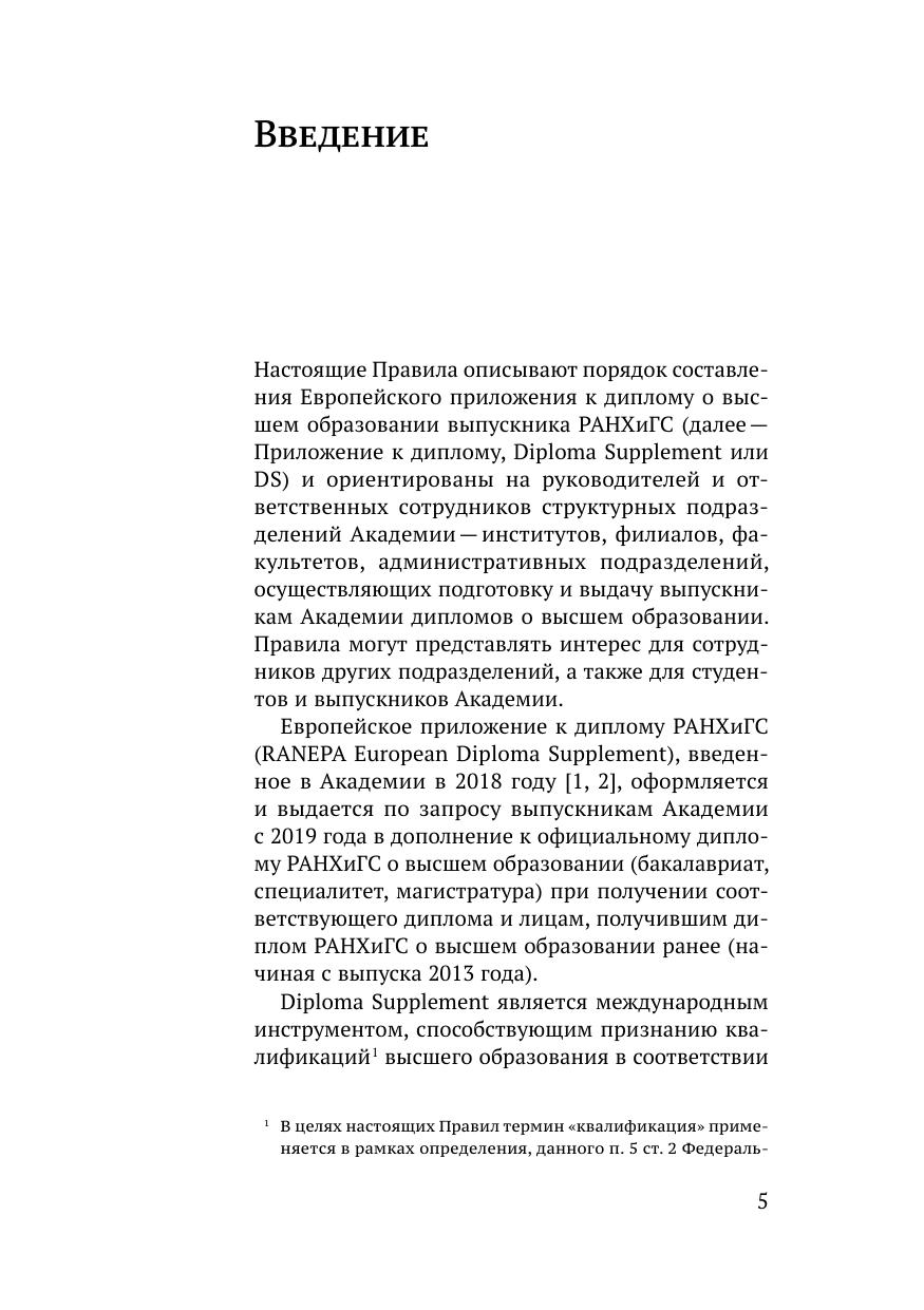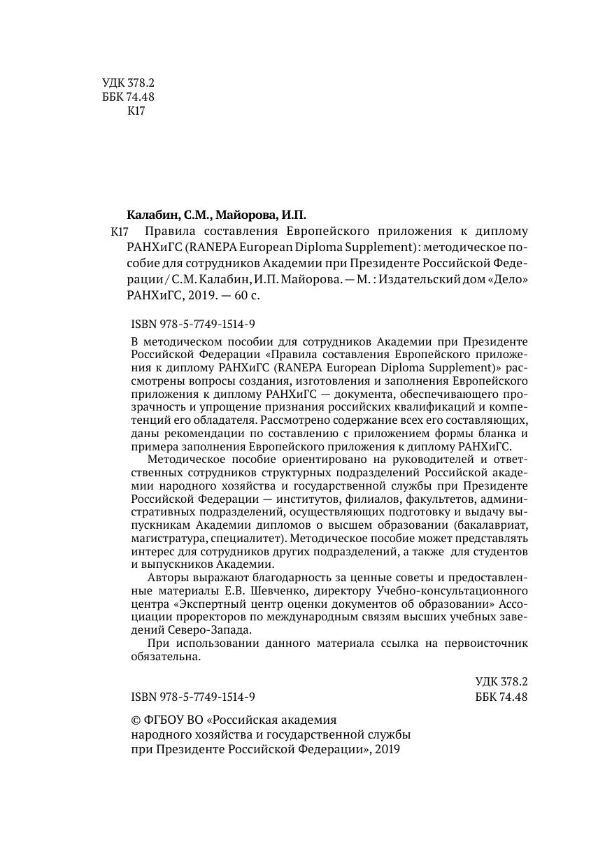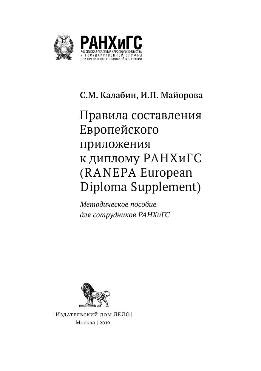 В методическом пособии для сотрудников Академии при Президенте Российской Федерации «Правила составления Европейского приложения к диплому РАНХиГС (RANEPA European Diploma Supplement)» рассмотрены вопросы создания, изготовления и заполнения Европейского приложения к диплому РАНХиГС — документа, обеспечивающего прозрачность и упрощение признания российских квалификаций и компетенций его обладателя. Рассмотрено содержание всех его составляющих, даны рекомендации по составлению с приложением формы бланка и примера заполнения Европейского приложения к диплому РАНХиГС. Методическое пособие ориентировано на руководителей и ответственных сотрудников структурных подразделений Российской академии народного хозяйства и государственной службы при Президенте Российской Федерации — институтов, филиалов, факультетов, административных подразделений, осуществляющих подготовку и выдачу выпускникам Академии дипломов о высшем образовании (бакалавриат, магистратура, специалитет). Методическое пособие может представлять интерес для сотрудников других подразделений, а также для студентов и выпускников Академии. Авторы выражают благодарность за ценные советы и предоставленные материалы Е.В. Шевченко, директору Учебно-консультационного центра «Экспертный центр оценки документов об образовании» Ассоциации проректоров по международным связям высших учебных заведений Северо-Запада. При использовании данного материала ссылка на первоисточник обязательна.
