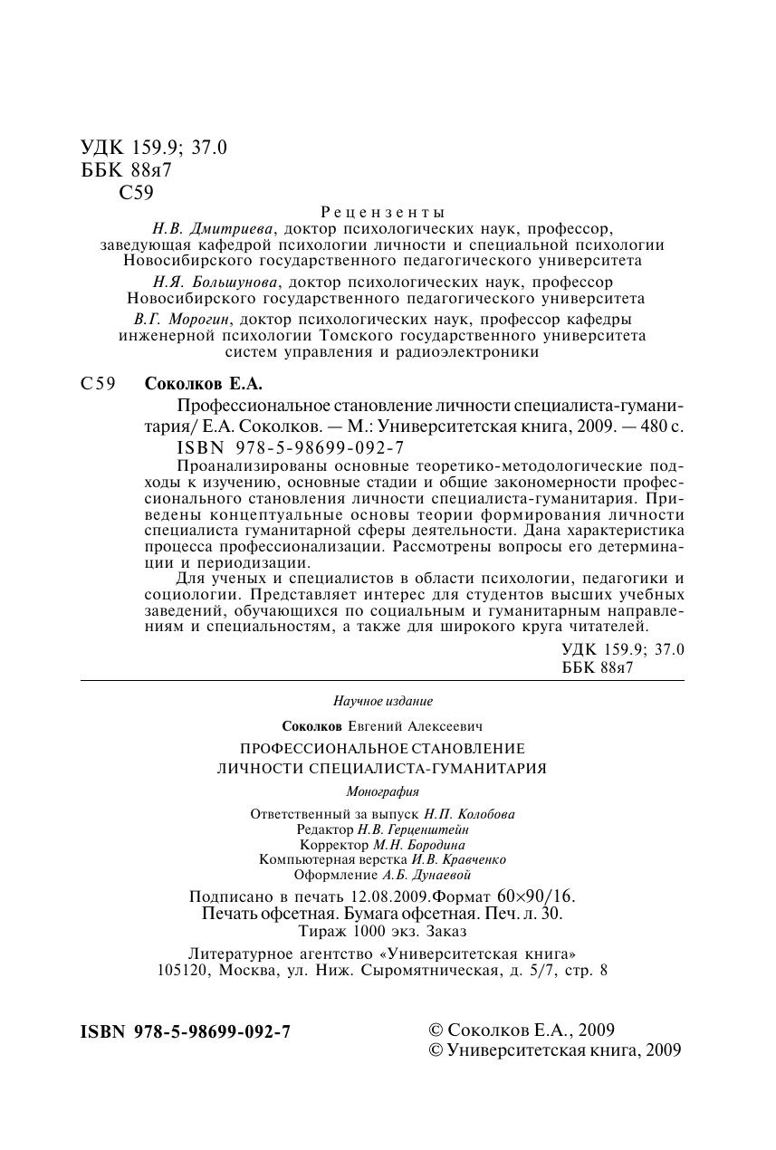 Проанализированы основные теоретико-методологические подходы к изучению, основные стадии и общие закономерности профессионального становления личности специалиста-гуманитария. Приведены концептуальные основы теории формирования личности специалиста гуманитарной сферы деятельности. Дана характеристика процесса профессионализации. Рассмотрены вопросы его детерминации и периодизации. Для ученых и специалистов в области психологии, педагогики и социологии. Представляет интерес для студентов высших учебных заведений, обучающихся по социальным и гуманитарным направлениям и специальностям, а также для широкого круга читателей.