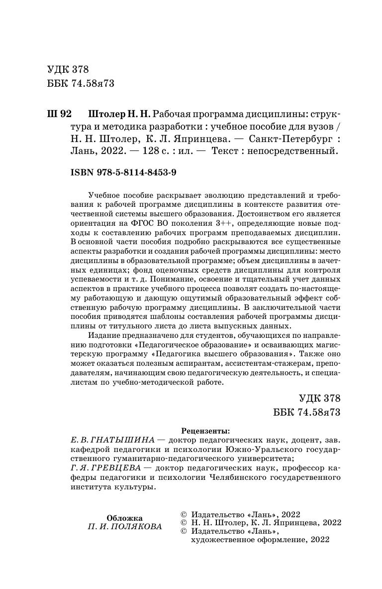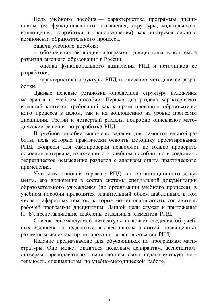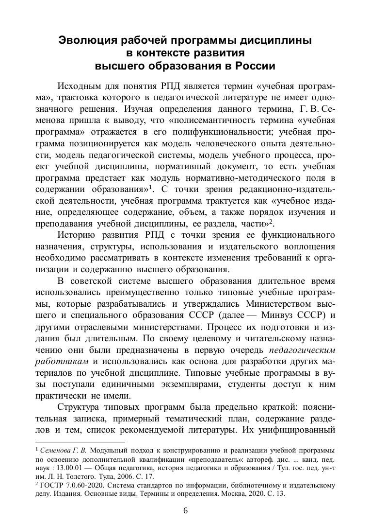 Учебное пособие раскрывает эволюцию представлений и требования к рабочей программе дисциплины в контексте развития отечественной системы высшего образования. Достоинством его является ориентация на ФГОС ВО поколения 3++, определяющие новые подходы к составлению рабочих программ преподаваемых дисциплин. В основной части пособия подробно раскрываются все существенные аспекты разработки и создания рабочей программы дисциплины: место дисциплины в образовательной программе; объем дисциплины в зачетных единицах; фонд оценочных средств дисциплины для контроля успеваемости и т. д. Понимание, освоение и тщательный учет данных аспектов в практике учебного процесса позволят создать по-настоящему работающую и дающую ощутимый образовательный эффект собственную рабочую программу дисциплины. В заключительной части пособия приводятся шаблоны составления рабочей программы дисциплины от титульного листа до листа выпускных данных.