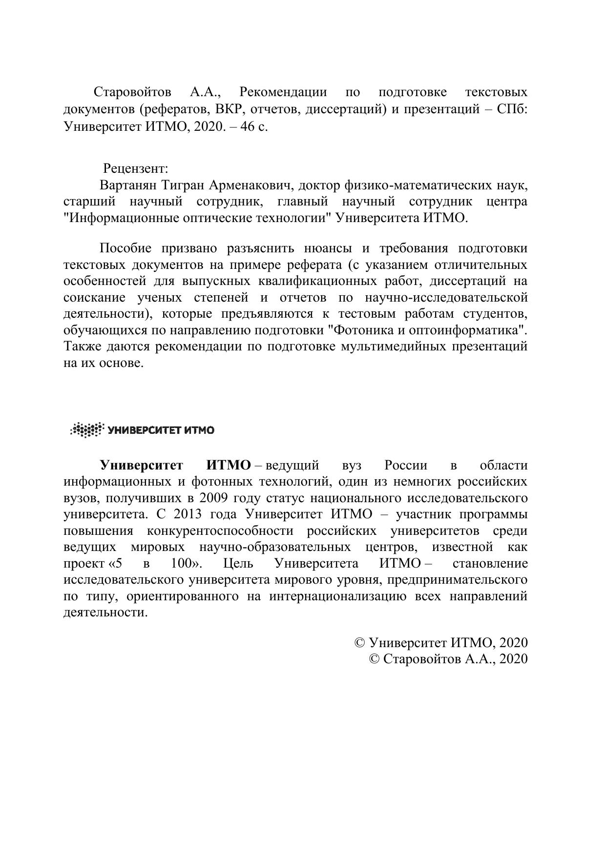 Пособие призвано разъяснить нюансы и требования подготовки текстовых документов на примере реферата (с указанием отличительных особенностей для выпускных квалификационных работ, диссертаций на соискание ученых степеней и отчетов по научно-исследовательской деятельности), которые предъявляются к тестовым работам студентов, обучающихся по направлению подготовки "Фотоника и оптоинформатика". Также даются рекомендации по подготовке мультимедийных презентаций на их основе.