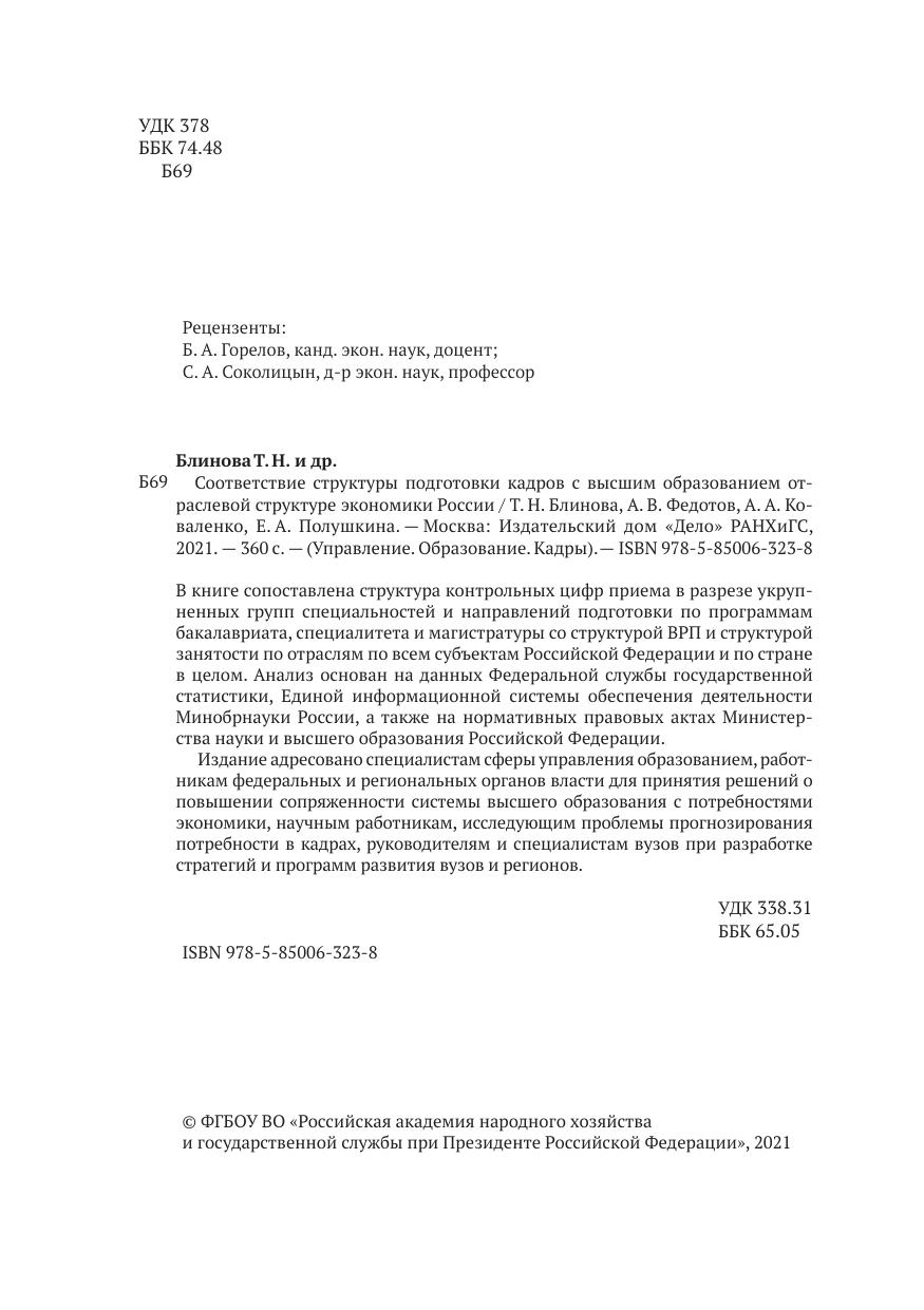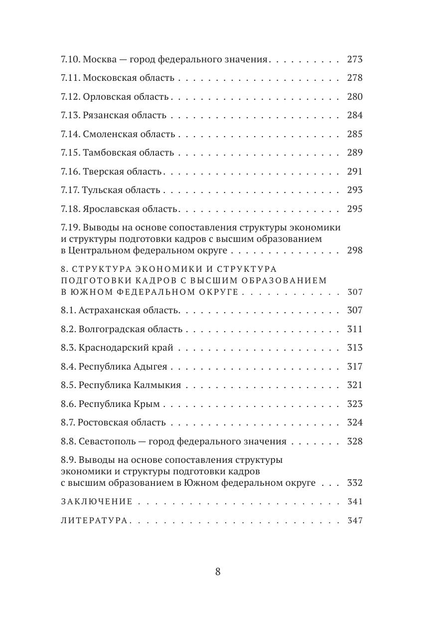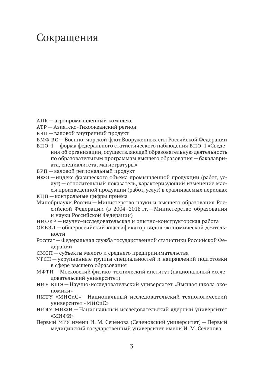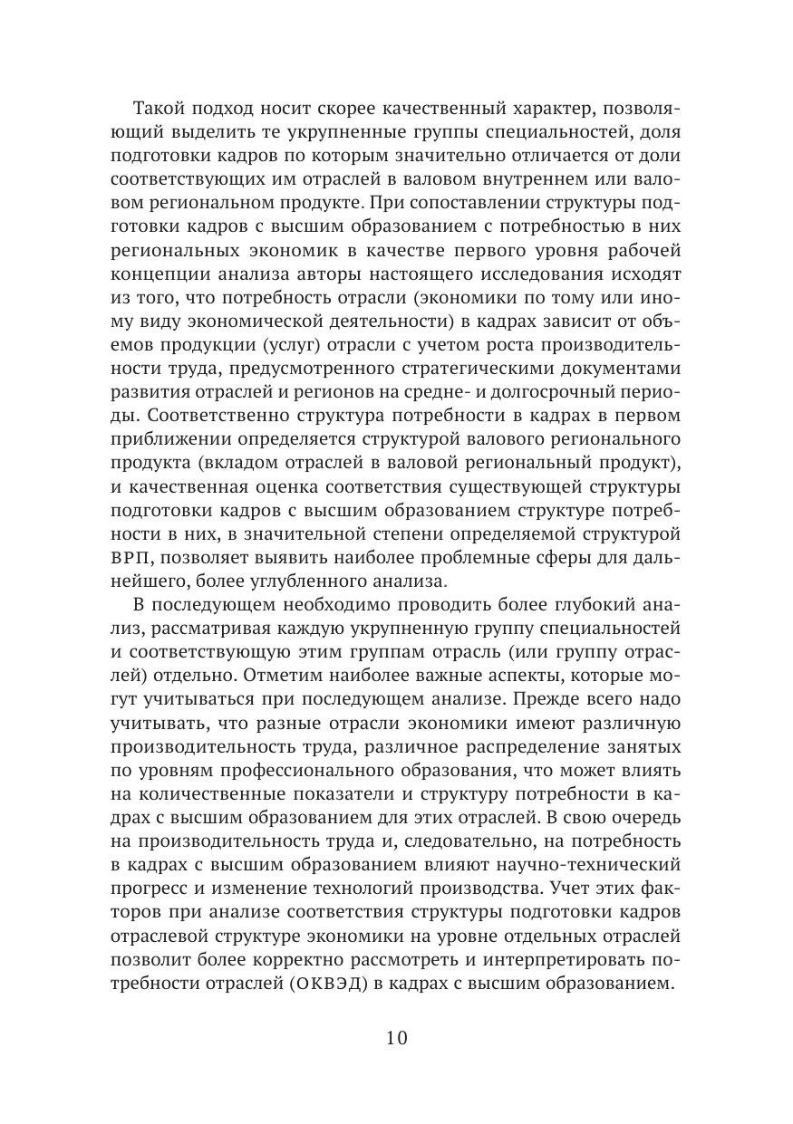 В книге сопоставлена структура контрольных цифр приема в разрезе укрупненных групп специальностей и направлений подготовки по программам бакалавриата, специалитета и магистратуры со структурой ВРП и структурой занятости по отраслям по всем субъектам Российской Федерации и по стране в целом. Анализ основан на данных Федеральной службы государственной статистики, Единой информационной системы обеспечения деятельности Минобрнауки России, а также на нормативных правовых актах Министерства науки и высшего образования Российской Федерации.