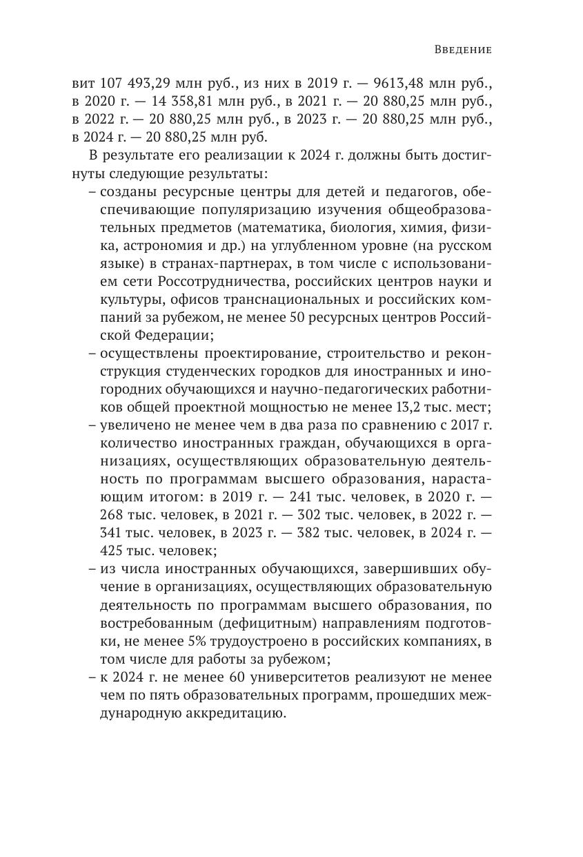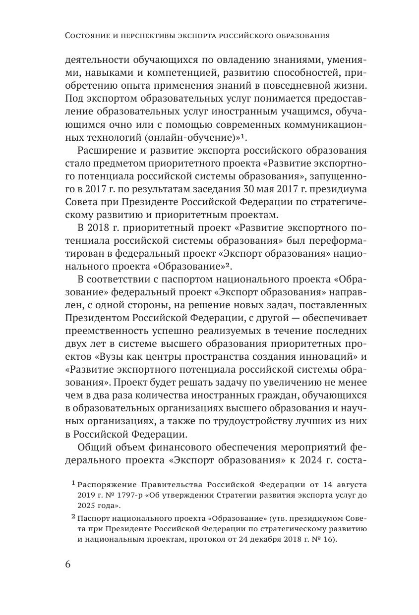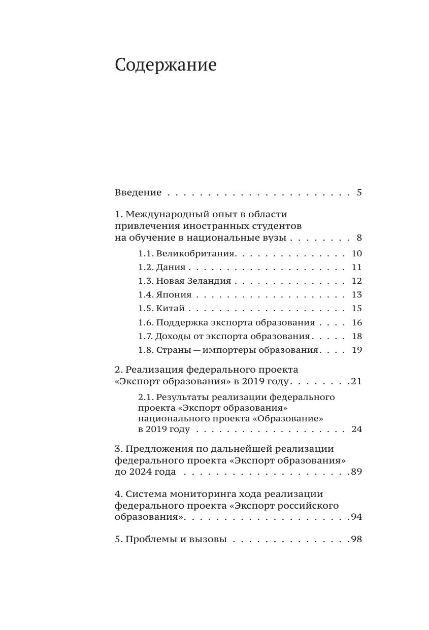 В обзоре отражены состояние и основные тенденции в области экспорта образования, мировой опыт; приоритетные направления развития экспорта российского образования, выявлены проблемные аспекты; определены факторы, тормозящие развитие экспорта российского образования, сформулированы рекомендации о развитии экспорта образовательных услуг и перспективы достижения показателей федерального проекта «Экспорт образования к 2024 году». Пристальное внимание уделено контролю за реализацией основных мероприятий проекта, национального проекта «Образование» в 2019 г. рекомендациям и предложениям по мероприятиям 2020-2024 гг.