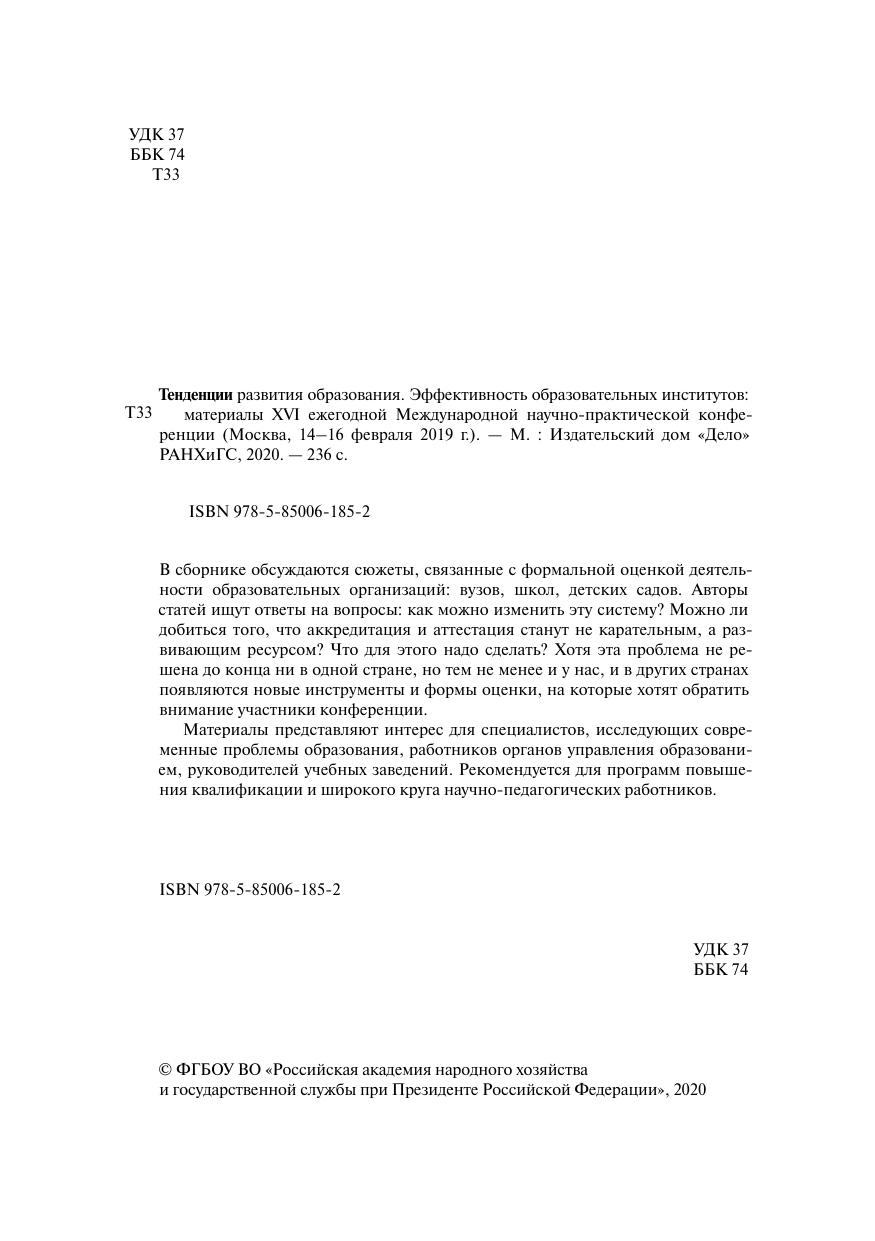В сборнике обсуждаются сюжеты, связанные с формальной оценкой деятельности образовательных организаций: вузов, школ, детских садов. Автор статей ищут ответы на вопросы: как можно изменить эту систему? Можно ли добиться того, что аккредитация и аттестация станут не карательным, а развивающим ресурсом? Что для этого надо сделать? Хотя эта проблема не решена до конца ни в одной стране, но тем не менее и у нас, и в других странах появляются новые инструменты и формы оценки, на которые хотят обратить внимание участники конференции. Материалы представляют интерес для специалистов, исследующих современные проблемы образования, работников органов управления образованием, руководителей учебных заведений. Рекомендуется для программ повышения квалификации и широкого круга научно-педагогических работников.