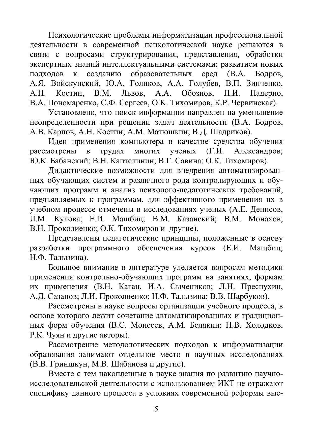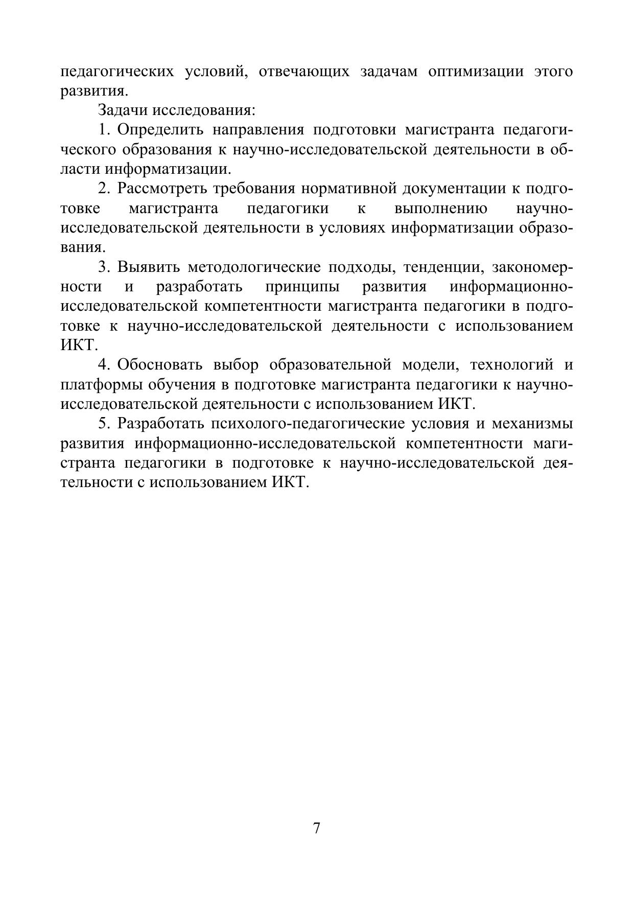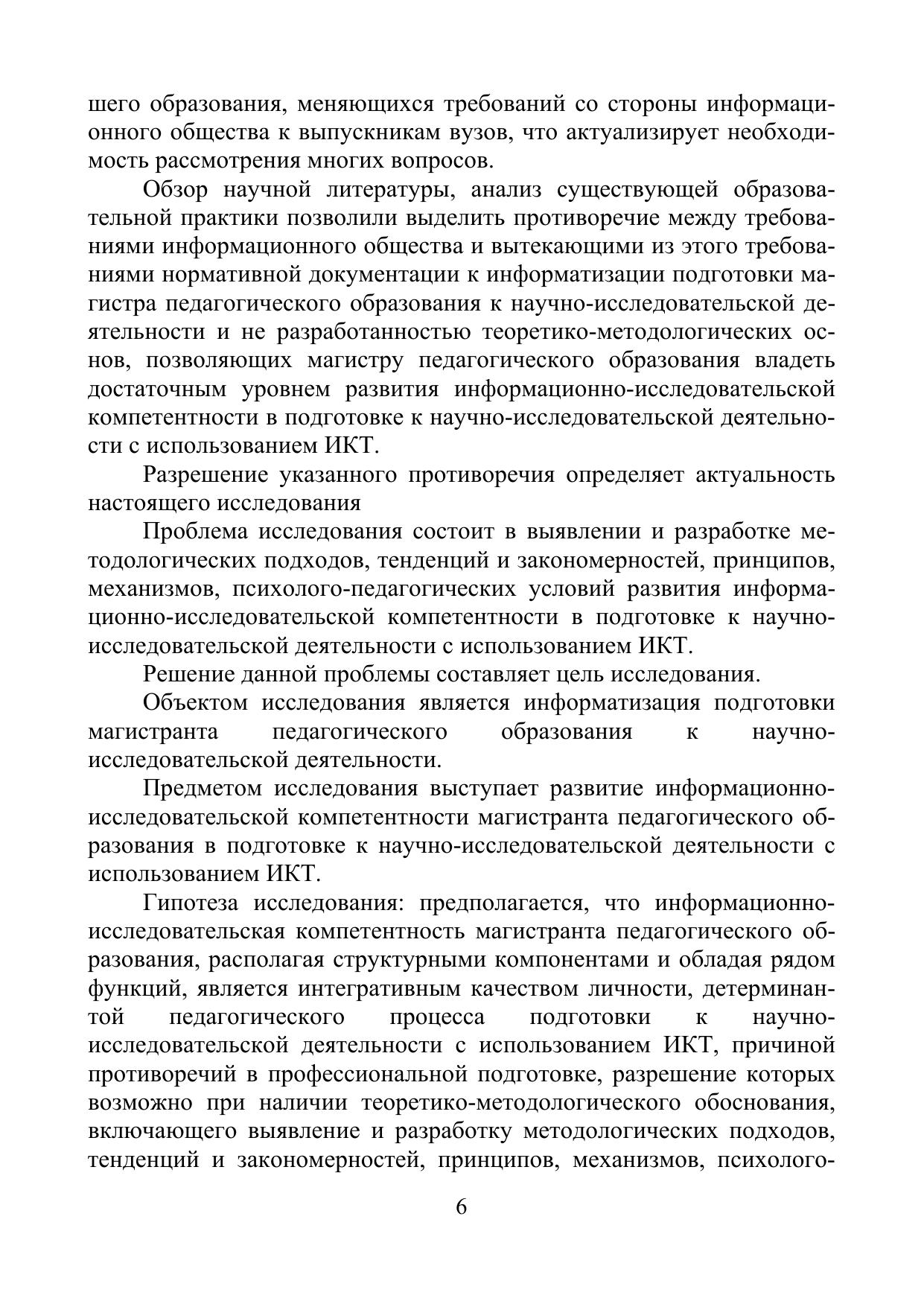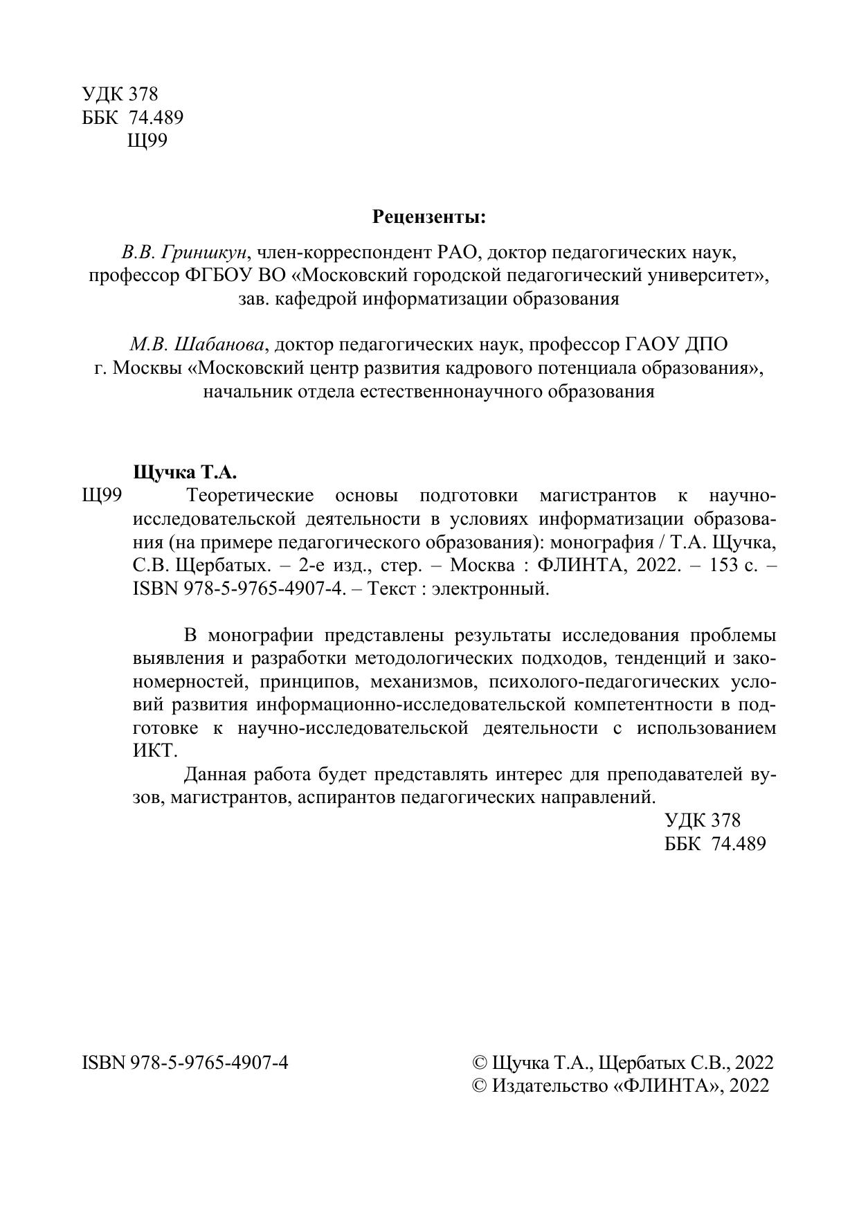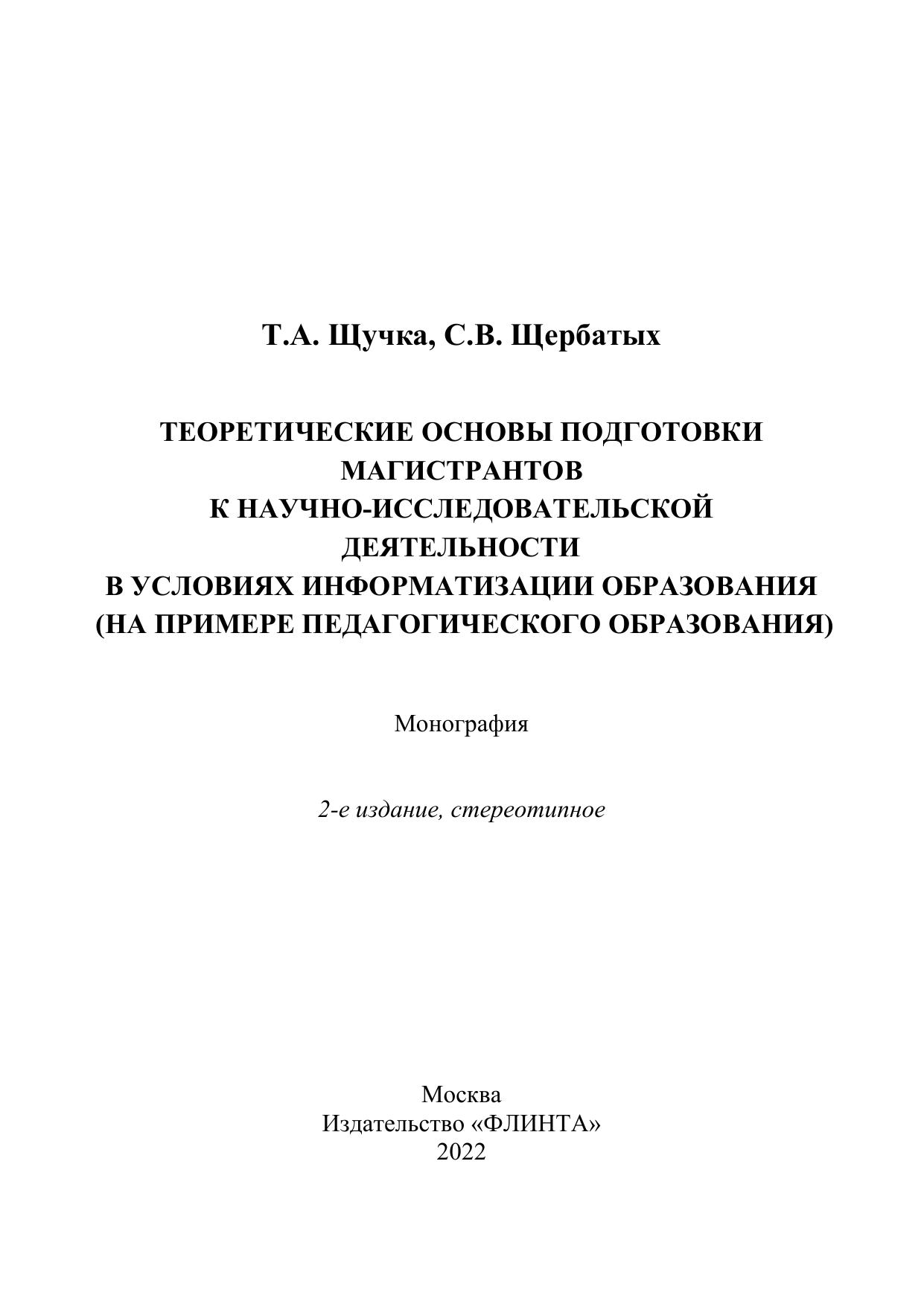 В монографии представлены результаты исследования проблемы выявления и разработки методологических подходов, тенденций и закономерностей, принципов, механизмов, психолого-педагогических условий развития информационно-исследовательской компетентности в подготовке к научно-исследовательской деятельности с использованием ИКТ.