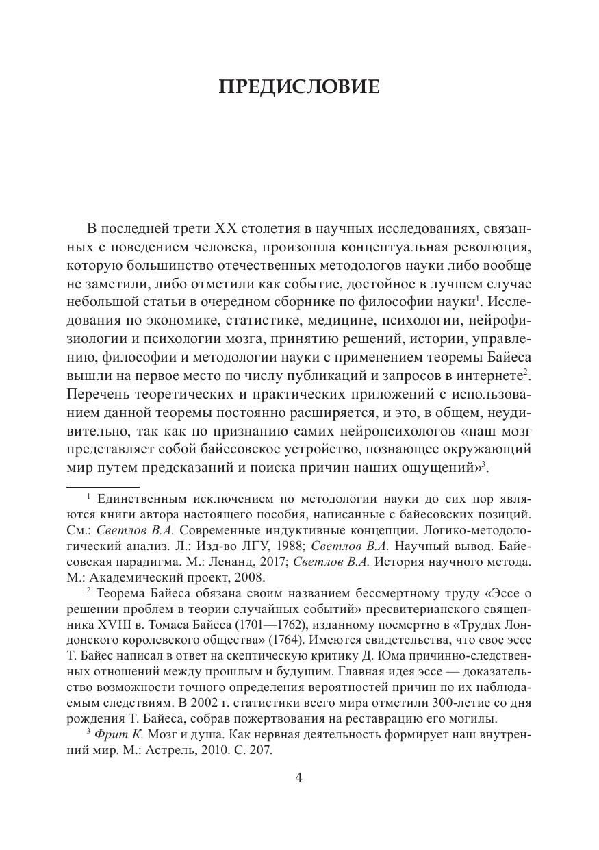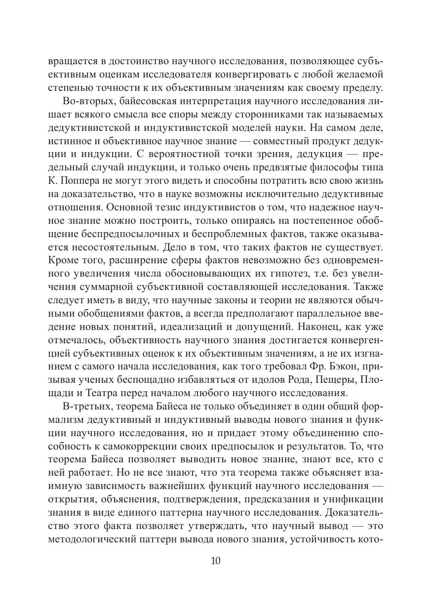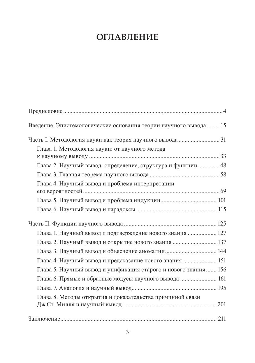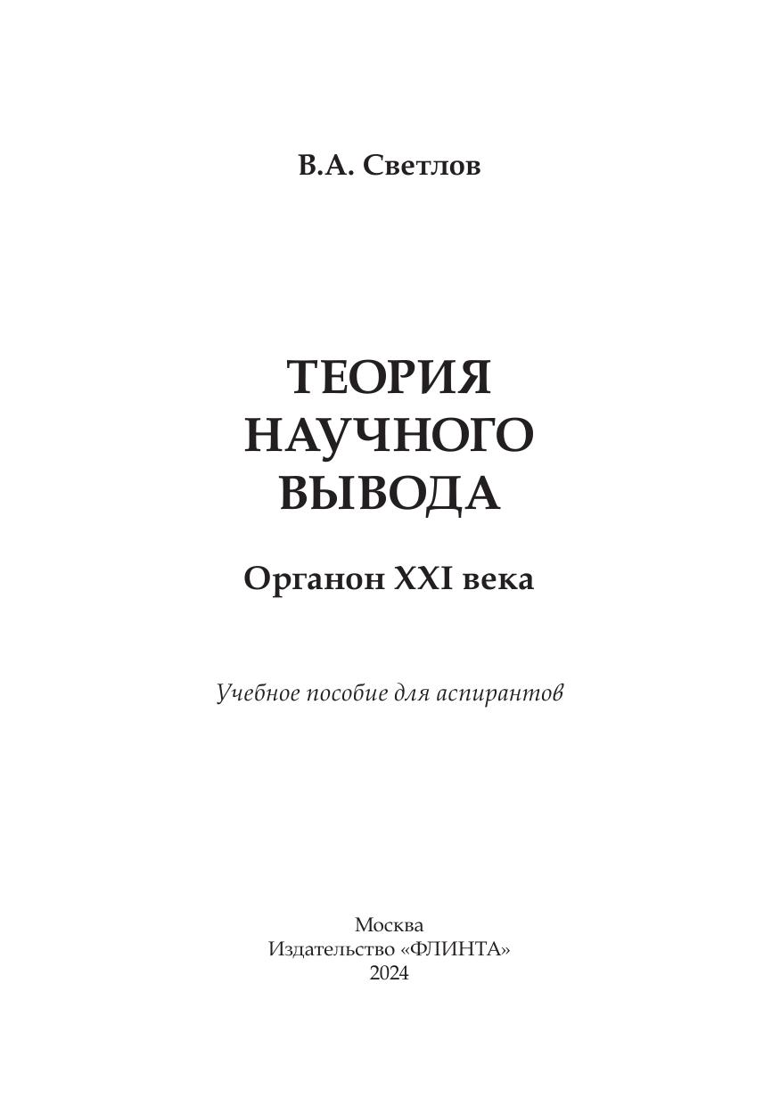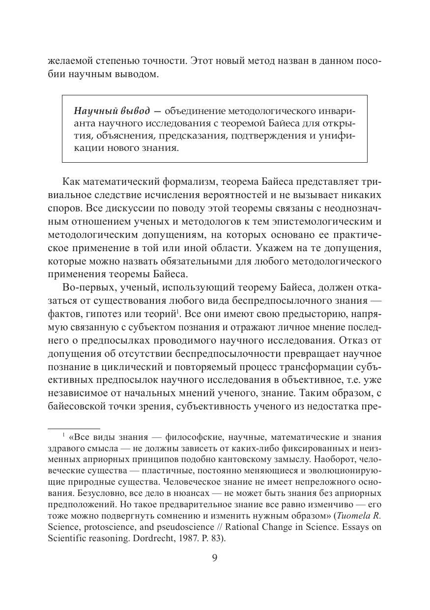 В пособии развивается взгляд на методологию науки как теорию научного вывода. Под научным выводом понимается объединение методологического инварианта научного исследования с теоремой Байеса в качестве единого математического формализма для открытия, объяснения, предсказания, подтверждения и унификации нового знания. В первой части пособия анализируются эпистемологические и методологические основания теории научного вывода. Определяются понятия методологического инварианта научного исследования, научного вывода и его структурных компонентов — объяснительного и предсказательного циклов; объясняется динамика открытия и обоснования нового знания в терминах вероятностных функций теоремы Байеса; исследуется связь научного вывода с индуктивной интерпретацией вероятностей, теоремой репрезентации Б. де Финетти и законом больших чисел. Универсальный характер научного вывода демонстрируется на примере решения проблемы индукции и некоторых специальных вероятностных парадоксов научного вывода. Во второй части пособия раскрывается фундаментальная связь научного вывода с открытием, объяснением, подтверждением, предсказанием и унификацией нового научного знания; доказываются специальные теоремы, формализующие особенности перечисленных функций научного вывода; формулируются и доказываются основные прямые и обратные модусы научного вывода, включая вывод по аналогии и методы причинно-следственной связи Дж.С. Милля. Техника применения модусов научного вывода демонстрируется на примерах из научной и художественной литературы.