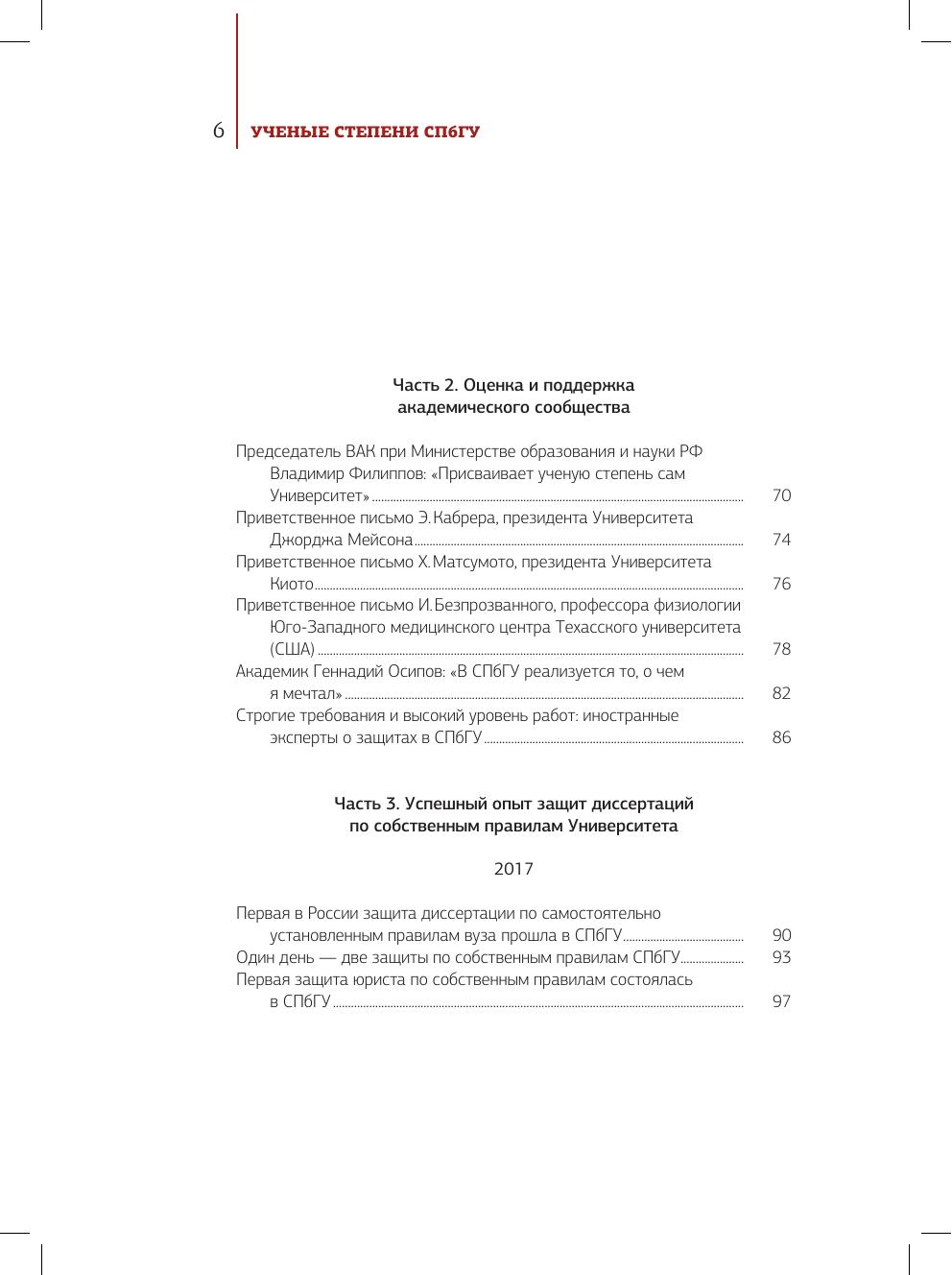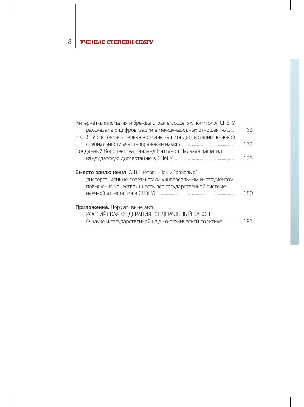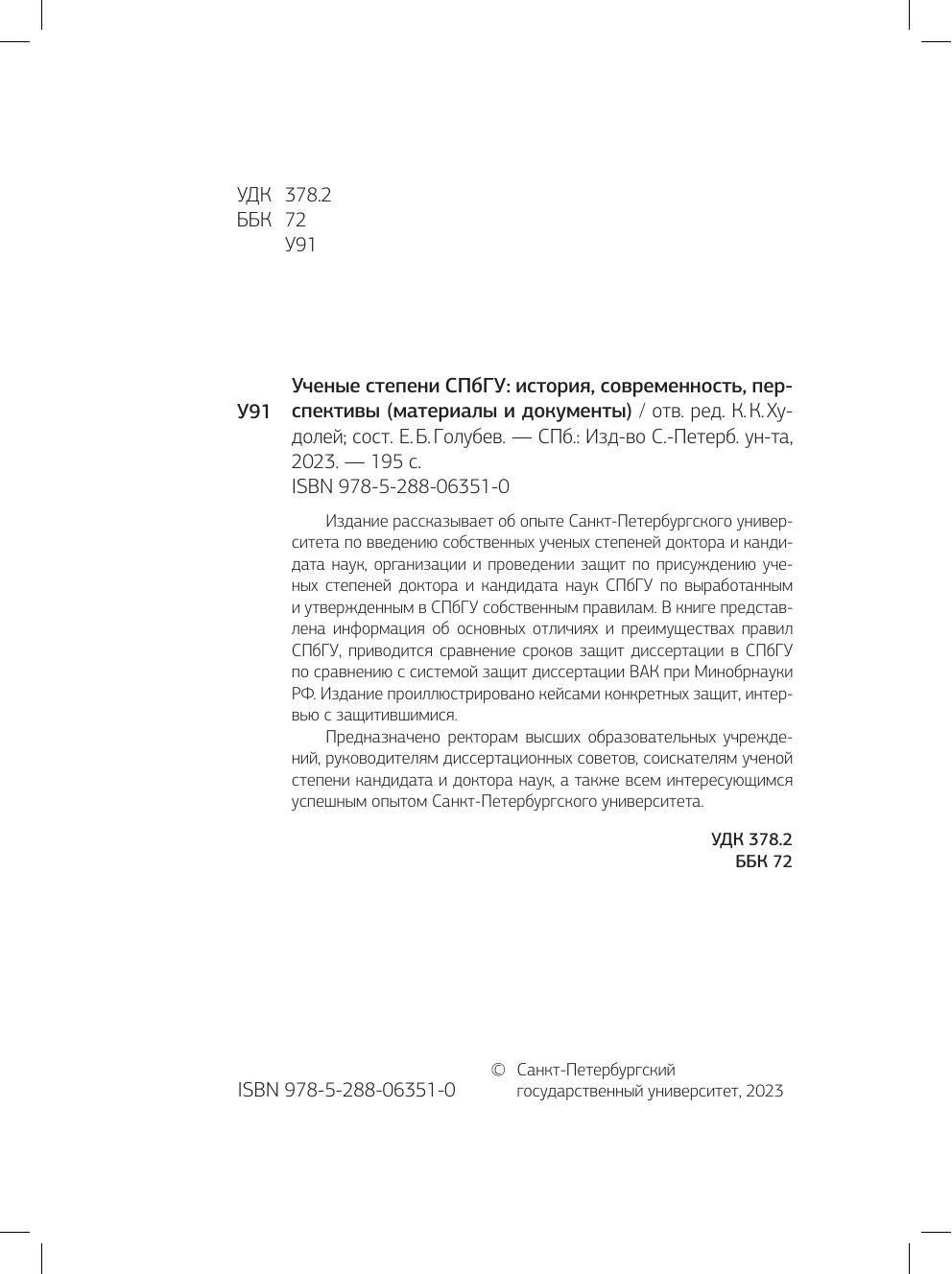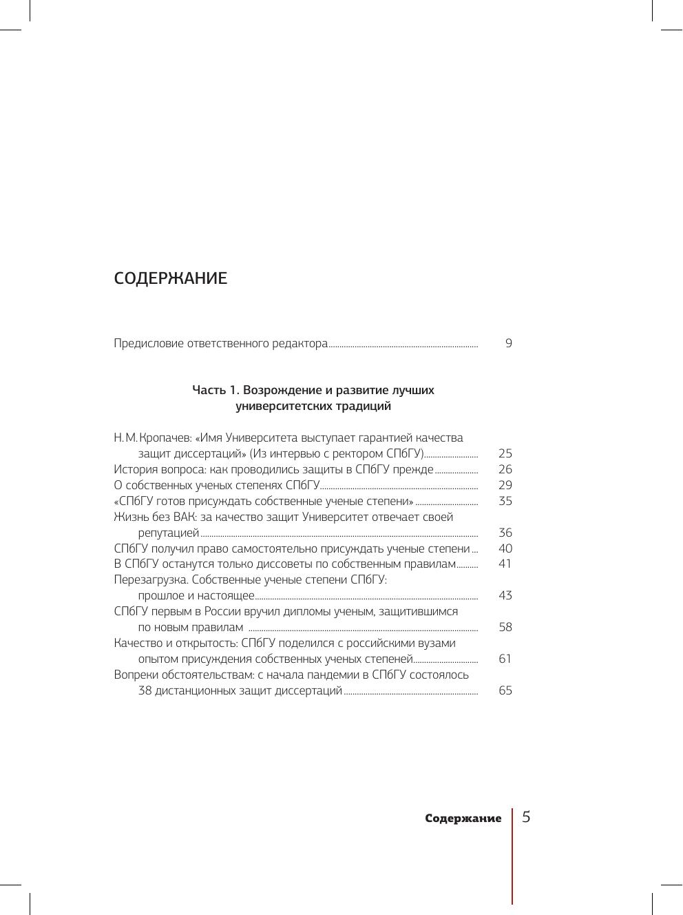 Издание рассказывает об опыте Санкт-Петербургского университета по введению собственных ученых степеней доктора и кандидата наук, организации и проведении защит по присуждению ученых степеней доктора и кандидата наук СПбГУ по выработанным и утвержденным в СПбГУ собственным правилам. В книге представлена информация об основных отличиях и преимуществах правил СПбГУ, приводится сравнение сроков защит диссертации в СПбГУ по сравнению с системой защит диссертации ВАК при Минобрнауки РФ. Издание проиллюстрировано кейсами конкретных защит, интервью с защитившимися. Предназначено ректорам высших образовательных учреждений, руководителям диссертационных советов, соискателям ученой степени кандидата и доктора наук, а также всем интересующимся успешным опытом Санкт-Петербургского университета.