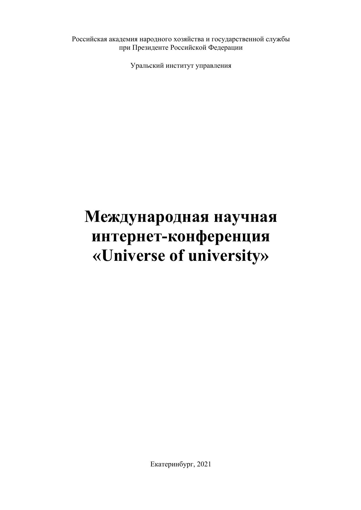 В сборнике представлены материалы Международной научной интернет-конференции «Universe of university», организатором которой выступил Уральский институт управления – филиал Российской академии народного хозяйства и государственной службы при Президенте Российской Федерации. Участниками конференции были рассмотрены актуальные проблемы высшего образования и представлены возможные пути их решения.