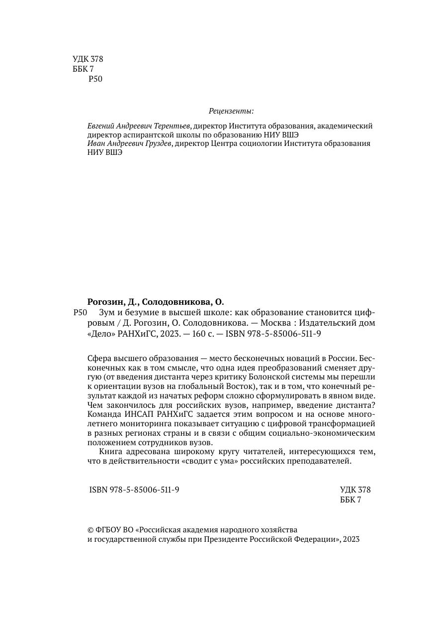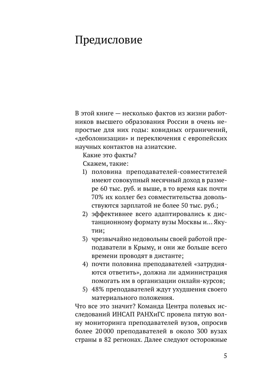 Сфера высшего образования — место бесконечных новаций в России. Бесконечных как в том смысле, что одна идея преобразований сменяет другую (от введения дистанта через критику Болонской системы мы перешли к ориентации вузов на глобальный Восток), так и в том, что конечный результат каждой из начатых реформ сложно сформулировать в явном виде. Чем закончилось для российских вузов, например, введение дистанта? Команда ИНСАП РАНХиГС задается этим вопросом и на основе многолетнего мониторинга показывает ситуацию с цифровой трансформацией в разных регионах страны и в связи с общим социально-экономическим положением сотрудников вузов. Книга адресована широкому кругу читателей, интересующихся тем, что в действительности «сводит с ума» российских преподавателей.