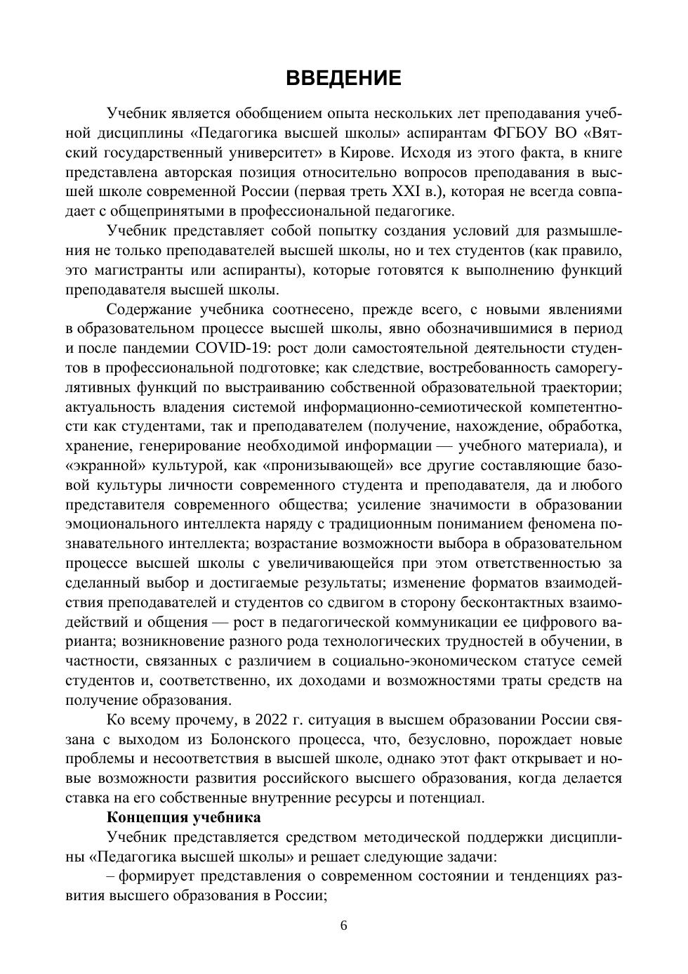 Учебник включает основные вопросы педагогики высшей школы: методологию, ди-дактику, теорию и методику воспитания, — проецирующиеся на преподавание профильных дисциплин. Изложение выполнено с учетом психологических особенностей современных студентов, что объясняет включение в текст большого количества рисунков, обобщающих схем, интеллект-карт и таблиц, помогающих читателю «клипово» схватывать информацию и быстро переходить по ссылкам к различным источникам информации для «расширения границ» учебника. Для лучшего усвоения материала в начале каждой главы даны темы ос-новных содержательных единиц, сформулированы учебные цели, дан план изложения ма-териала. Каждый раздел заканчивается практическими заданиями, помогающими не только осмыслить учебный материал, но и сконструировать собственные смыслы как когнитивные результаты обучения. Книга будет полезна аспирантам и магистрантам, изучающим педагогику высшей школы, а также преподавателям вузов, практически претворяющим эту педагогику (выс-шей школы) в жизнь.