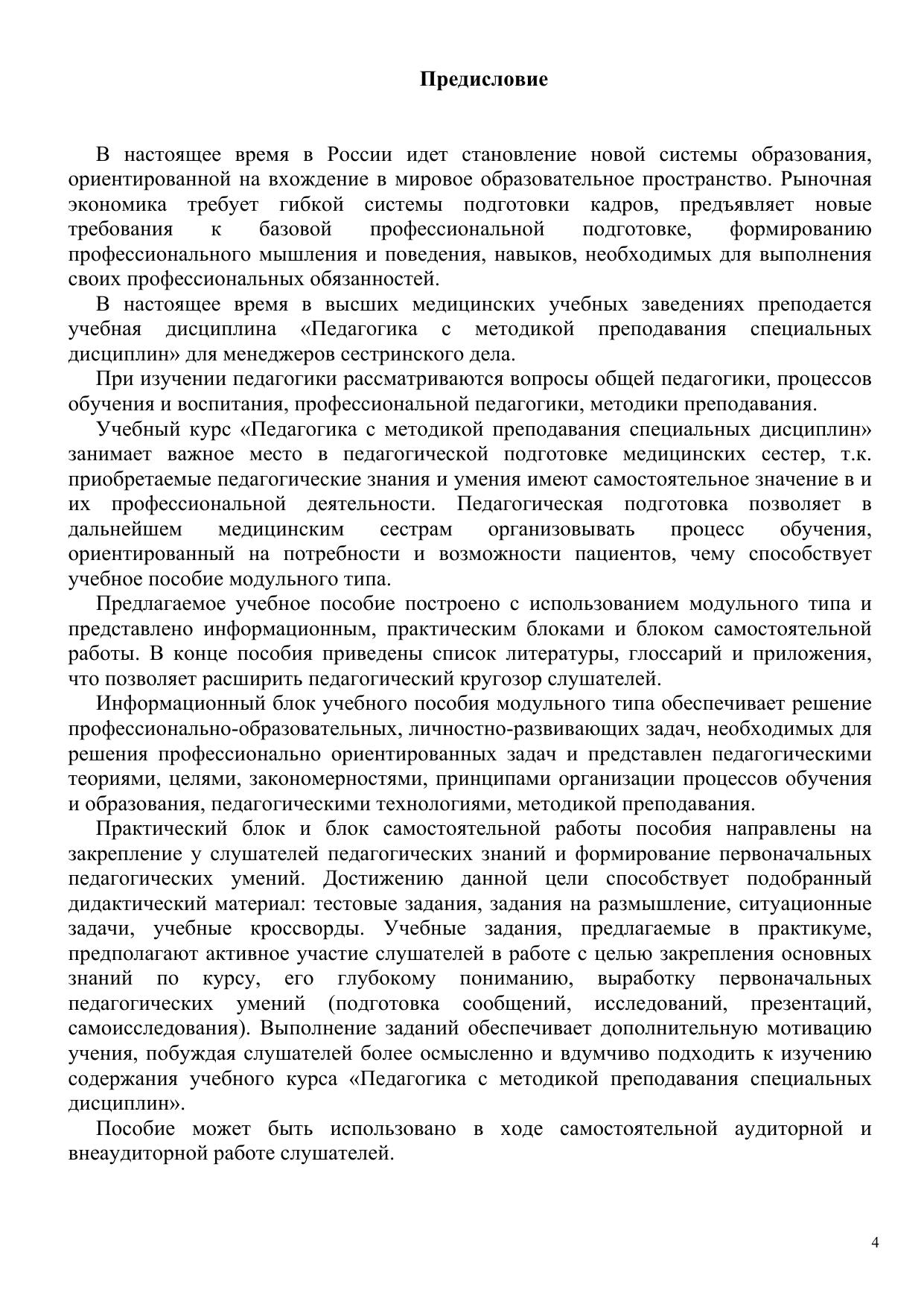 Учебное пособие модульного типа составлено в соответствии с Государственным образовательным стандартом высшего профессионального образования специальности 040600 «Сестринское дело» (квалификация «Менеджер») дисциплины «Педагогика с методикой преподавания специальных дисциплин». Учебное пособие построено с использованием модульного типа обучения, что способствует решению задач осознания роли педагогики в профессиональном и личностном становлении медицинских сестер, выявлению педагогических аспектов их профессиональной деятельности. Пособие включает информационный блок, доступные для понимания схемы, таблицы. Тестовые, творческие задания, вопросы для самоподготовки, ситуационные задачи практического блока, задания блока самостоятельной работы предназначены для контроля изучения каждой части пособия.