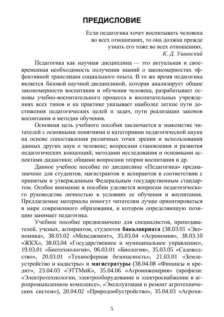 Данное учебное пособие охватывает содержание таких дисциплин, как «Педагогика» и «Педагогика и психология», которые занимают важное место в содержании бакалаврских программ на многих направлениях подготовки. В нем изложены основные принципы общей педагогики, даны ключевые понятия по таким разделам педагогики, как дидактика, теория воспитания, педагогическая культура преподавателя. В заключение изложены основные сведения по нормативно-правовому обеспечению процесса образования. Учебное пособие предназначено для студентов вузов, чтобы подготовить их к работе преподавателями в любых образовательных учреждениях: от высших до средней школы.