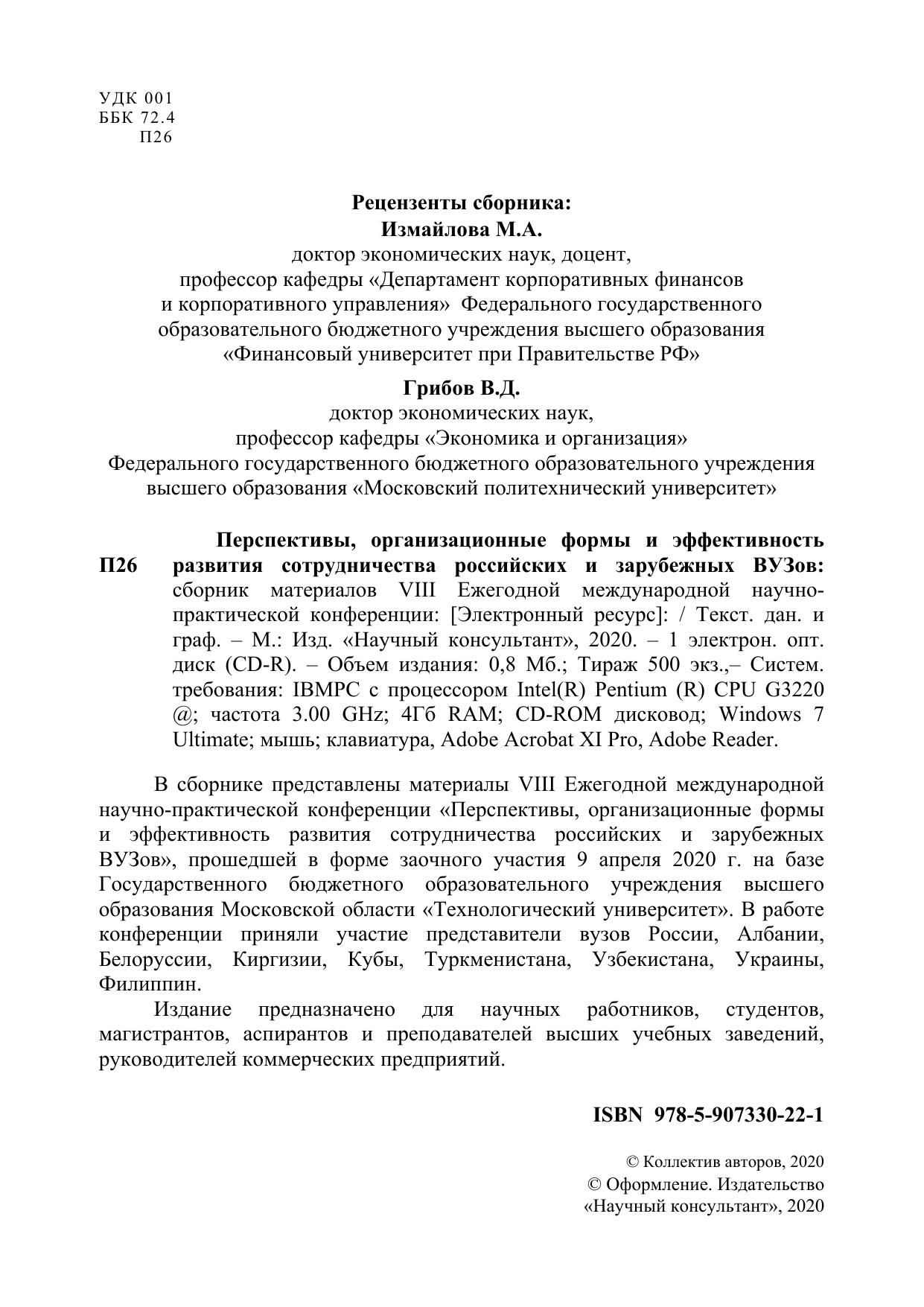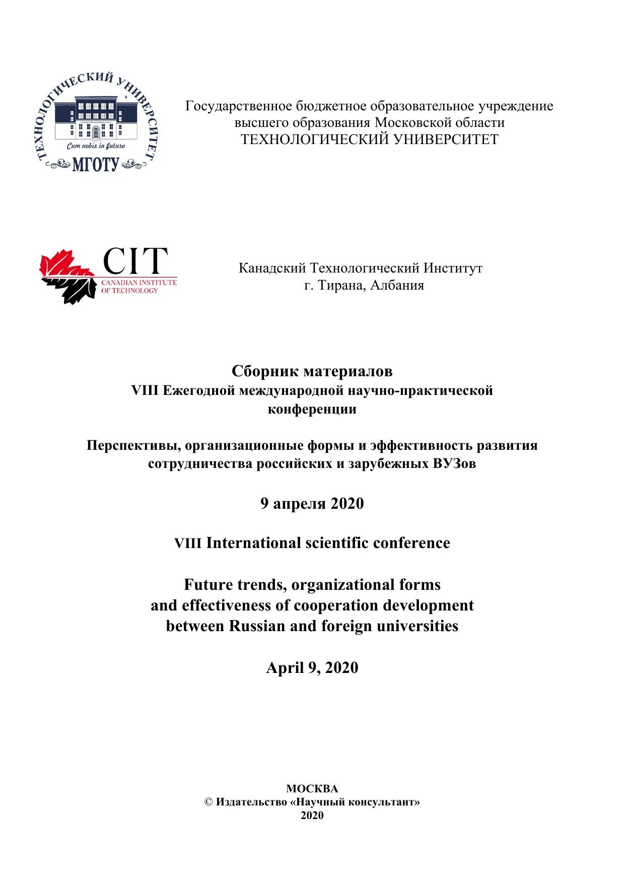 В сборнике представлены материалы VIII Ежегодной международной научно-практической конференции «Перспективы, организационные формы и эффективность развития сотрудничества российских и зарубежных ВУЗов», прошедшей в форме заочного участия 9 апреля 2020 г. на базе Государственного бюджетного образовательного учреждения высшего образования Московской области «Технологический университет». В работе конференции приняли участие представители вузов России, Албании, Белоруссии, Киргизии, Кубы, Туркменистана, Узбекистана, Украины, Филиппин.