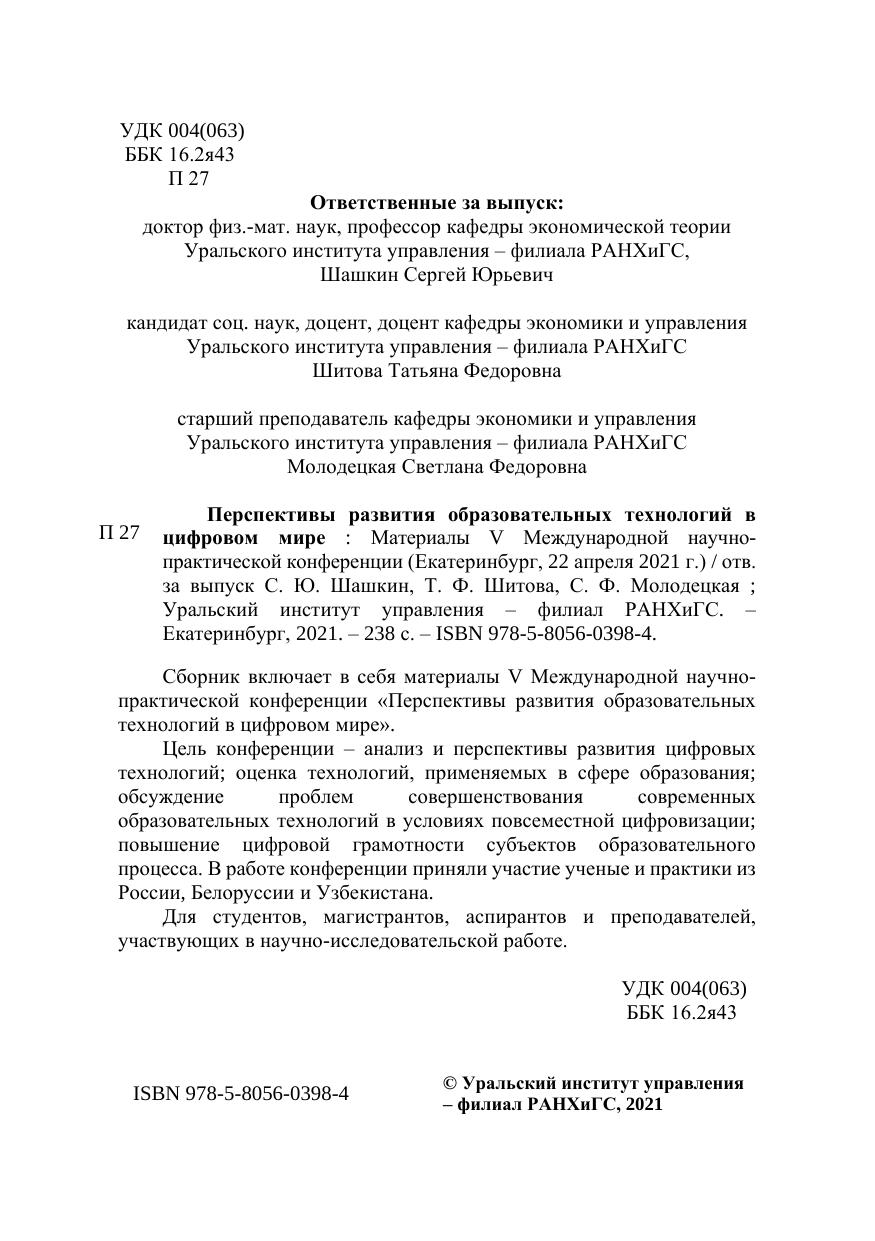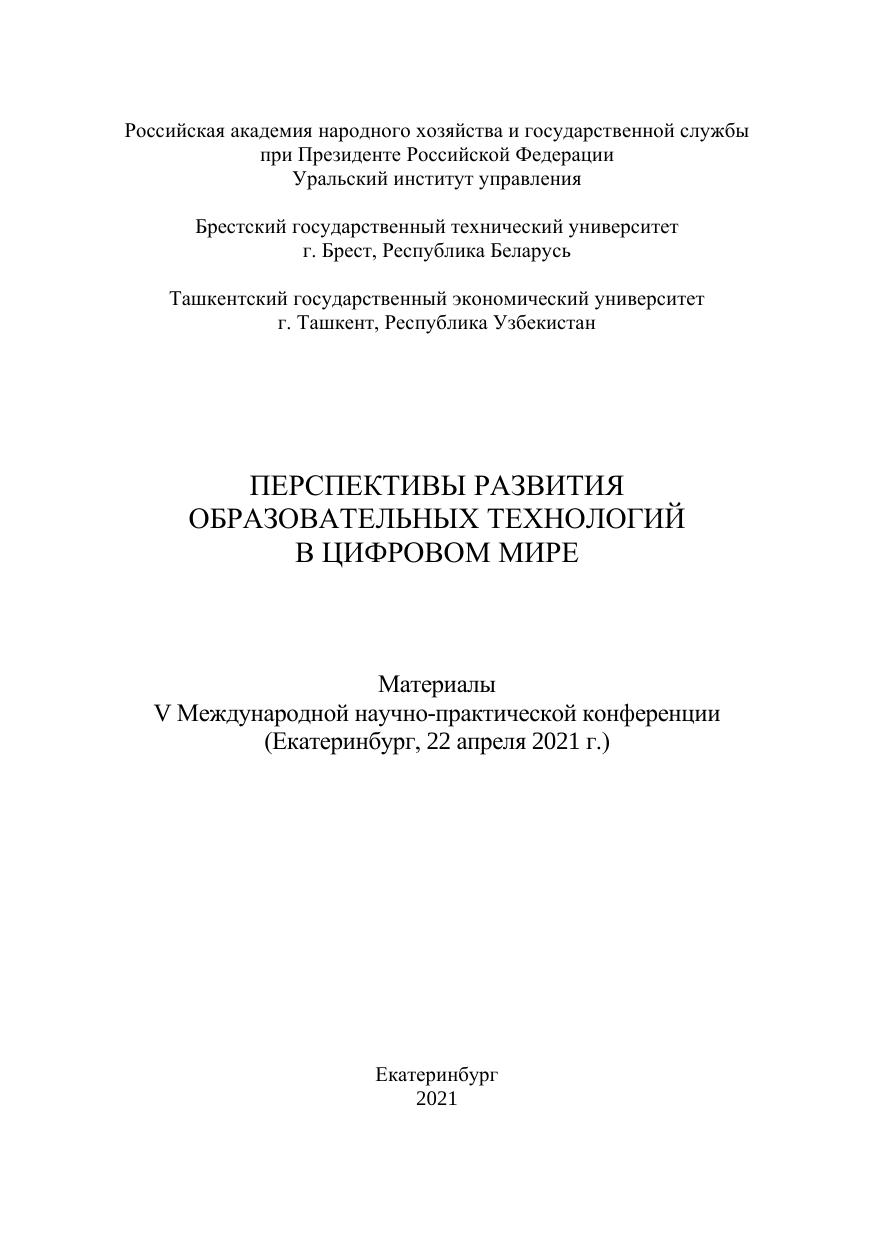 Перспективы развития образовательных технологий в цифровом мире: Материалы V Международной научно-практической конференции (Екатеринбург, 22 апреля 2021 г.)