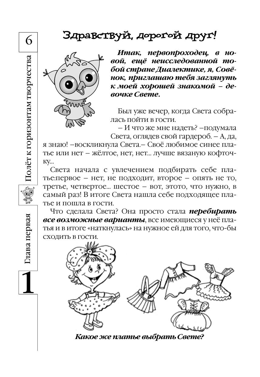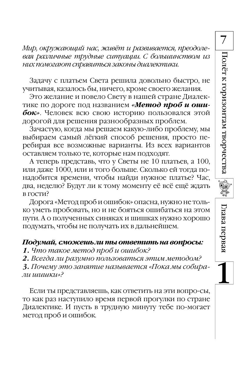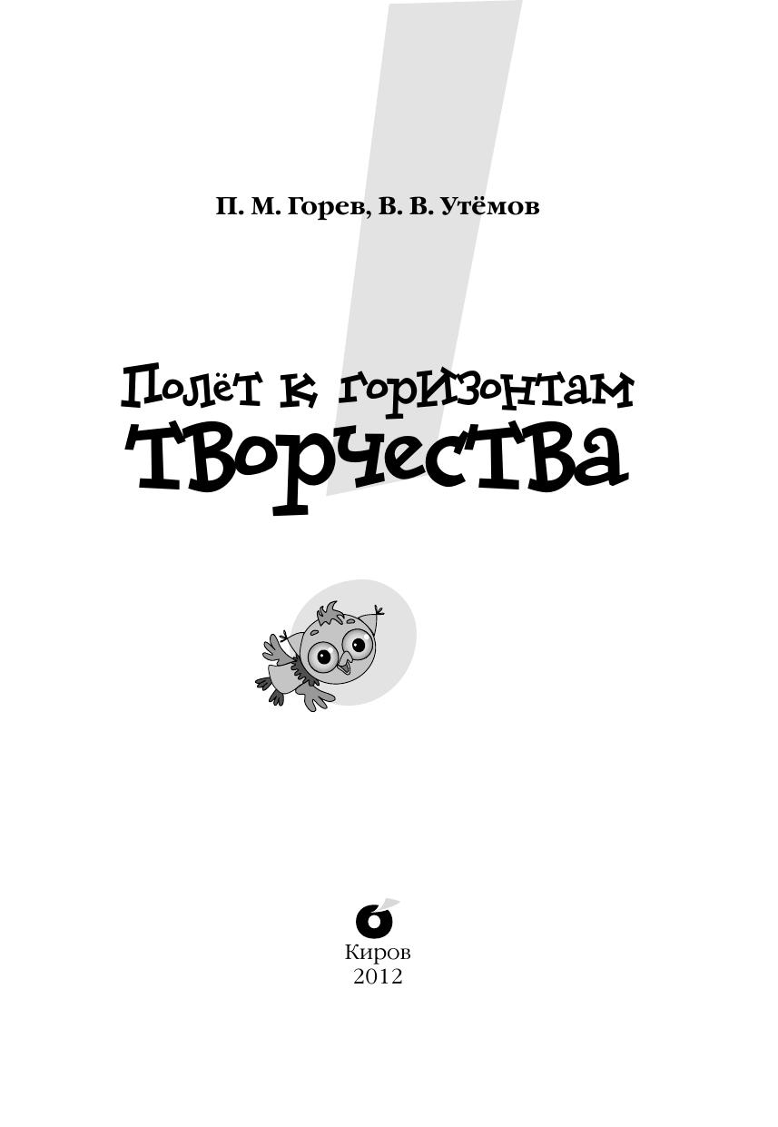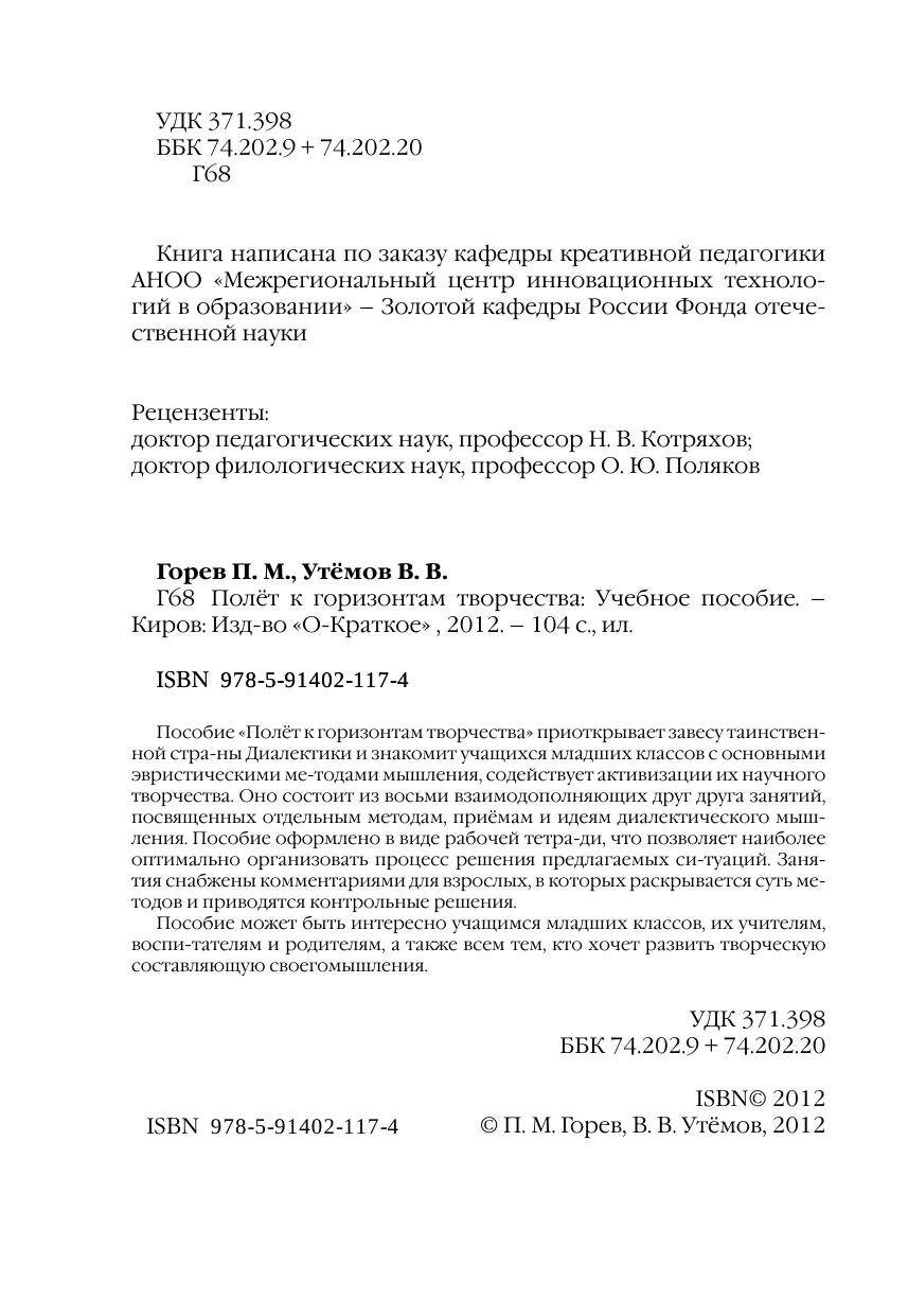 Пособие «Полёт к горизонтам творчества» приоткрывает завесу таинственной страны Диалектики и знакомит учащихся младших классов с основными эвристическими методами мышления, содействует активизации их научного творчества. Оно состоит из восьми взаимодополняющих друг друга занятий, посвященных отдельным методам, приёмам и идеям диалектического мышления. Пособие оформлено в виде рабочей тетра-ди, что позволяет наиболее оптимально организовать процесс решения предлагаемых ситуаций. Занятия снабжены комментариями для взрослых, в которых раскрывается суть методов и приводятся контрольные решения. Пособие может быть интересно учащимся младших классов, их учителям, воспитателям и родителям, а также всем тем, кто хочет развить творческую составляющую своегомышления.