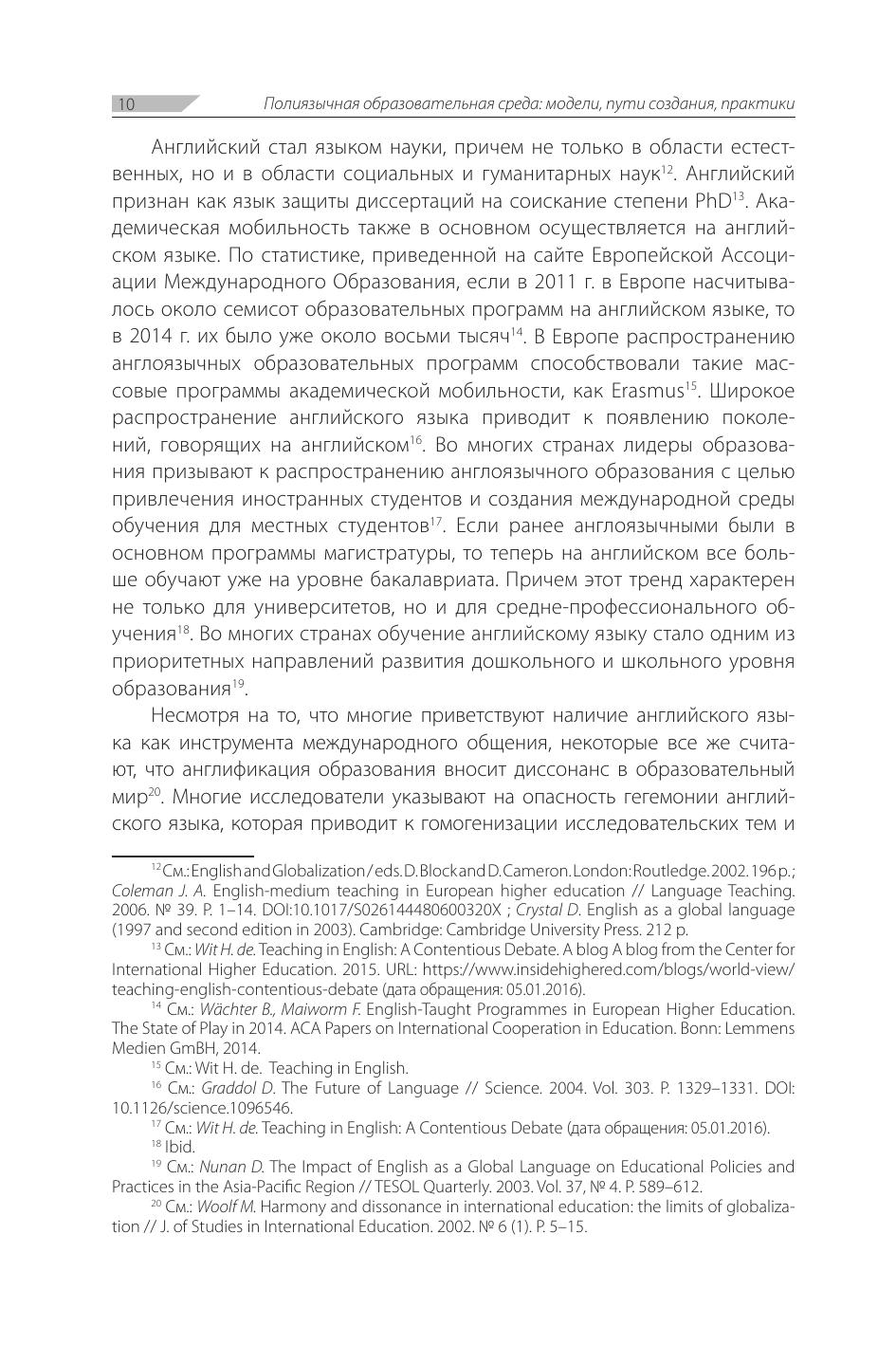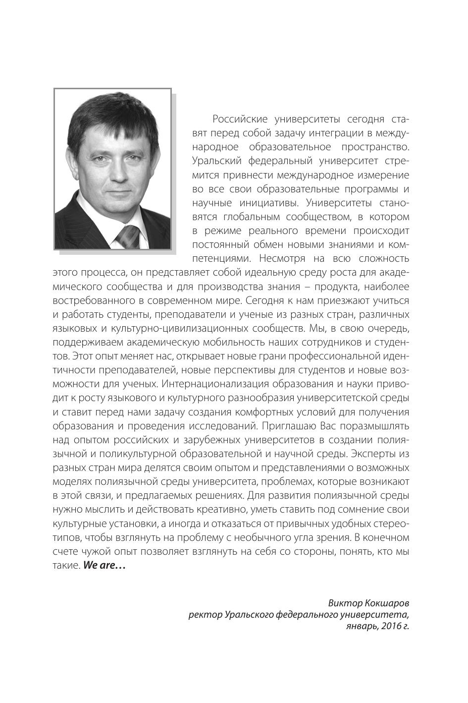 В процессе глобализации наука и образование приобретают международное измерение. Университеты во всем мире ставят перед собой задачу вхождения в международное научно-образовательное пространство. Это пространство объединяет представителей различных культур, говорящих на разных языках. Английский язык позволяет преодолеть языковые барьеры и приобретает особое значение как основной инструмент коммуникации. Однако доминирование английского языка воспринимается не только как исключительно благотворное, но и как вызывающее диссонанс в академическом сообществе. Вместе с российскими и зарубежными экспертами мы предлагаем администраторам университетов, преподавателям иностранных языков и всем, кого может интересовать данная тематика, поразмышлять над различными проблемами, решениями и моделями создания комфортной и в конечном итоге более конкурентоспособной языковой и культурной среды университетов.