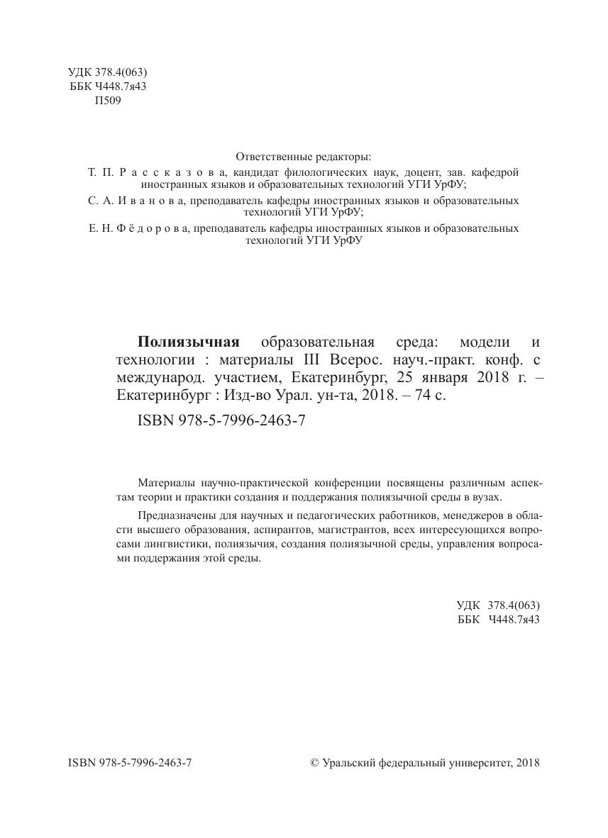 В процессе глобализации наука и образование приобретают международное измерение. Университеты во всем мире ставят перед собой задачу вхождения в международное научно-образовательное пространство. Это пространство объединяет представителей различных культур, говорящих на разных языках. Английский язык позволяет преодолеть языковые барьеры и приобретает особое значение как основной инструмент коммуникации. Однако доминирование английского языка воспринимается не только как исключительно благотворное, но и как вызывающее диссонанс в академическом сообществе. Вместе с российскими и зарубежными экспертами мы предлагаем администраторам университетов, преподавателям иностранных языков и всем, кого может интересовать данная тематика, поразмышлять над различными проблемами, решениями и моделями создания комфортной и в конечном итоге более конкурентоспособной языковой и культурной среды университетов.