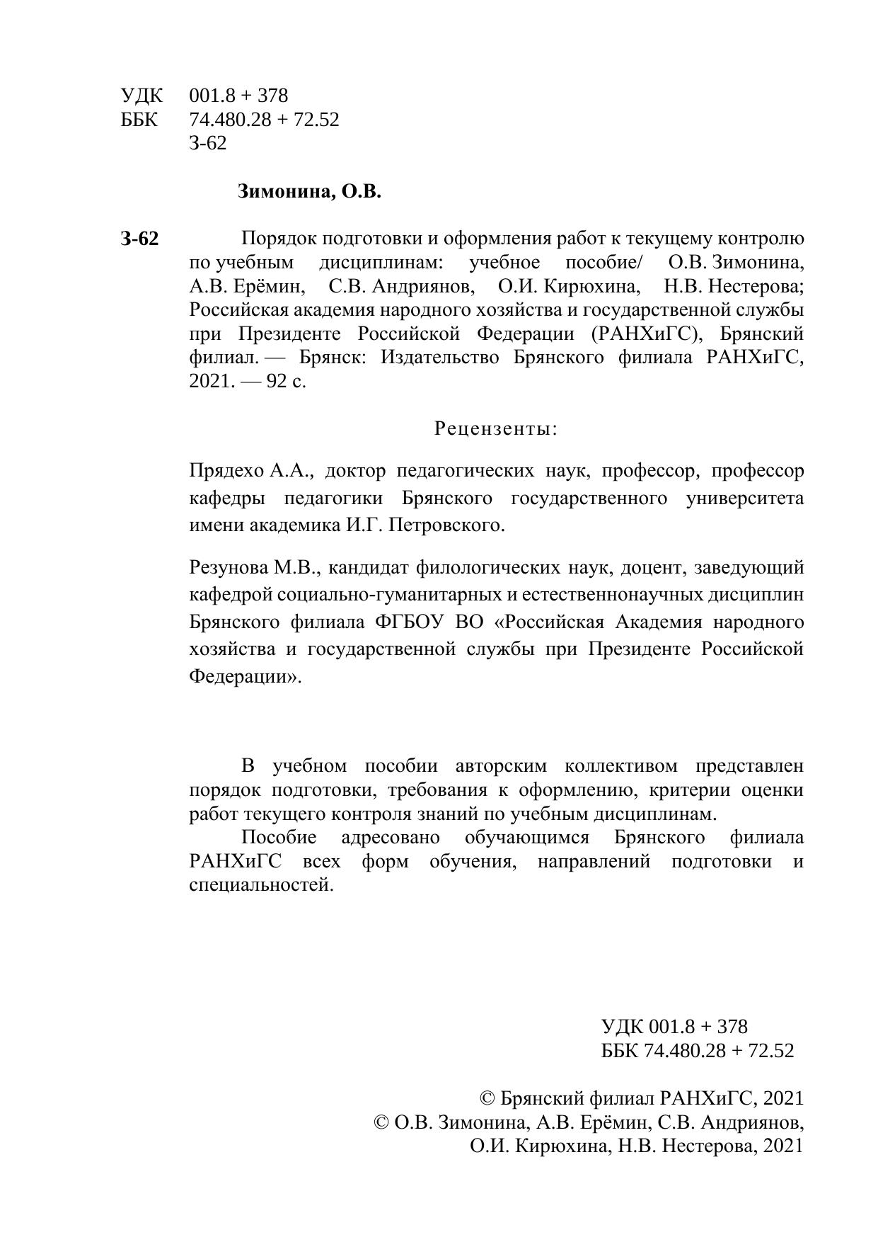 В учебном пособии авторским коллективом представлен порядок подготовки, требования к оформлению, критерии оценки работ текущего контроля знаний по учебным дисциплинам. Пособие адресовано обучающимся Брянского филиала РАНХиГС всех форм обучения, направлений подготовки и специальностей.