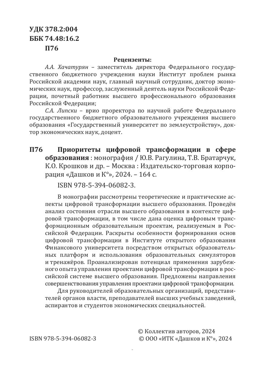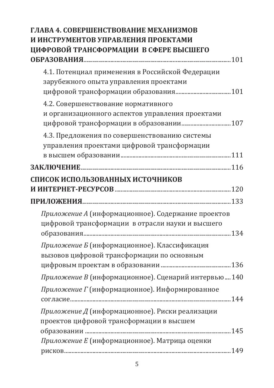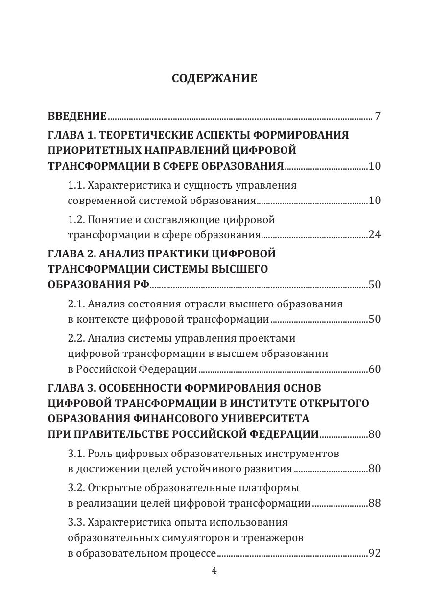 В монографии рассмотрены теоретические и практические аспекты цифровой трансформации высшего образования. Проведён анализ состояния отрасли высшего образования в контексте цифровой трансформации, в том числе дана оценка цифровым трансформационным образовательным проектам, реализуемым в Российской Федерации. Раскрыты особенности формирования основ цифровой трансформации в Институте открытого образования Финансового университета посредством открытых образовательных платформ и использования образовательных симуляторов и тренажёров. Проанализирован потенциал применения зарубежного опыта управления проектами цифровой трансформации в российской системе высшего образования. Предложены направления совершенствования управления проектами цифровой трансформации.