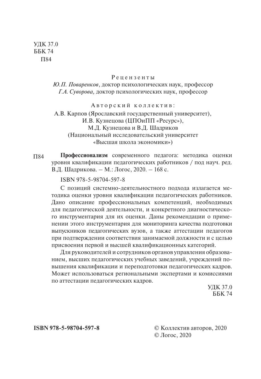 С позиций системно-деятельностного подхода излагается методика оценки уровня квалификации педагогических работников. дано описание профессиональных компетенций, необходимых для педагогической деятельности, и конкретного диагностического инструментария для их оценки. даны рекомендации о применении этого инструментария для мониторинга качества подготовки выпускников педагогических вузов, а также аттестации педагогов при подтверждении соответствия занимаемой должности и с целью присвоения первой и высшей квалификационных категорий. для руководителей и сотрудников органов управления образованием, высших педагогических учебных заведений, учреждений повышения квалификации и переподготовки педагогических кадров. Может использоваться региональными экспертами и комиссиями по аттестации педагогических кадров.