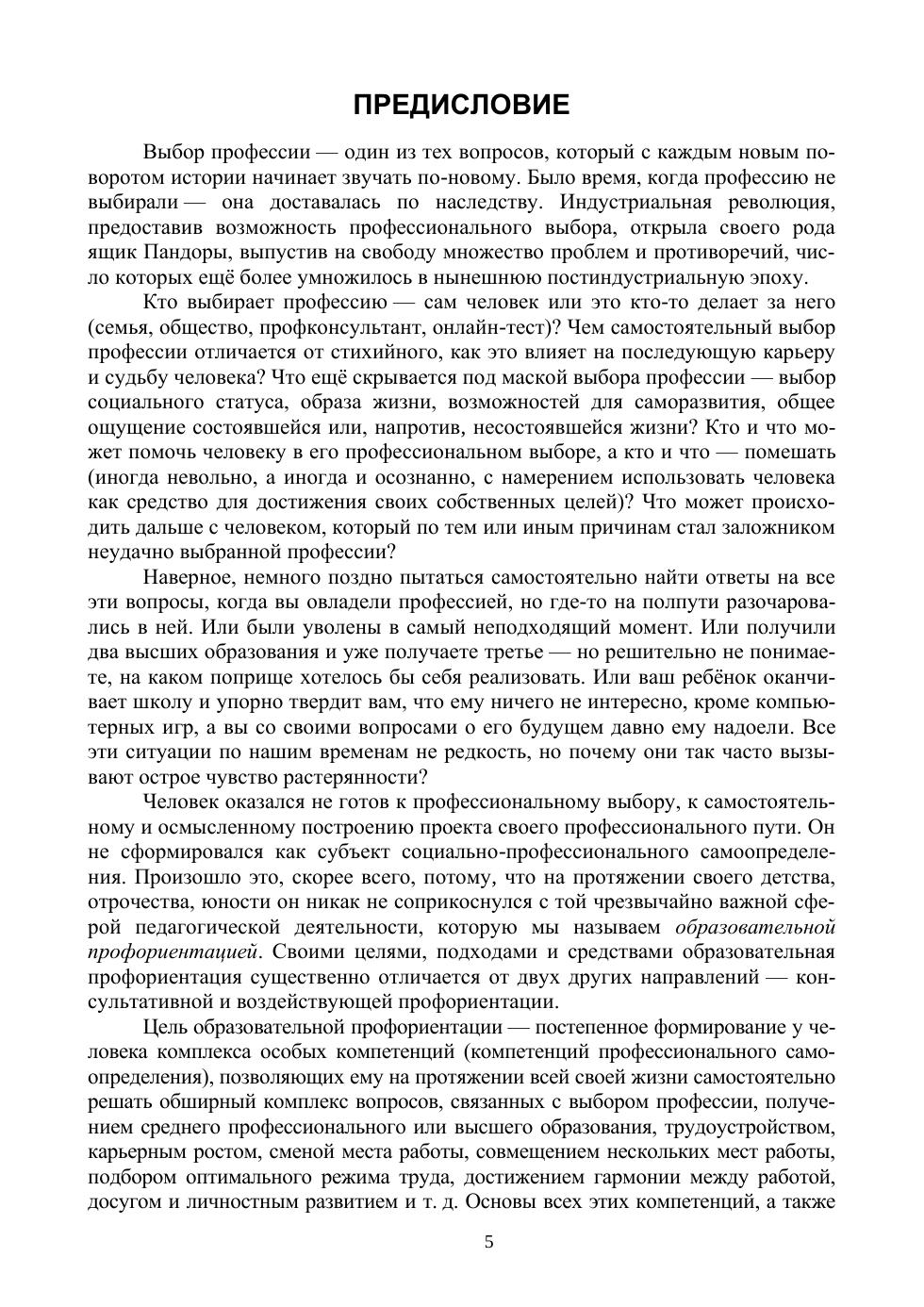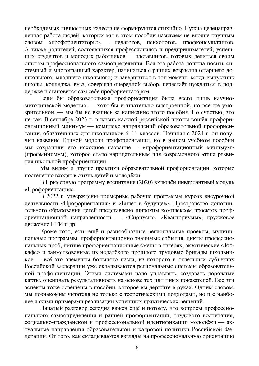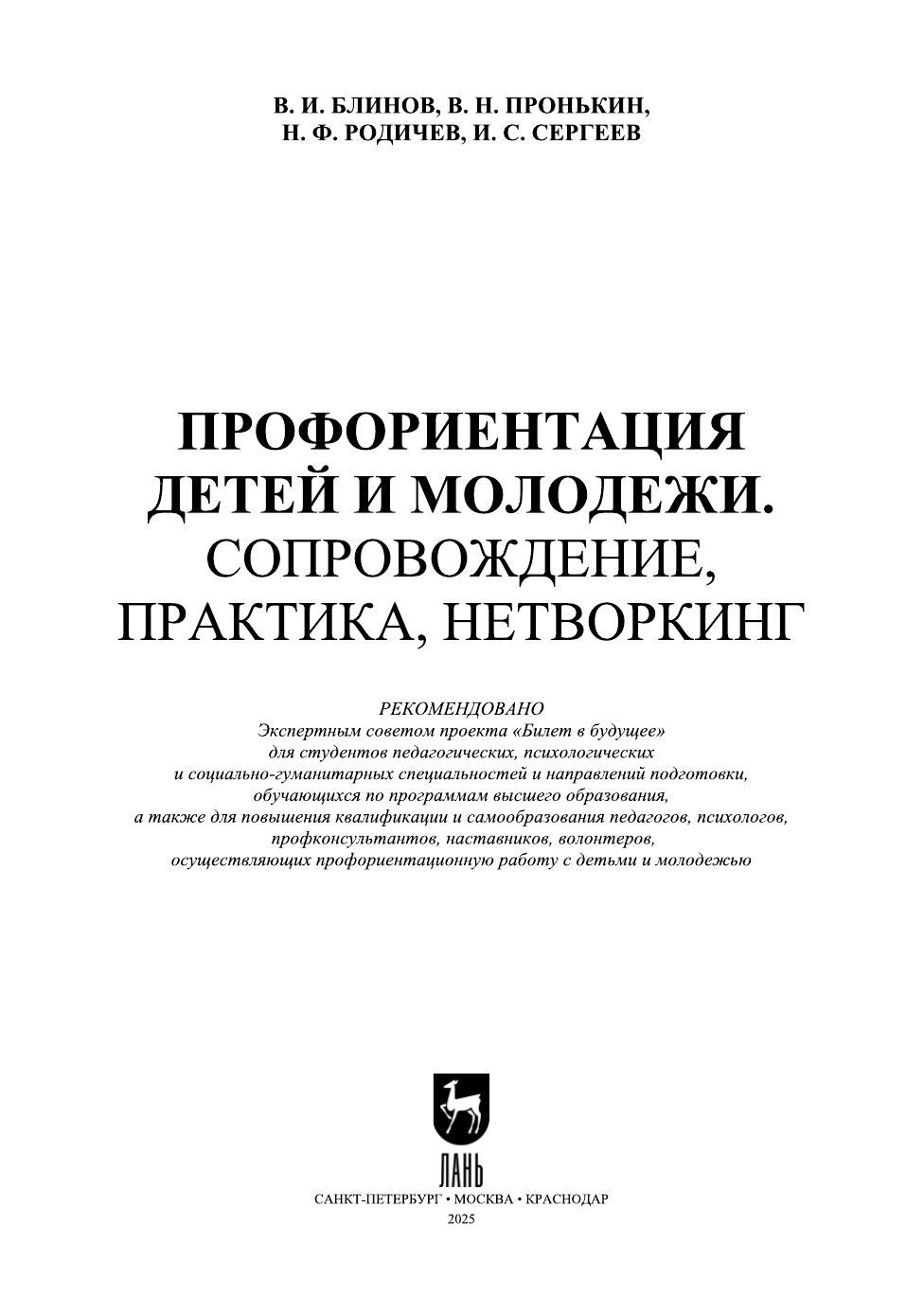 Авторы пособия предлагают доступное описание современного подхода к организации профориентационной работы с обучающимися — образовательной профориентации. На этот подход опирается Единая модель профориентации школьников 6–11 классов, введенная во всех школах России с 2023 г. Он может быть также использован для построения и развития региональных, отраслевых и корпоративных моделей профориентации детей и молодёжи, для совершенствования профориентационной работы в системах дошкольного, дополнительного, среднего профессионального, высшего образования. В учебном пособии представлены ключевые инструменты организации профориентационной деятельности учащихся, рассмотрены системы педагогического сопровождения профессионального выбора детей и подростков, приведены в качестве примера региональные и локальные практики, а также подходы к оценке их качества и результативности. Предложен методический аппарат для организации образовательного профориентационного процесса, в том числе с использованием цифровых средств. Учебное пособие адресовано студентам и преподавателям высших учебных заведений, реализующих педагогические и психологические направления подготовки. Кроме того, в условиях повышения востребованности профориентационных практик, оно также может быть полезно учителям, реализующим Единую модель профориентации школьников, ученым и аспирантам, работникам региональных систем дополнительного профессионального образования педагогов, другим педагогам-практикам.