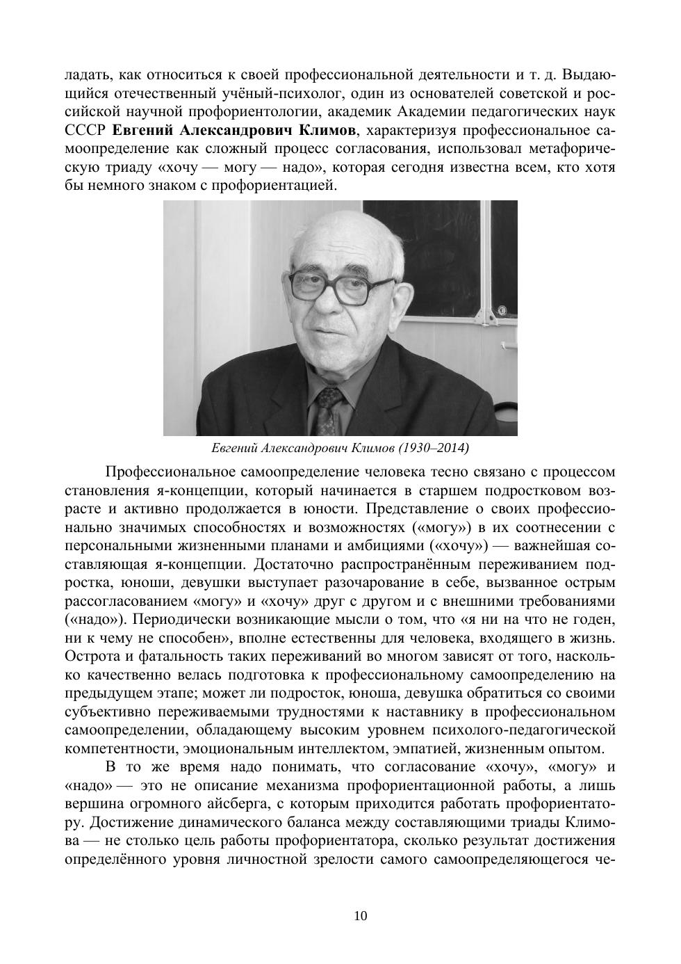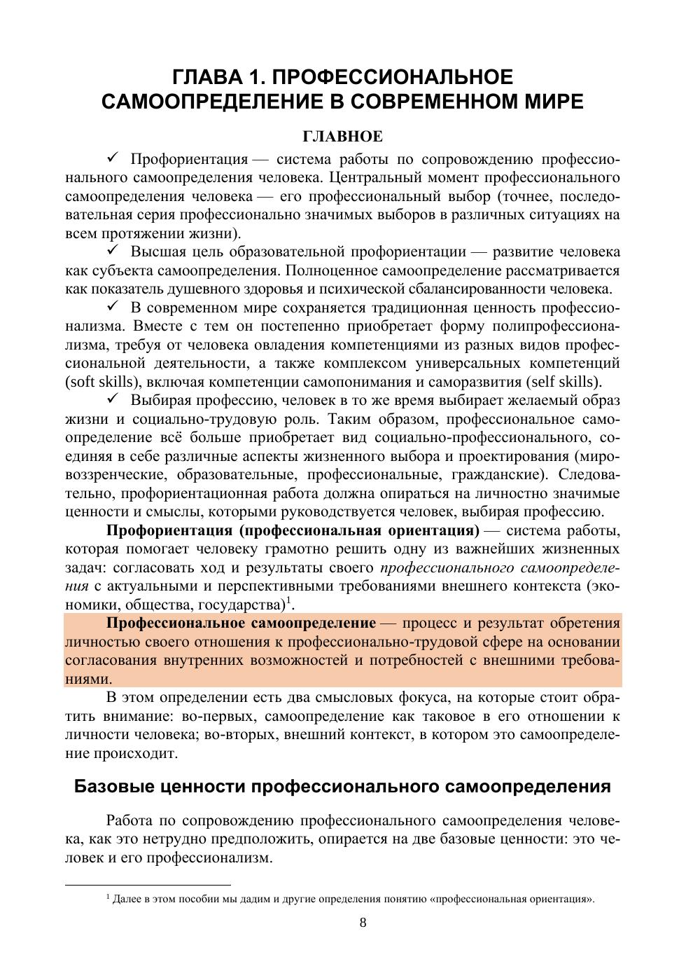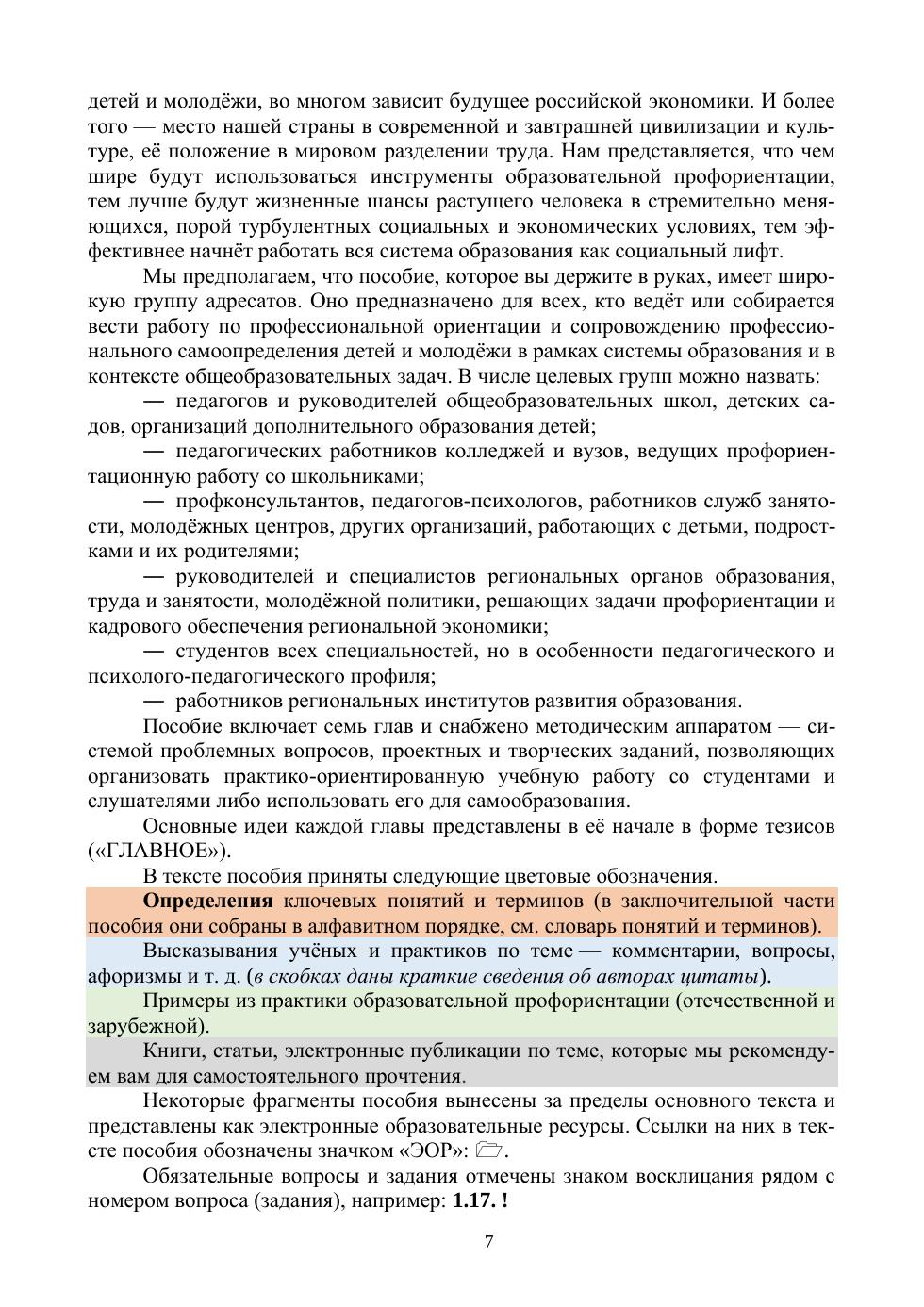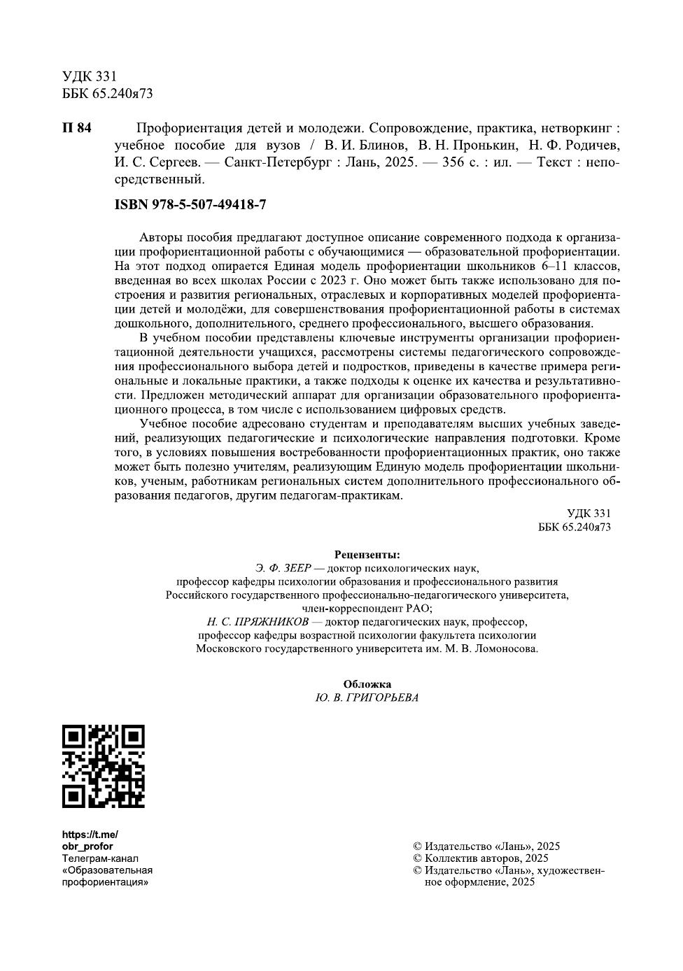 Авторы пособия предлагают доступное описание современного подхода к организации профориентационной работы с обучающимися — образовательной профориентации. На этот подход опирается Единая модель профориентации школьников 6–11 классов, введенная во всех школах России с 2023 г. Он может быть также использован для построения и развития региональных, отраслевых и корпоративных моделей профориентации детей и молодёжи, для совершенствования профориентационной работы в системах дошкольного, дополнительного, среднего профессионального, высшего образования. В учебном пособии представлены ключевые инструменты организации профориентационной деятельности учащихся, рассмотрены системы педагогического сопровождения профессионального выбора детей и подростков, приведены в качестве примера региональные и локальные практики, а также подходы к оценке их качества и результативности. Предложен методический аппарат для организации образовательного профориентационного процесса, в том числе с использованием цифровых средств. Учебное пособие адресовано студентам и преподавателям высших учебных заведений, реализующих педагогические и психологические направления подготовки. Кроме того, в условиях повышения востребованности профориентационных практик, оно также может быть полезно учителям, реализующим Единую модель профориентации школьников, ученым и аспирантам, работникам региональных систем дополнительного профессионального образования педагогов, другим педагогам-практикам.