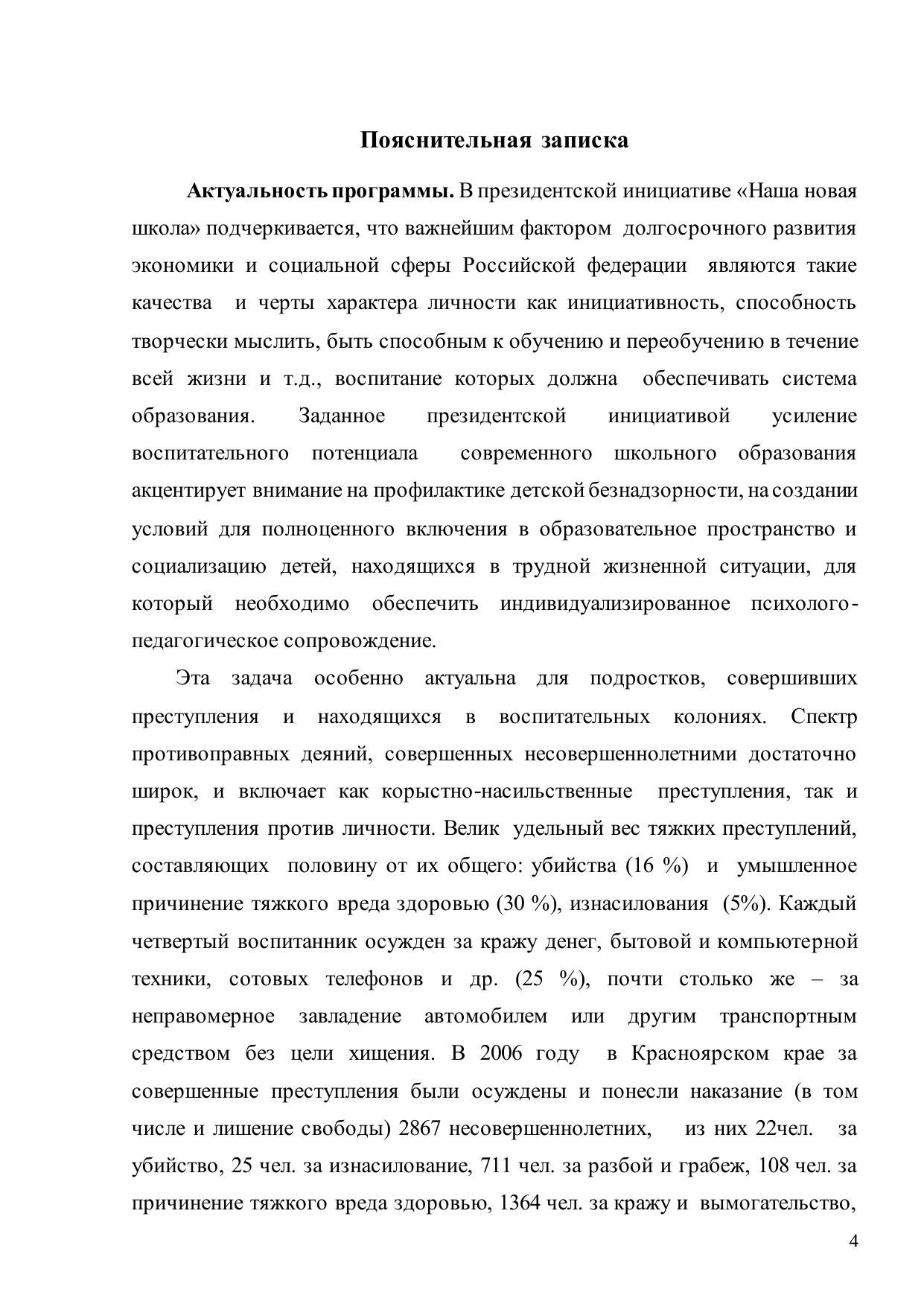 Программа предназначена для реализации в учебно-воспитательном процессе школ воспитательных колоний для несовершеннолетних. Содержание программы направлено на воспитание нравственных деятельно-волевых черт характера, преодоление вредных привычек и коррекцию характерологических дефектов у подростков в условиях изоляции В программе выделены критерии и показатели продвижения учащихся в характерологическом развитии. Предусмотрено использование специфических методов, ориентированных на расширение и изменение картины мира, развитие эмоционально- волевой саморегуляции, коррекцию поведения, актуализацию стремления к самовоспитанию. В приложении даны разработки занятий и фрагменты рабочей тетради по самовоспитанию характера.