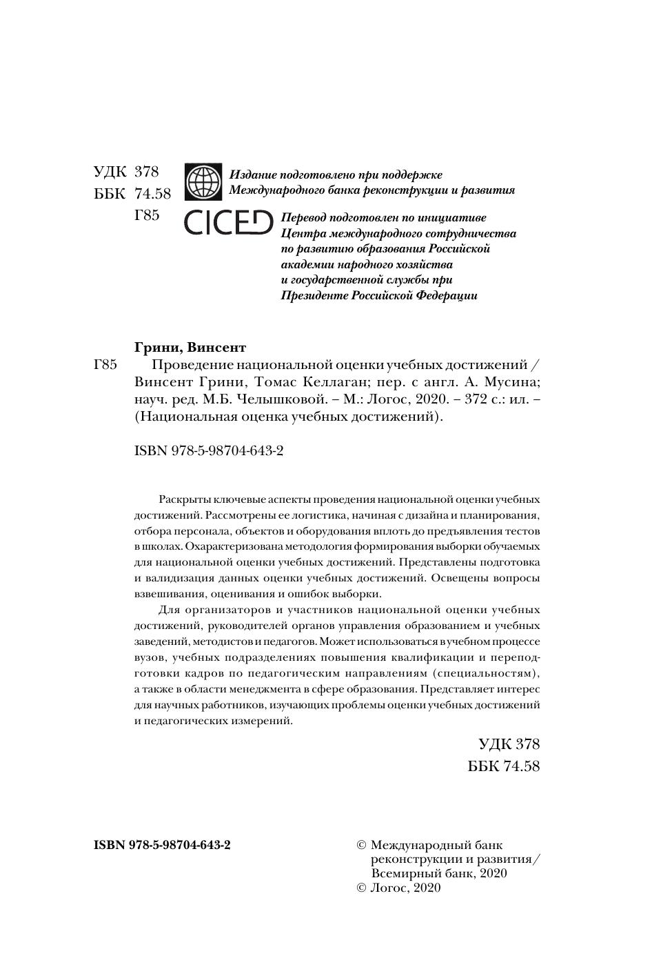Раскрыты ключевые аспекты проведения национальной оценки учебных достижений. Рассмотрены ее логистика, начиная с дизайна и планирования, отбора персонала, объектов и оборудования вплоть до предъявления тестов в школах. Охарактеризована методология формирования выборки обучаемых для национальной оценки учебных достижений. Представлены подготовка и валидизация данных оценки учебных достижений. Освещены вопросы взвешивания, оценивания и ошибок выборки. Для организаторов и участников национальной оценки учебных достижений, руководителей органов управления образованием и учебных заведений, методистов и педагогов. Может использоваться в учебном процессе вузов, учебных подразделениях повышения квалификации и переподготовки кадров по педагогическим направлениям (специальностям), а также в области менеджмента в сфере образования. Представляет интерес для научных работников, изучающих проблемы оценки учебных достижений и педагогических измерений.