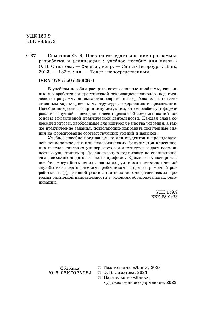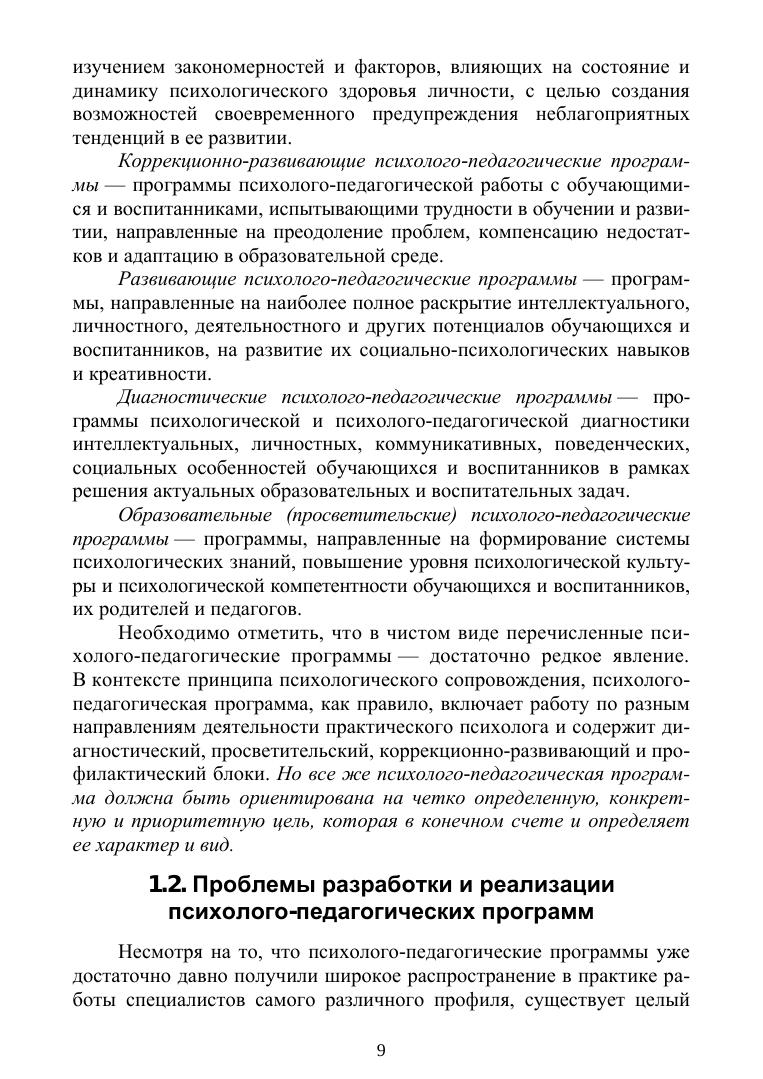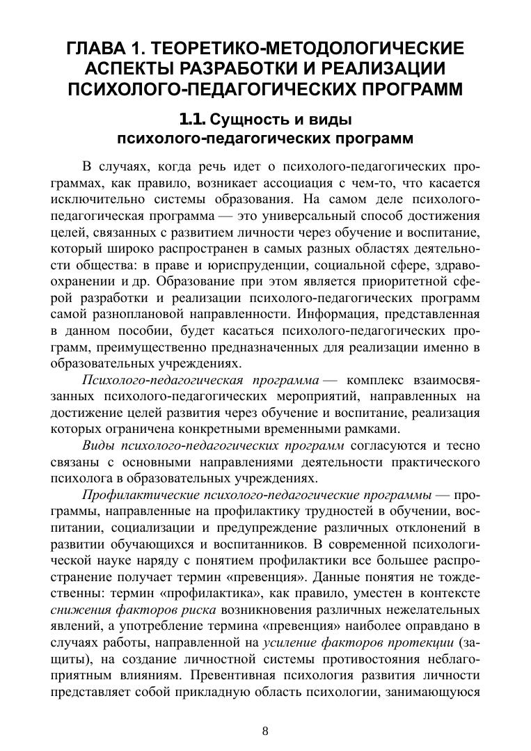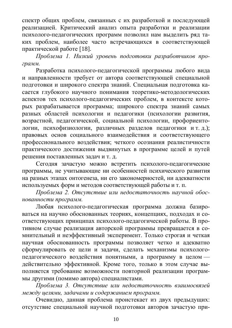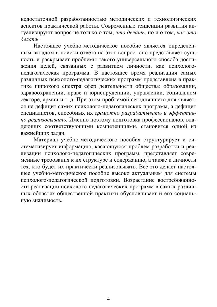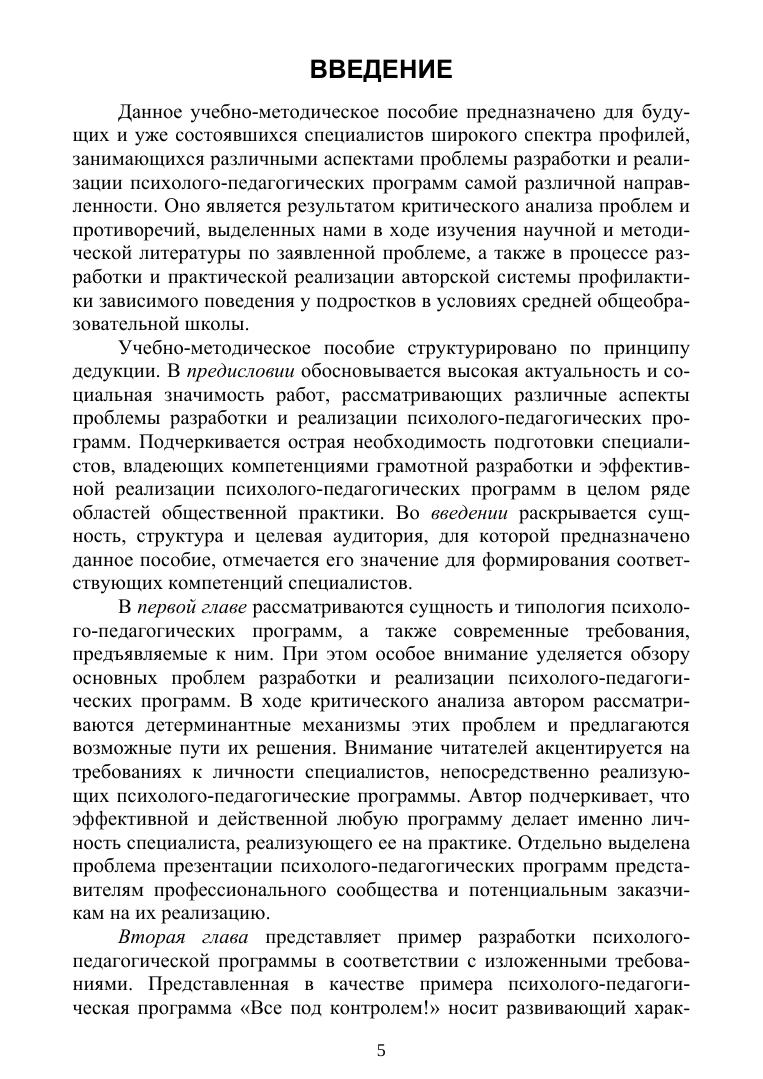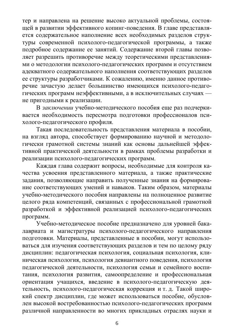 В учебном пособии раскрываются основные проблемы, связанные с разработкой и практической реализацией психолого-педагогических программ, описываются современные требования к их качественным характеристикам, структуре, содержанию и презентации. Пособие построено по принципу дедукции, что способствует формированию научной и методологически грамотной системы знаний как основы эффективной практической деятельности. Каждая глава содержит вопросы, необходимые для контроля качества усвоения, а также практические задания, позволяющие направить полученные знания на формирование соответствующих умений и навыков. Учебное пособие предназначено для студентов и преподавателей психологических или педагогических факультетов классических и педагогических университетов и институтов и дает возможность осуществлять профессиональную подготовку по специальностям психологопедагогического профиля. Кроме того, материалы пособия могут быть использованы сотрудниками психологической службы или педагогическими работниками с целью грамотной разработки и эффективной реализации психологопедагогических программ различной направленности в условиях образовательных организаций.