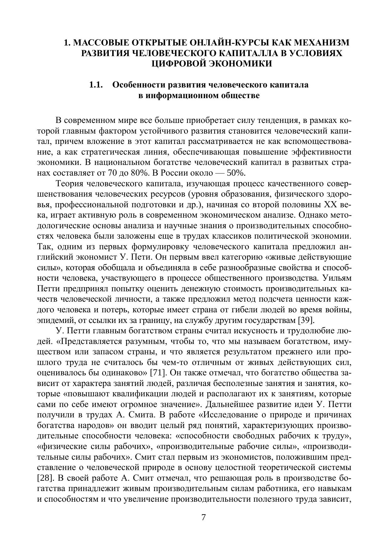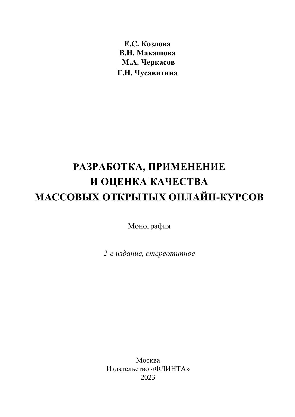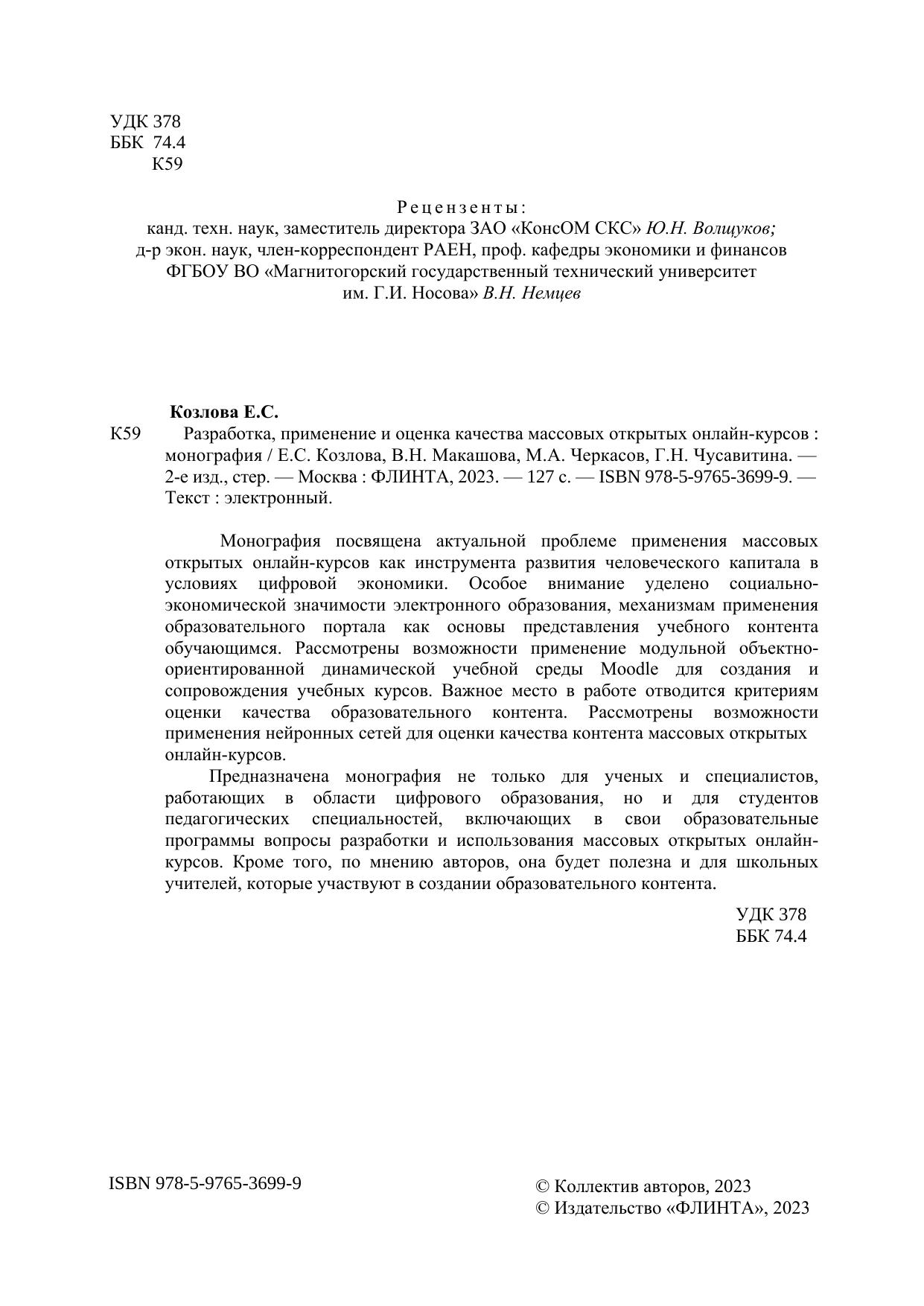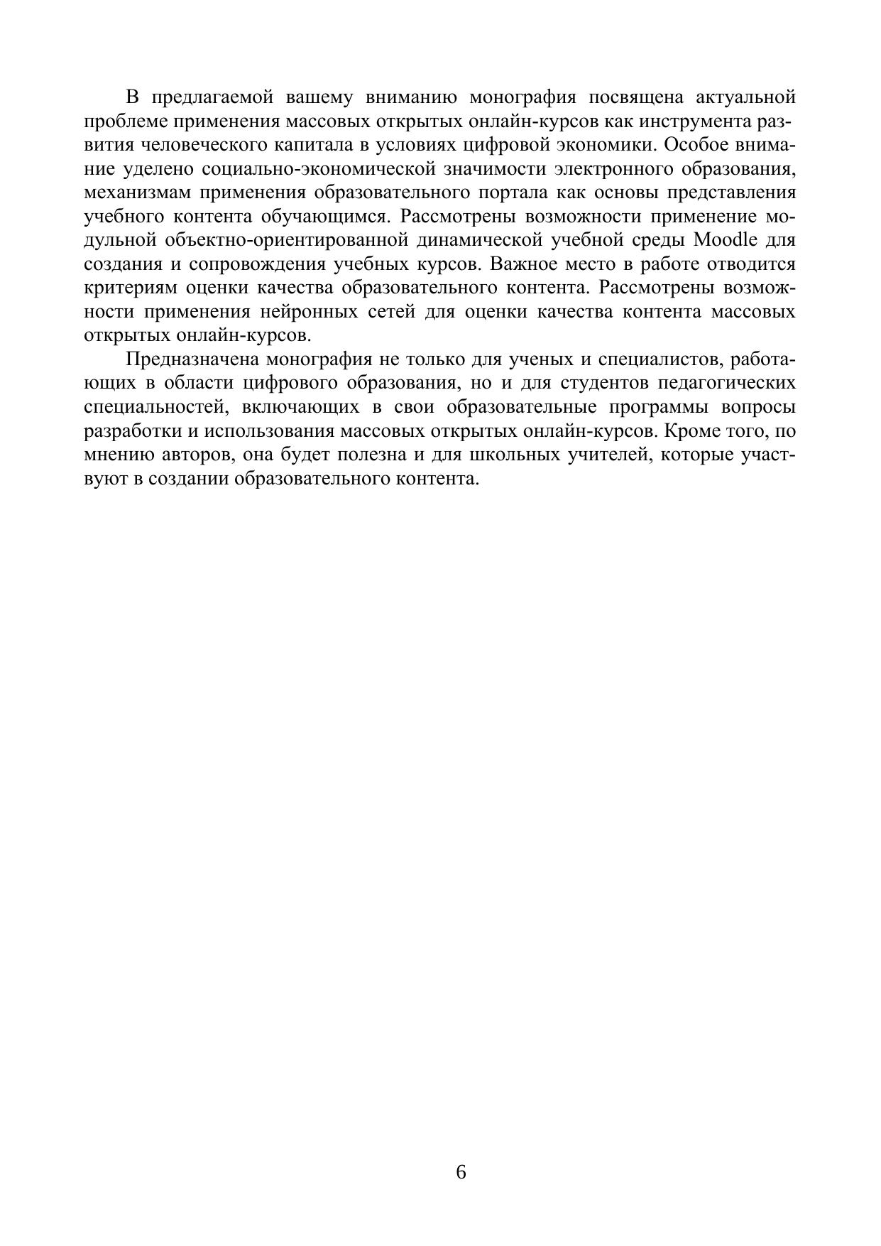 Монография посвящена актуальной проблеме применения массовых открытых онлайн курсов как инструмента развития человеческого капитала в условиях цифровой экономики. Особое внимание уделено социально-экономической значимости электронного образования, механизмам применения образовательного портала как основы представления учебного контента обучающимся. Рассмотрены возможности применение модульной объектно-ориентированной динамической учебной среды Moodle для создания и сопровождения учебных курсов. Важное место в работе отводится критериям оценки качества образовательного контента. Рассмотрены возможности применения нейронных сетей для оценки качества контента массовых открытых онлайн курсов. Предназначена монография не только для ученых и специалистов, работающих в области цифрового образования, но и для студентов педагогических специальностей, включающих в свои образовательные программы вопросы разработки и использования массовых открытых онлайн курсов. Кроме того, по мнению авторов, она будет полезна и для школьных учителей, которые участвуют в создании образовательного контента.